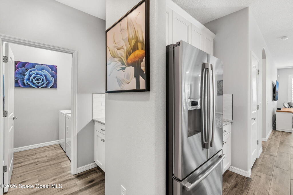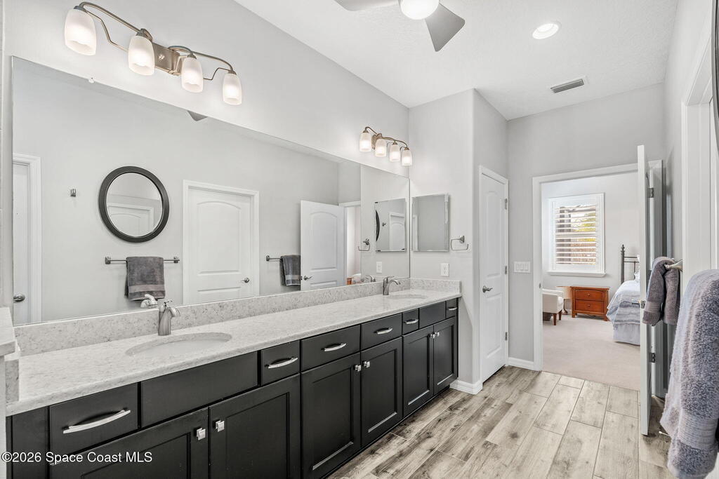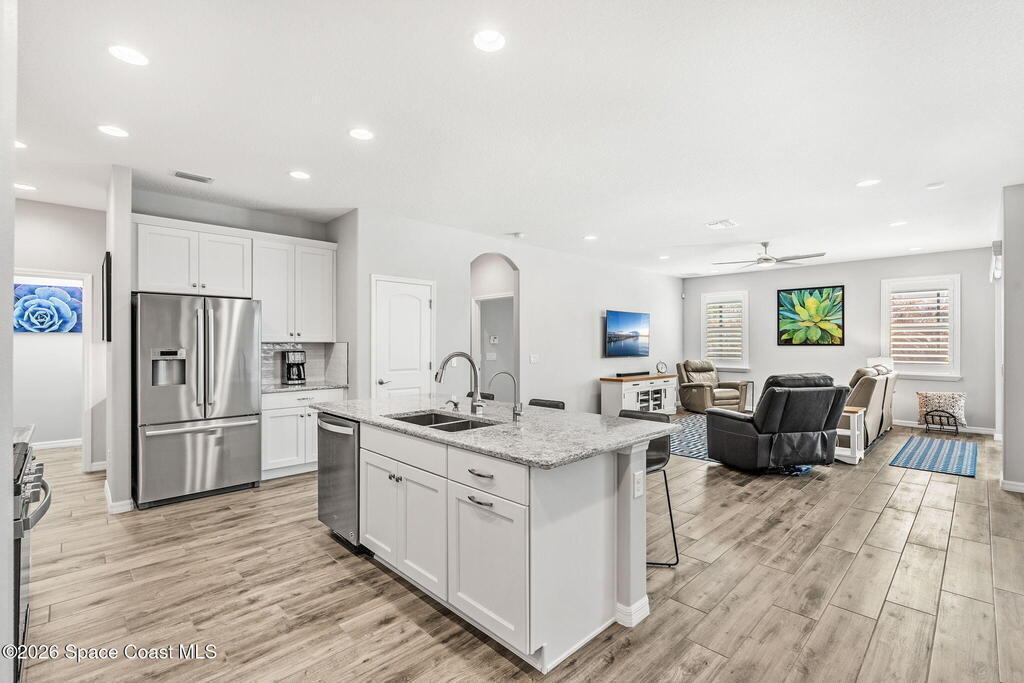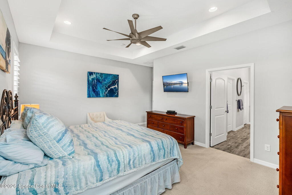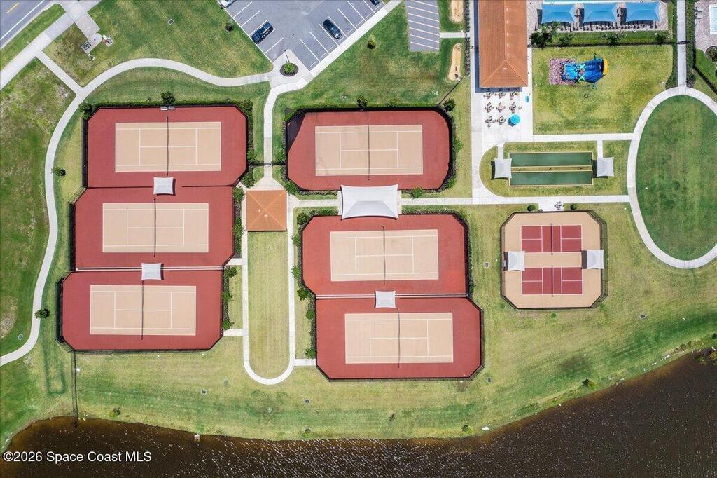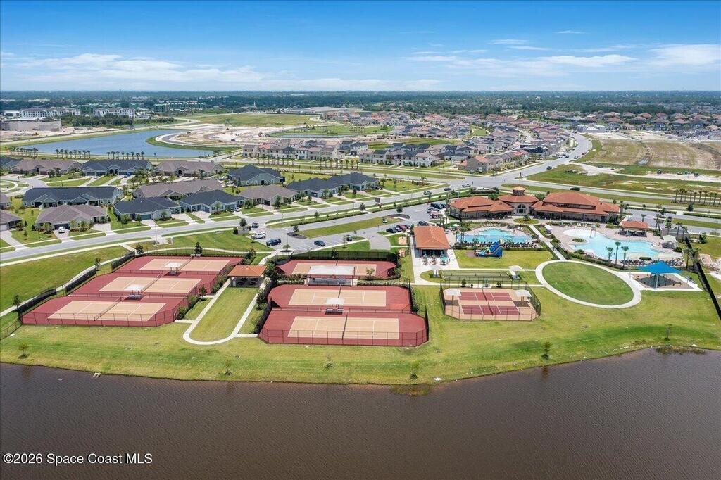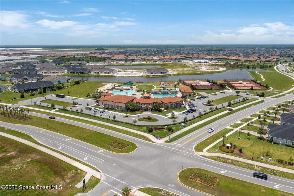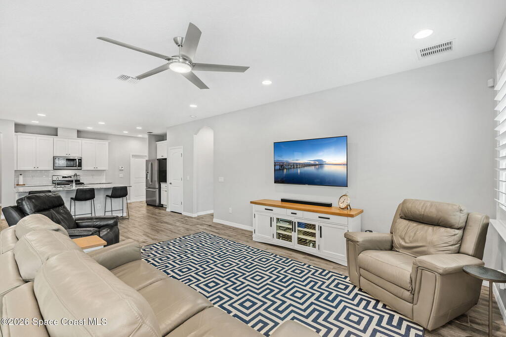 Welcome to Trasona in West Viera, where everyday living feels a little more like a getaway. This popular Siesta floor plan offers 4 bedrooms, 2 bathrooms, and a rare 3-car garage across 2,154 square feet of thoughtfully designed space that just flows.From the moment you walk in, it feels easy. Natural light pours through plantation shutters, the layout is open without feeling overwhelming, and every space has a purpose. The kitchen is truly the heart of the home, with quartz countertops, plenty of cabinet space, and extra storage in the laundry room. Whether you're hosting friends, helping with homework at the counter, or just enjoying a quiet night in, this space works for real life. The primary suite offers a calm, private retreat, complete with custom closet upgrades that make staying organized simple. Throughout the home, you'll find practical upgrades like impact windows and accordion shutters for patio and a tankless gas water heater that add both comfort and peace of mind.