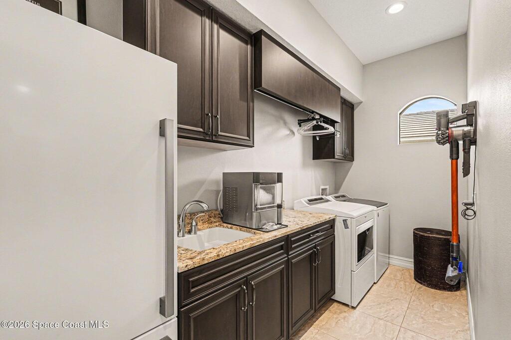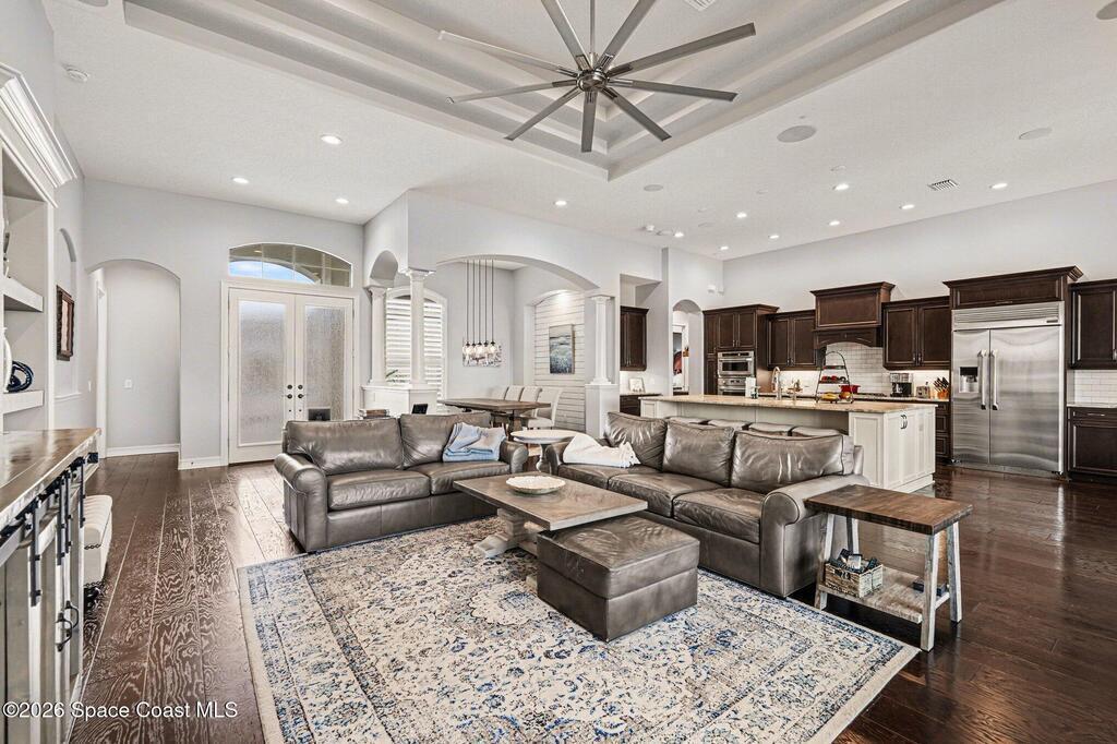 Welcome Home to this stunning custom-built luxury home. This home is a blend of contemporary elegance with timeless craftsmanship. As soon as you enter through the double doors, you'll appreciate the open floorplan that beams with bright light, making the space warm and cozy. The gourmet kitchen greets you with a large island, GE Monogram stainless-steel appliances, and a custom bar area. A spacious great room flows effortlessly to the covered lanai and private pool retreat, complete with outdoor kitchen. The seamless indoor-outdoor living space is perfect for both every day living and entertaining. The primary suite is a true sanctuary, boasting a spa-inspired bath with soaking tub, dual vanities, and his and hers closets. Additional features include a home office/5th bedroom, flex space off the 4th bedroom and a three-car garage. This home is also nestled along the first fairway of Duran--one of Brevard's premier golf courses. Fairway Lakes at Viera is a pristine neighborhood with