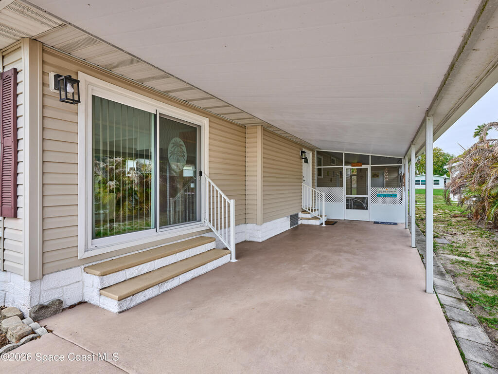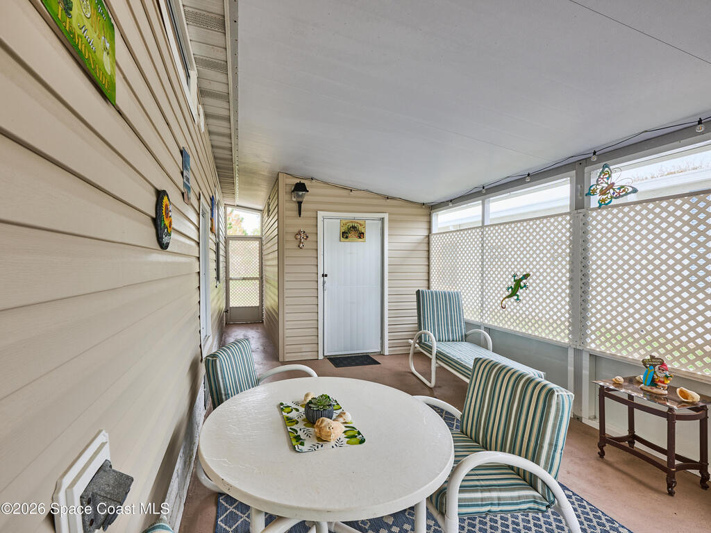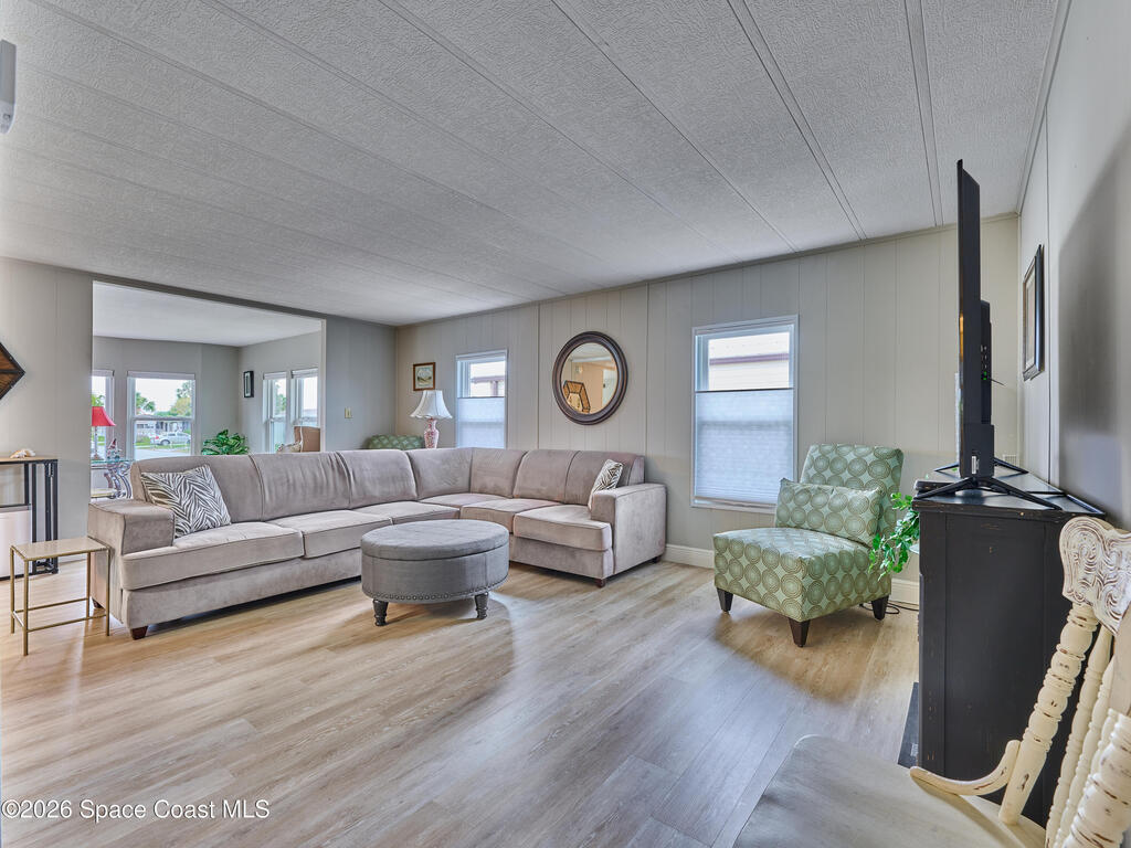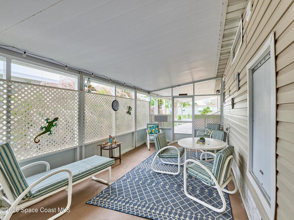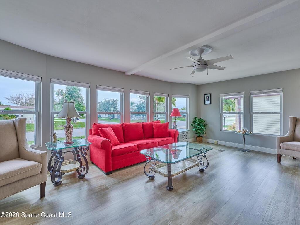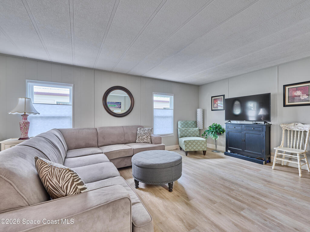 Beautifully updated home offering spacious, relaxed living with abundant natural light streaming through multiple large windows. Enjoy stylish updated LPV flooring throughout, complemented by a durable metal roof, updated windows, and remodeled showers. Kitchen includes stainless steel appliances and a wonderful backsplash. The open, airy layout provides generous living spaces perfect for both entertaining and everyday comfort. A screened porch invites you to unwind and enjoy Florida's breezes year-round.Located in the vibrant Barefoot Bay community, residents enjoy access to gated private oceanfront beach with restroom, showers & picnic tables, golf courses, swimming pools, tennis and pickleball courts, clubhouse, fitness center, boat launch, fishing pier, and a full calendar of social activities. A perfect blend of comfort, updates, and lifestyle awaits!