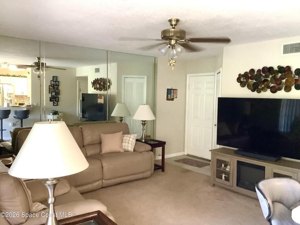 Welcome to Sunrise Landing featuring this lovely 3 bedroom, 2 bath, first floor, end unit. Relax on your very private screened in porch. Walk right outside for a perfect front row seat to rocket launches and dolphins playing in the Indian River. The kitchen features granite countertops with beautiful cabinetry and lots of storage. There is also a wet bar cabinet w/granite. Newer HVAC (2024). Residents at Sunrise Landing enjoy access to a range of amenities including 2 pools w/hot tubs, 2 saunas, 2 fishing piers, tennis/pickleball courts, shuffleboard, vehicle car wash area and more. HOA includes cable TV, internet, water, trash and ground maintenance. Located not far from beaches, Kennedy Space Center, Port Canaveral, shopping (Publix/Walgreens across the street), restaurants and a short 40 minute drive to Orlando International Airport. Great opportunity to live the enjoyable Space Coast life, perfect investment or snowbird retreat.