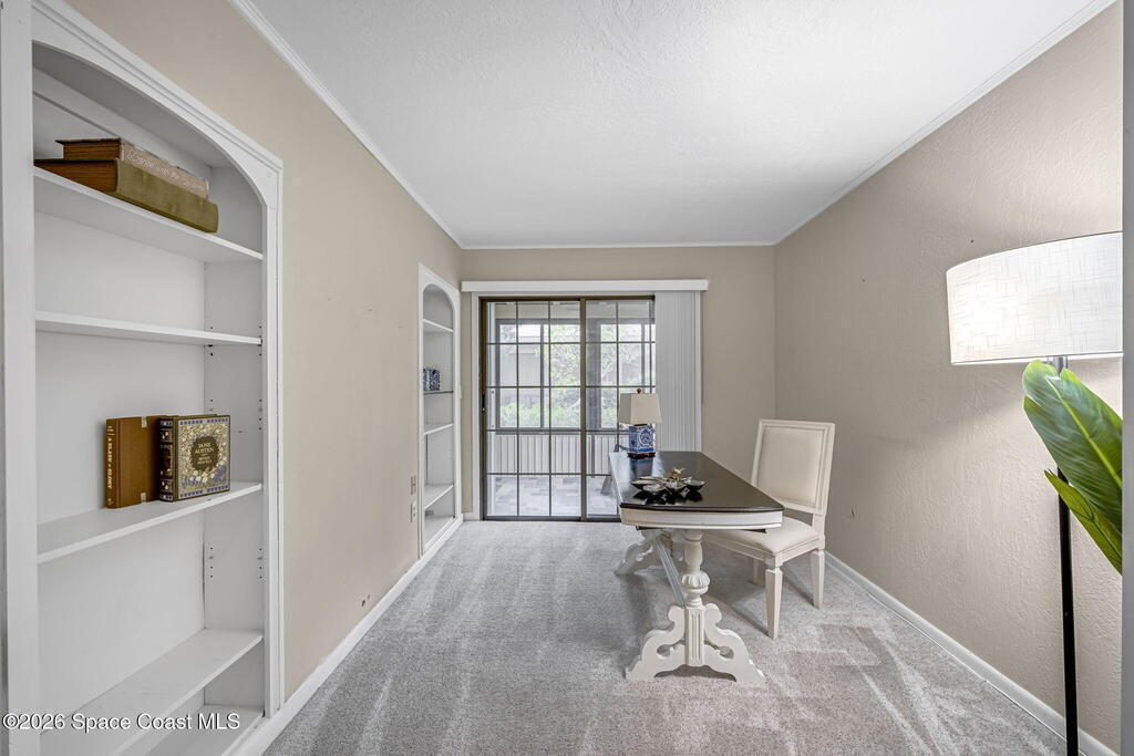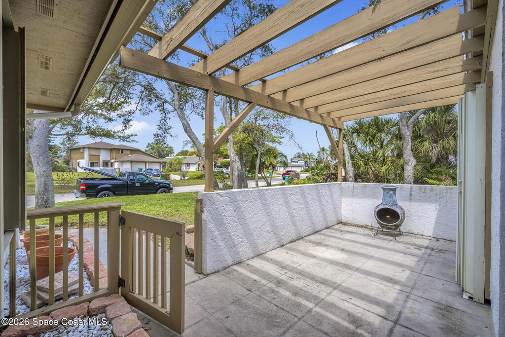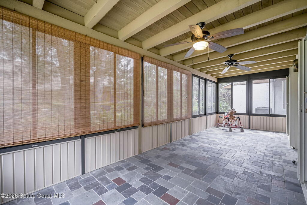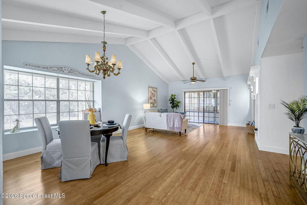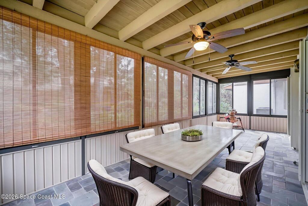Welcome to Quail Ridge Townhomes! This well-maintained half duplex has a very large enclosed porch area in the back as well as a large front patio. The entry and kitchen feature tile flooring. Bamboo flooring flows throughout the main living areas, with the comfort of carpet in the bedrooms and office area.Soaring cathedral ceilings with exposed beams create a bright, open feel, complimented by a built-in entertainment feature in the living room. One of the bedrooms include custom built-in bookshelves, perfect for work or study. More highlights include a 2-car garage, a new roof installed May 2025, and AC 2023, water heater 2020. Enjoy community amenities including a clubhouse, pool, and tennis courts. The storage area can even store your boat, trailer, OR RV. Conveniently located across from Wickham Park, offering community events, walking trails, sports fields, and more!