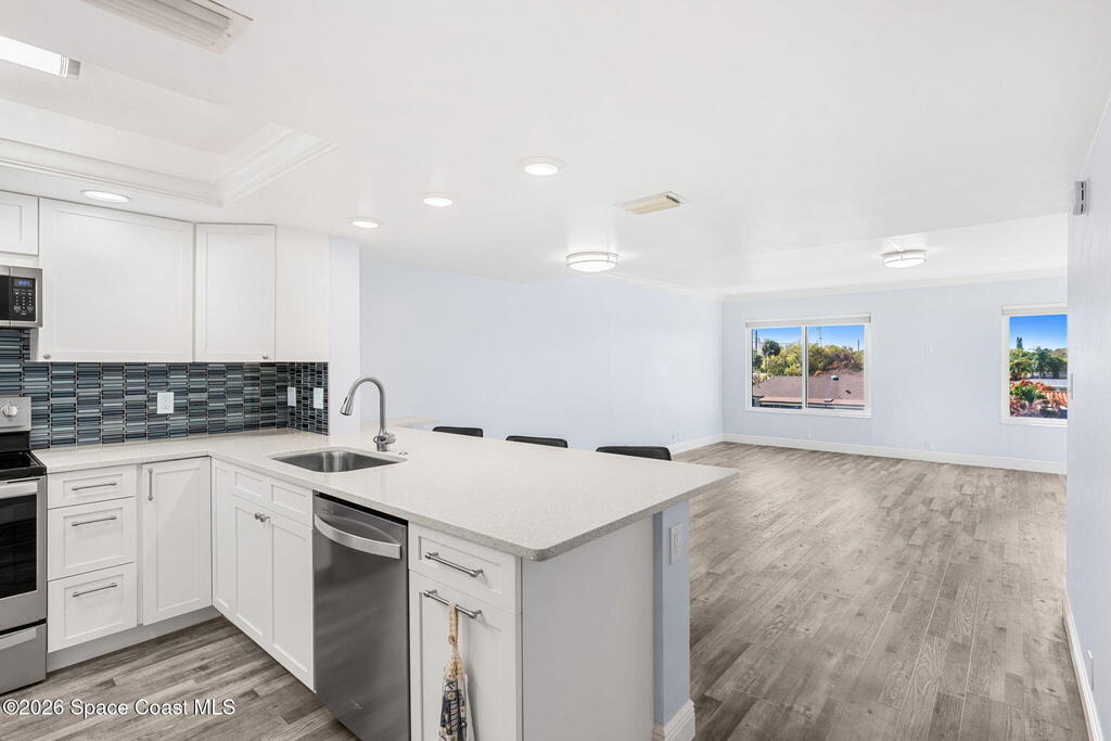 Take in breathtaking western sunset views from this updated3/2 penthouse condo, offering the perfect blend of comfort, style, and waterfront living. Included is a deeded boat slip accommodating up to a 23-foot boat, making it ideal for boating enthusiasts. New impact windows, sliders 2018, milestone and SIRS completed by HOA. Recent updates include custom frameless soft close kitchen cabinets, Quartz surfaces ,stainless steel appliances, updated vinyl plank flooring, custom glass shower enclosures in both bathrooms, a new A/C (2022), new hot water heater (2024). The washer and dryer have also been updated and may be stacked for added space and efficiency. This is a rare chance to own a penthouse retreat with stunning sunset views and direct boating convenience. Condo complex also offers a heated inground pool and deeded shared garage space.