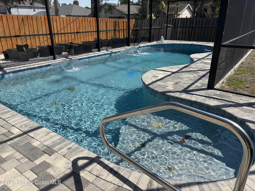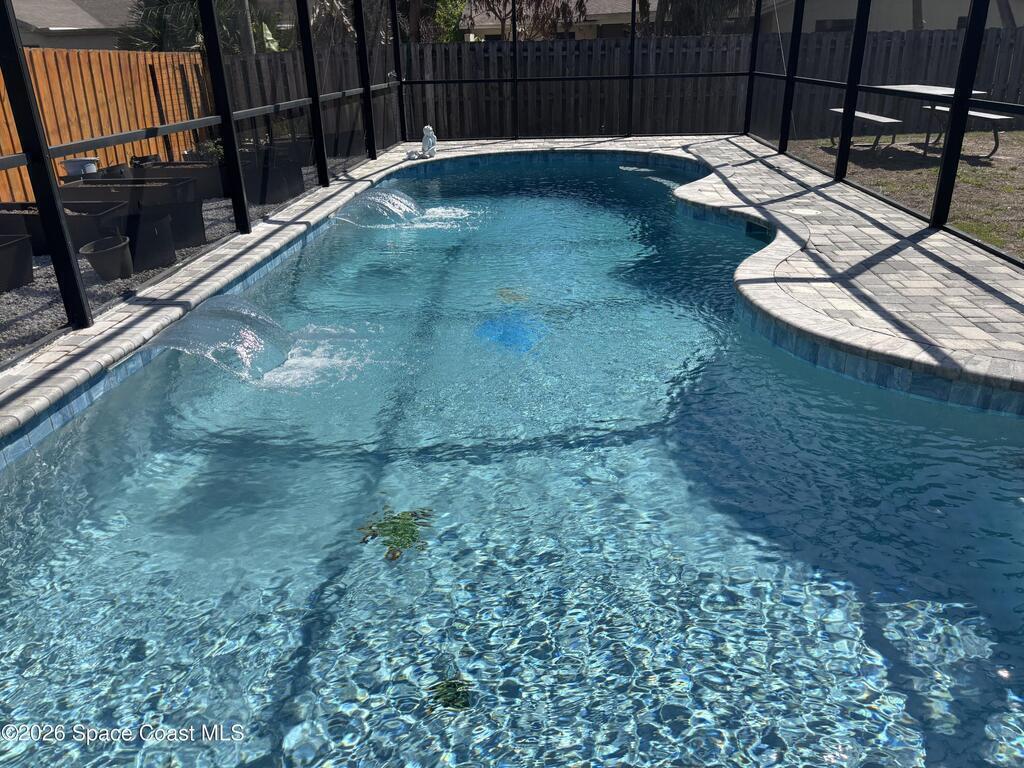 Beautiful pool home ready for its new owners! 2025 Roof. Step through the elegant glass front entry door and instantly feel at home. The spacious, updated floor plan features soaring vaulted ceilings and lots of natural light, creating a bright and inviting atmosphere. The designer kitchen truly stands out showcasing 42'' cherry-glazed cabinets with crown molding, stunning granite countertops and a large island with added storage. Enjoy conveniences like soft-close hinges and a newer four-piece stainless steel appliance package featuring a convection oven. Additional highlights include premium laminate flooring in the living, dining and family rooms, decorative plant shelves, an arched walkway, interior laundry room complete with sink and a surveillance and alarm system. Step outside and embrace Florida living at its best. Cool off in the screened-in, in-ground pool or unwind on the truss-covered porch while listening to the soothing waterfalls. City water/sewer, fully fenced yard.