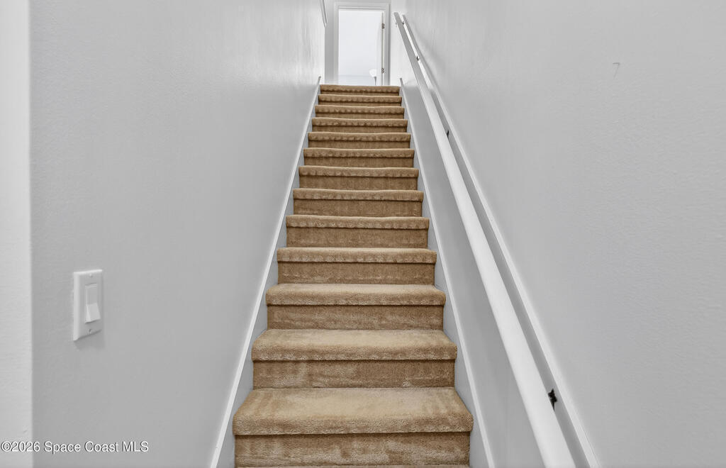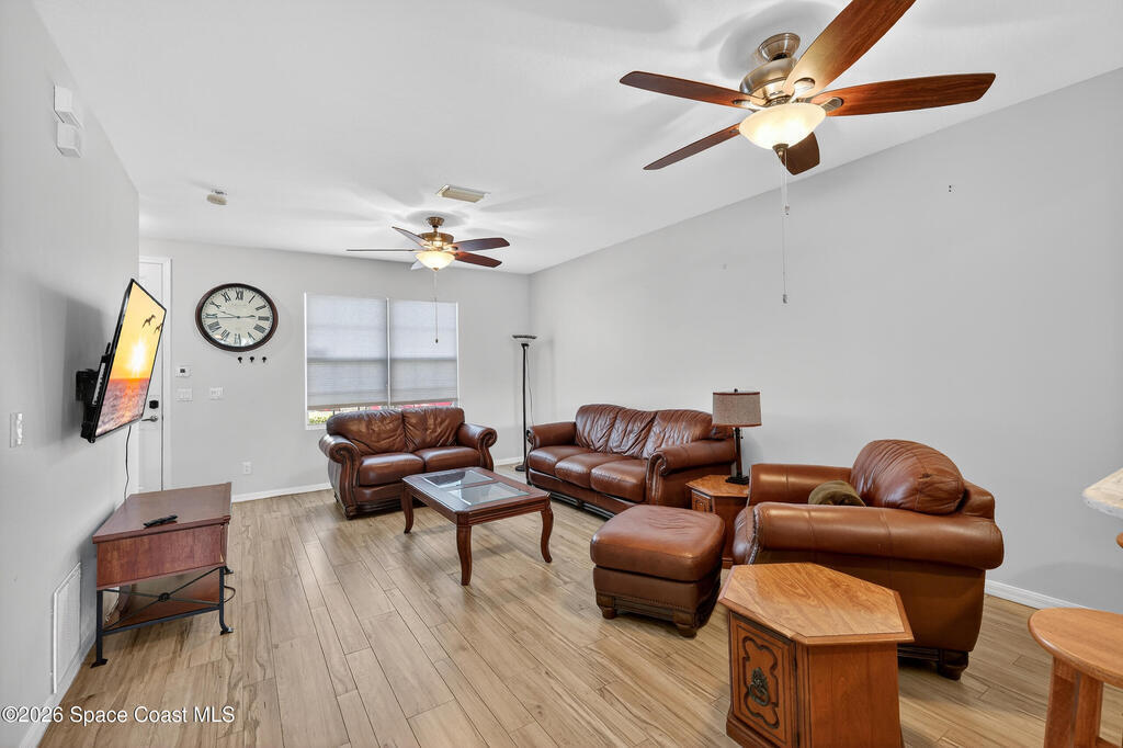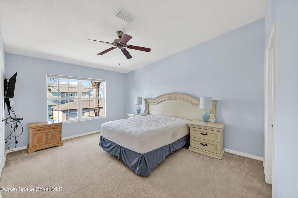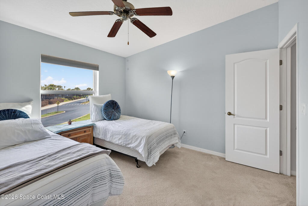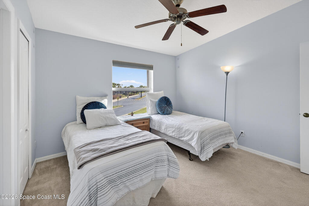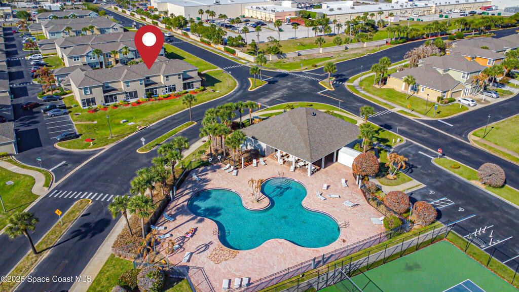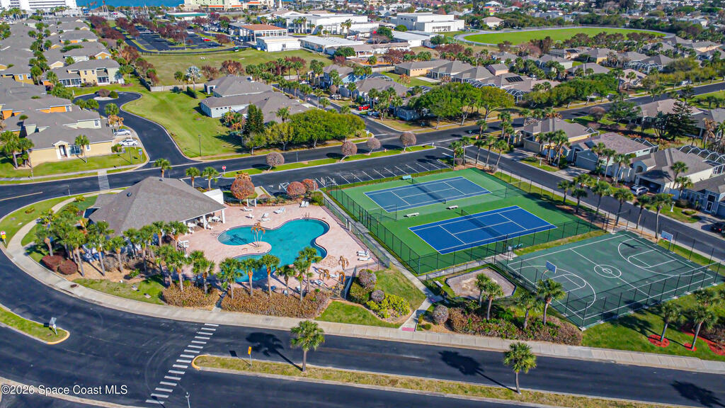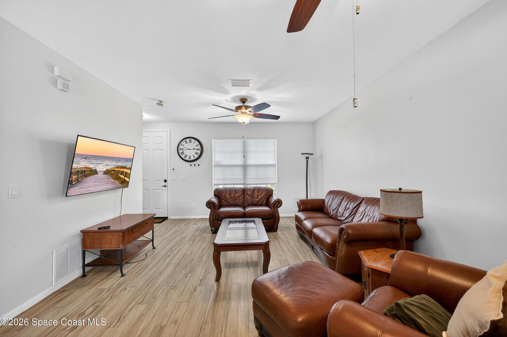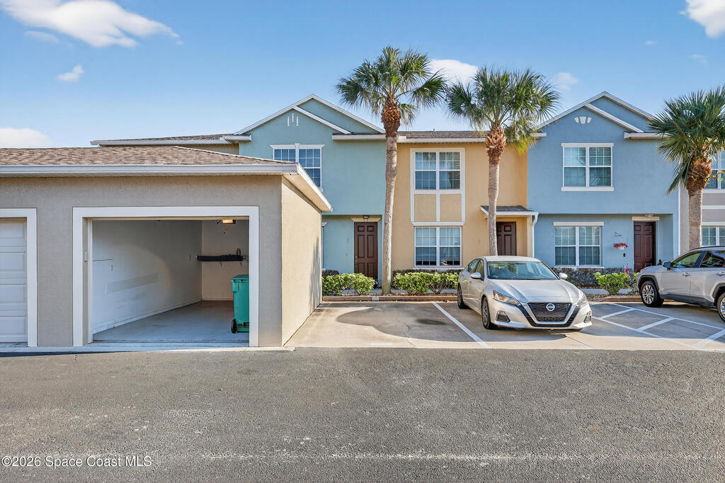 Beautifully maintained two-story townhome in gated Oceanside Village with open-concept living area and tile flooring throughout main living areas. Features include a screened-in rear patio with clubhouse view, detached garage, and guest parking. The home offers a modern kitchen with quartz countertops and updated bathroom finishes. Located in a gated community with resort-style amenities including pool, clubhouse, tennis courts, and playground, with HOA covering roof, exterior, landscaping, and insurance. Beachside location just minutes to the ocean with convenient access from both Eau Gallie Blvd and A1A. Close to restaurants and shopping including Texas Roadhouse, Chipotle, Starbucks, and Walmart. Currently the only available unit in Oceanside Village.
