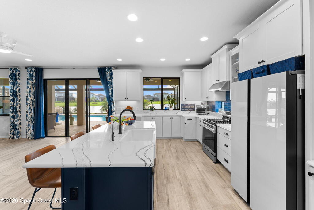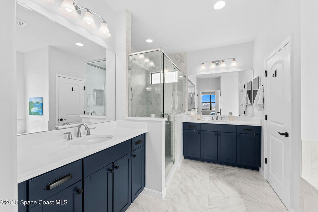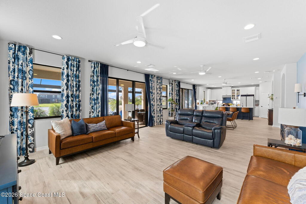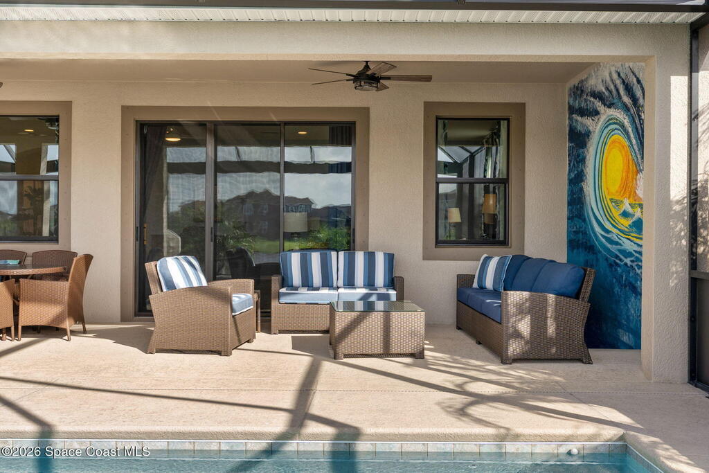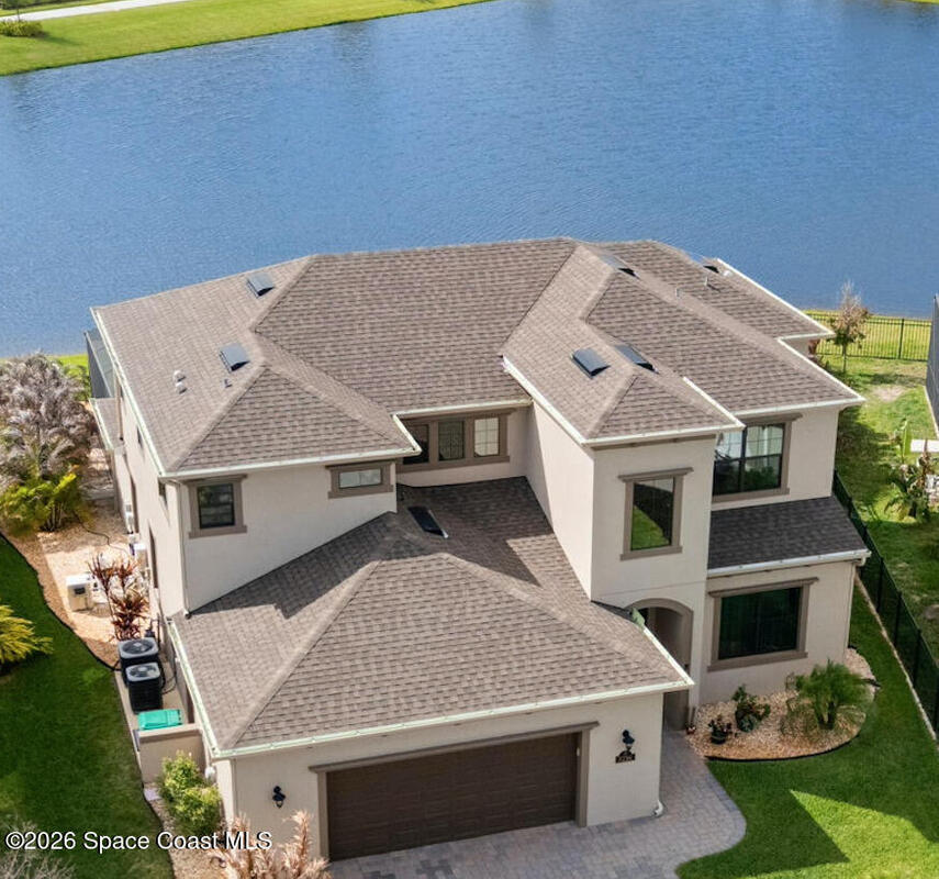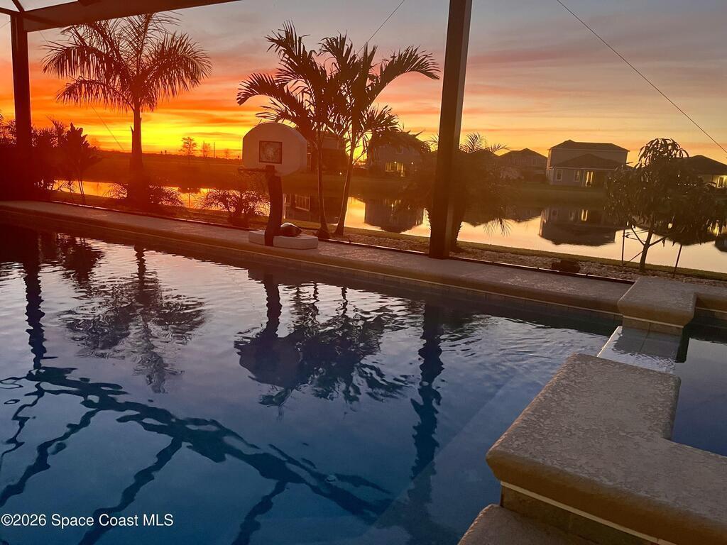 Rare 2023 Viera pool home with epic lake & sunset views. 50' x 11' covered patio w/privacy walls give a cozy view through the panoramic pool screen. 27.5ft x 13ft salt water pool & 8x10 hot tub enhanced with 400k BTU gas heater. Natural gas stove, outdoor grill & tankless water heater. 2 triple sliding glass doors show the shimmering turquoise pool, flowing large pond & golden sunsets into the kitchen, dining & living room areas. 20 yards of river rock surround the home. All tile on 1st floor. 2nd floor is hardwood & tile. Oversized 2 car garage for your golf cart or home gym. Water filtration, softening system & reverse osmosis. Miles of wide sidewalk for golf carts, jogging & walking to enjoy nature. No hurricane shutters needed for 2nd floor & front impact rated windows.