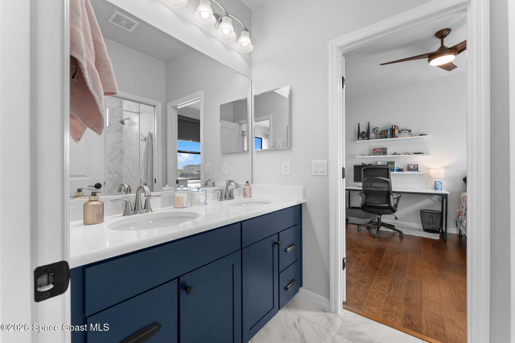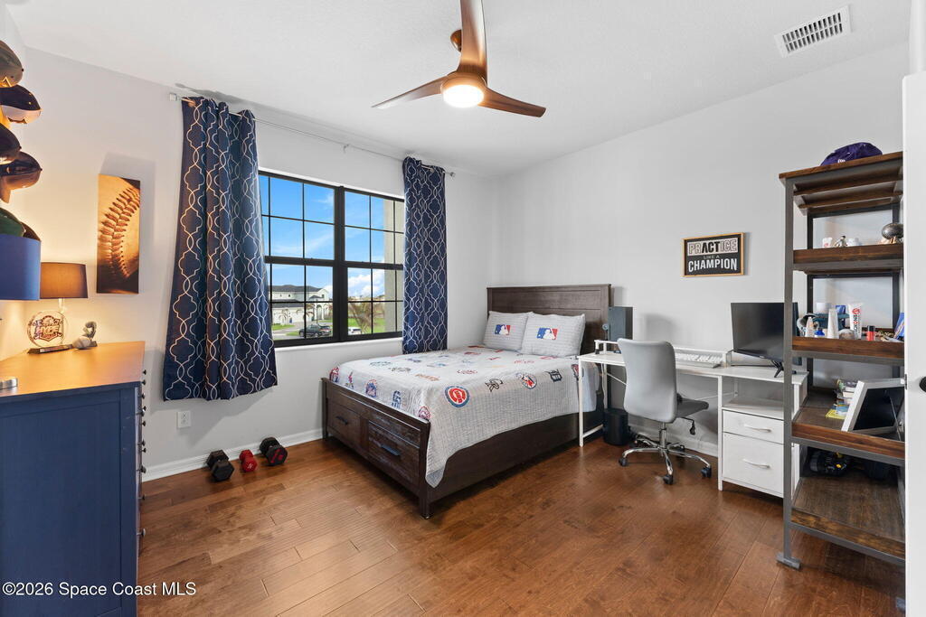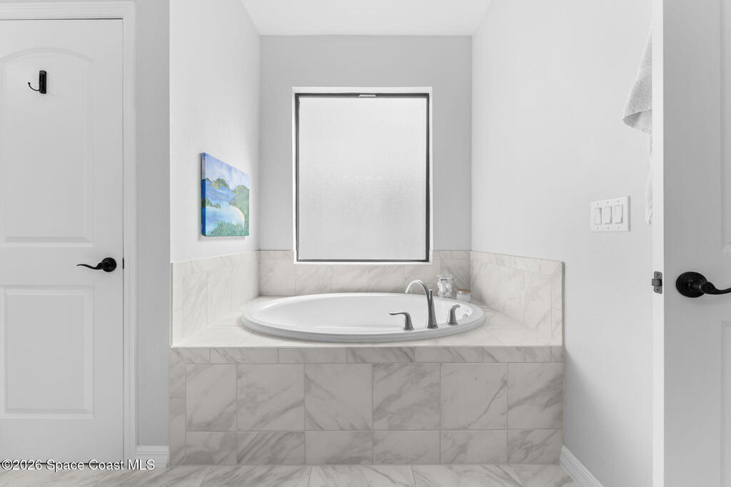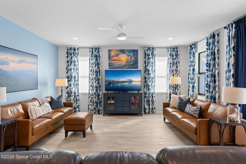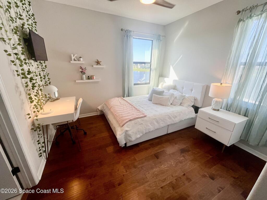 Rare 2023 Viera pool home with epic lake & sunset views. 50' x 11' covered patio w/privacy walls give a cozy view through the panoramic pool screen. 27.5ft x 13ft salt water pool & 8x10 hot tub enhanced with 400k BTU gas heater. Natural gas stove, outdoor grill & tankless water heater. 2 triple sliding glass doors show the shimmering turquoise pool, flowing large pond & golden sunsets into the kitchen, dining & living room areas. 20 yards of river rock surround the home. All tile on 1st floor. 2nd floor is hardwood & tile. Oversized 2 car garage for your golf cart or home gym. Water filtration, softening system & reverse osmosis. Miles of wide sidewalk for golf carts, jogging & walking to enjoy nature. No hurricane shutters needed for 2nd floor & front impact rated windows.