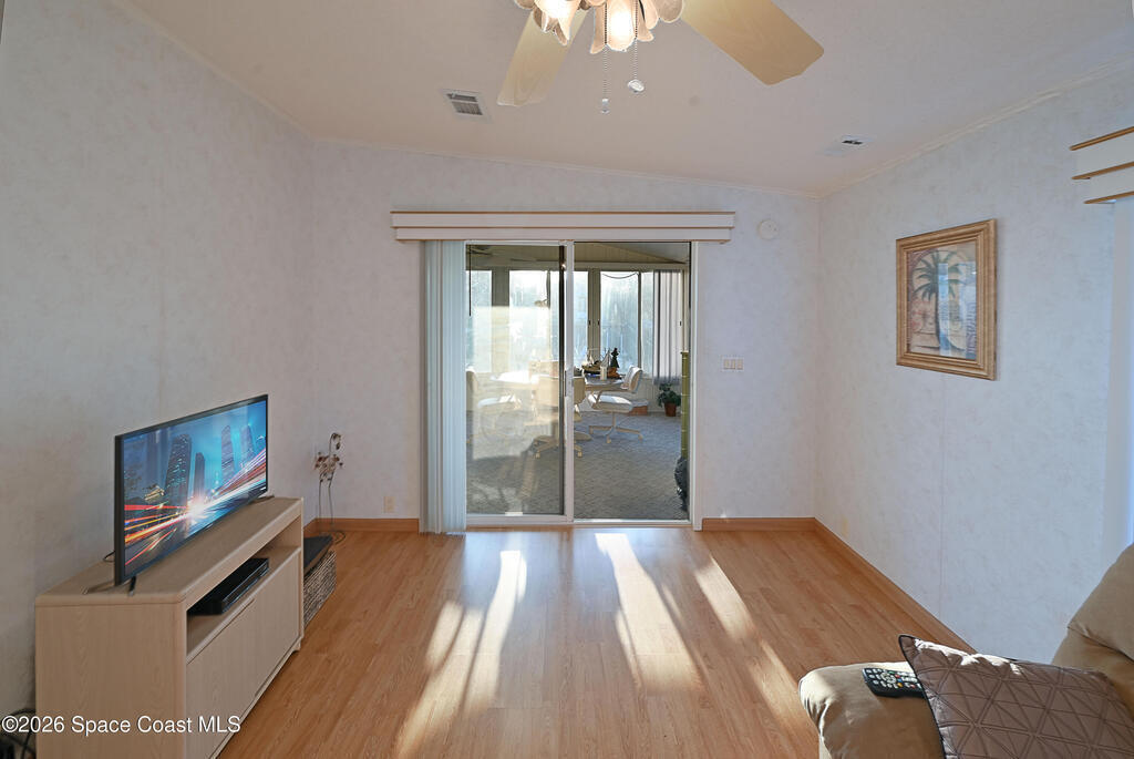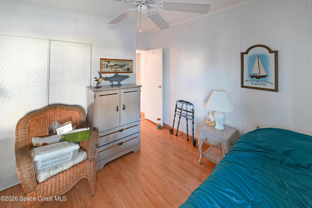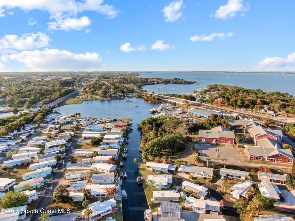 Bring your boat! Prime waterfront location with this home positioned as the furthest north residence on the east side of the waterway and situated at the end of a cul-de-sac in a co-op community. This charming 2-bedroom, 2-bath home offers a spacious layout with ceiling fans in both bedrooms and a primary suite featuring a walk-in shower with grab bar. The kitchen provides ample counter space and abundant cabinetry, while the indoor laundry room includes a washer and dryer for added convenience. Enjoy your morning coffee on the front porch, or relax in the Florida room with ceiling fan overlooking the waterway. The home also features a storage room with electricity. Furniture is included, making this home move-in ready. The community features shuffleboard courts, bocce courts, a heated pool, dog park, clubhouse, and a boat/kayak launch. The active Turkey Creek Social Club offers plenty of opportunities to socialize and enjoy the Florida lifestyle. View today!