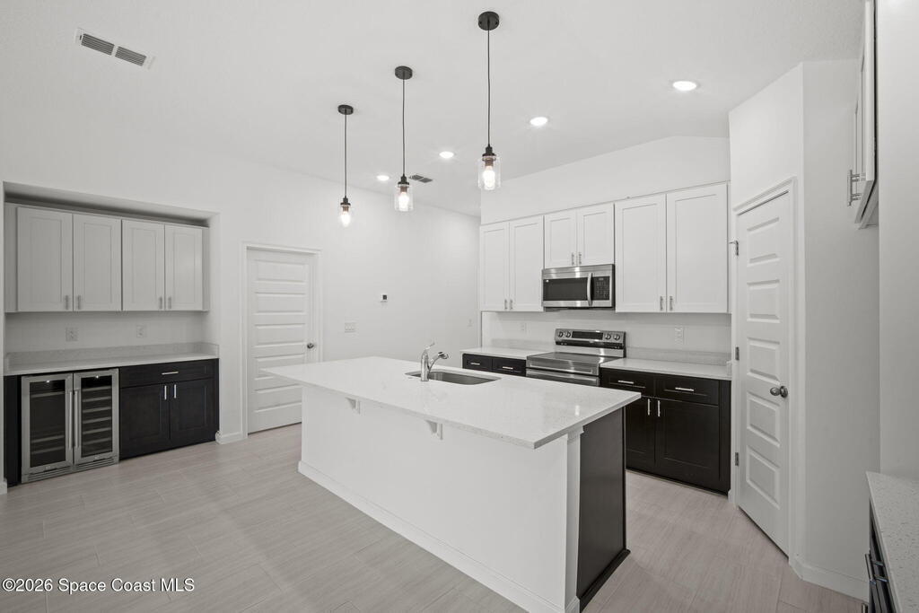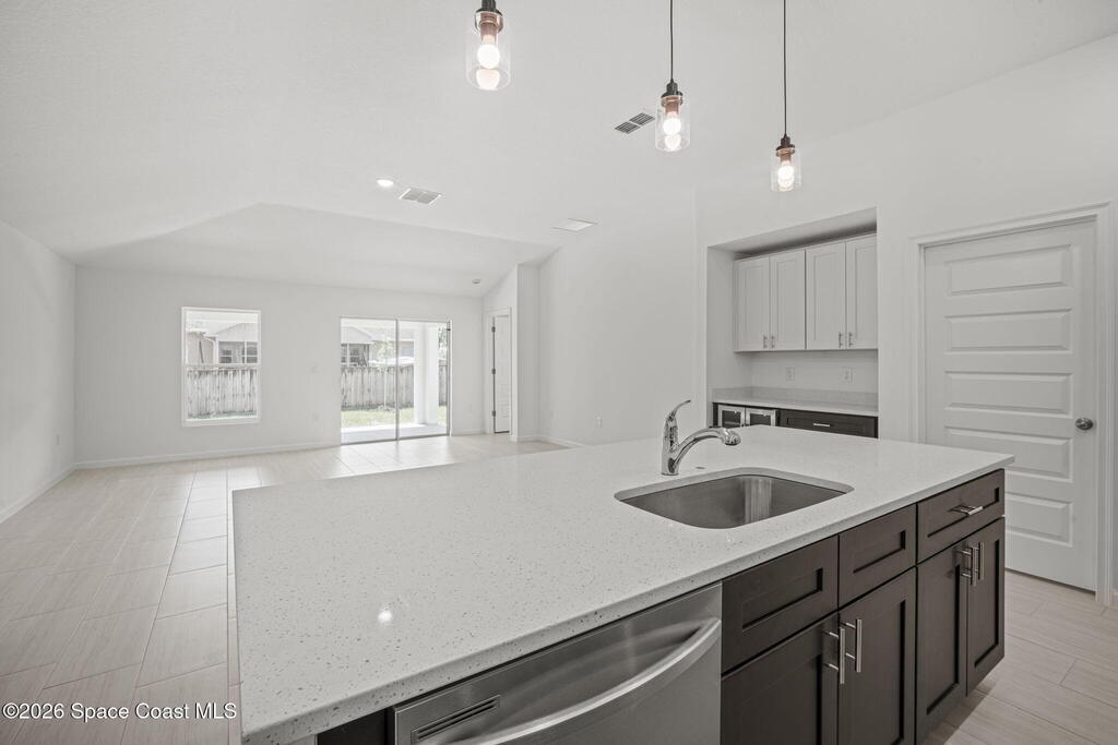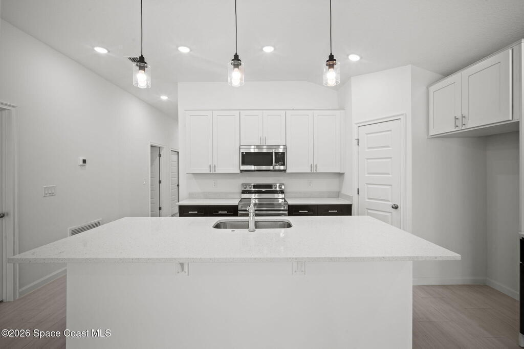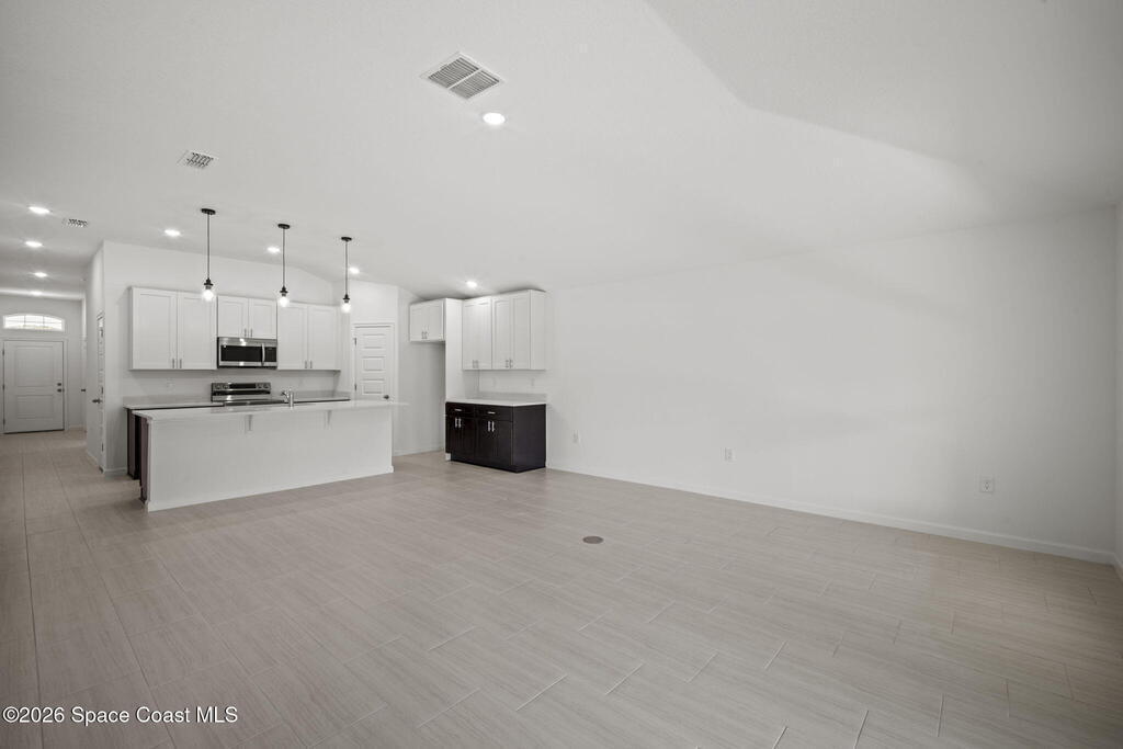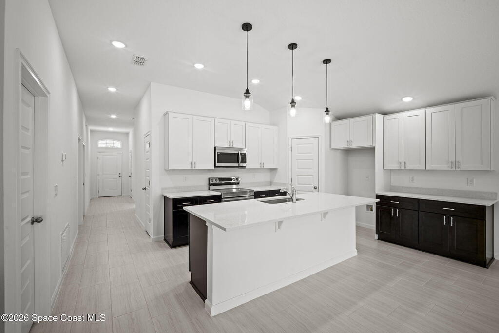3% SELLER CONCESSIONS! NO HOA! Luxury living at an affordable price! With 1794 SQFT of living space, to include four spacious bedrooms and two elegant bathrooms, this corner lot home offers ample space for both relaxation and entertainment. The open-concept features a modernized kitchen, complete w/ 42'' upper cabinets, Samsung stainless steel appliances, large island, dry bar, & highlighted with quartz countertops. The master suite boasts an upscale bathroom, with Corian solid surface counters, custom fixtures, and standalone shower w/accented tile and flooring. Additional bedrooms are generously sized, ideal for guests or a home office. Other features are custom tile throughout (NO CARPET!), custom efficient fixtures and LED lighting, prewire for fans in all bedrooms, storm shutters, double pane windows, hurricane rated garage door, and covered lanai patio for outdoor gatherings. This home is on city water and septic. 1 yr bumper to bumper/2-10 Builder warranty included.