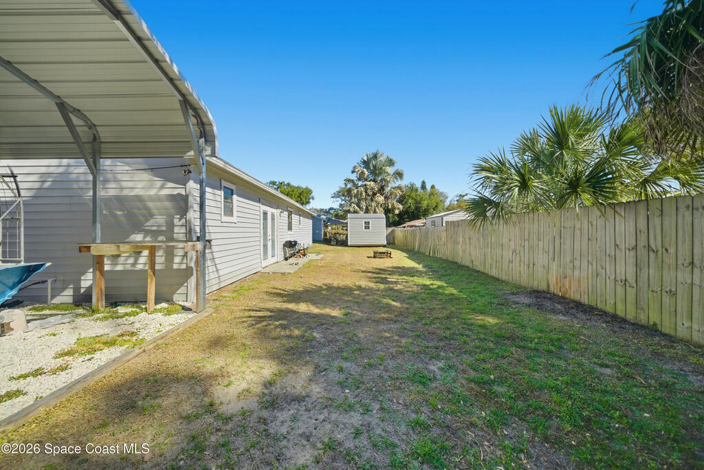2023 roof for peace of mind! Welcome to this well-maintained 3-bedroom, 2-bath home tucked away on a quiet street in the desirable American Village area of Titusville.Inside, you'll find a comfortable, open layout with a spacious living area that flows into the dining space and kitchen featuring ample cabinetry, generous counter space, and a custom-built-in wine bar perfect for both everyday living and entertaining.French doors lead out to a large backyard, giving you plenty of space to relax, host, or create your own outdoor setup. The split-bedroom floor plan offers added privacy, and the attached 2-car garage provides convenience and extra storage with a shed and carport. Located just minutes from I-95 and US-1, you're close to shopping, dining, and everything the Space Coast has to offer including rocket launch views right from home.Move-in ready with the opportunity to make it your own.