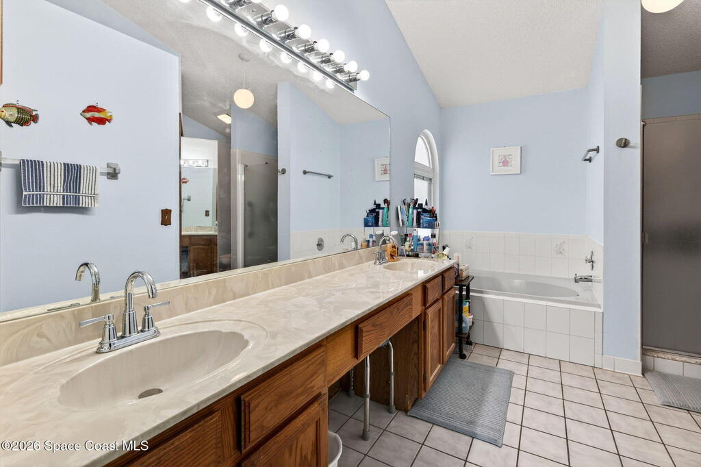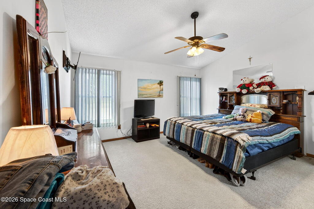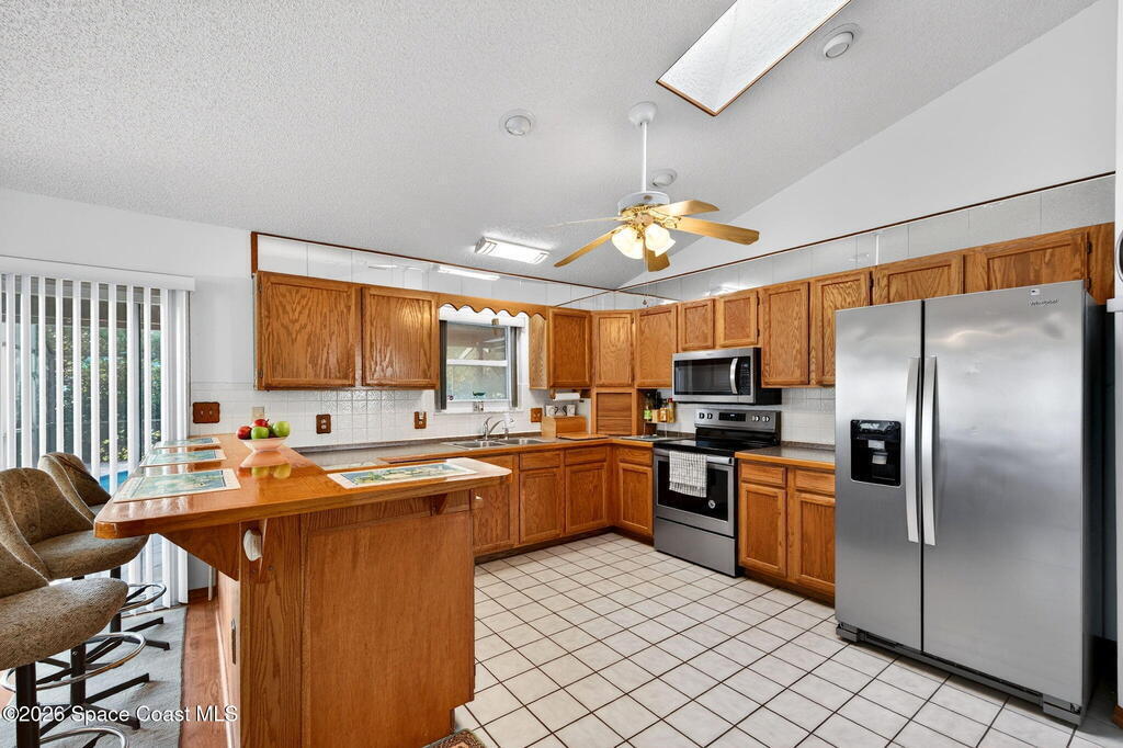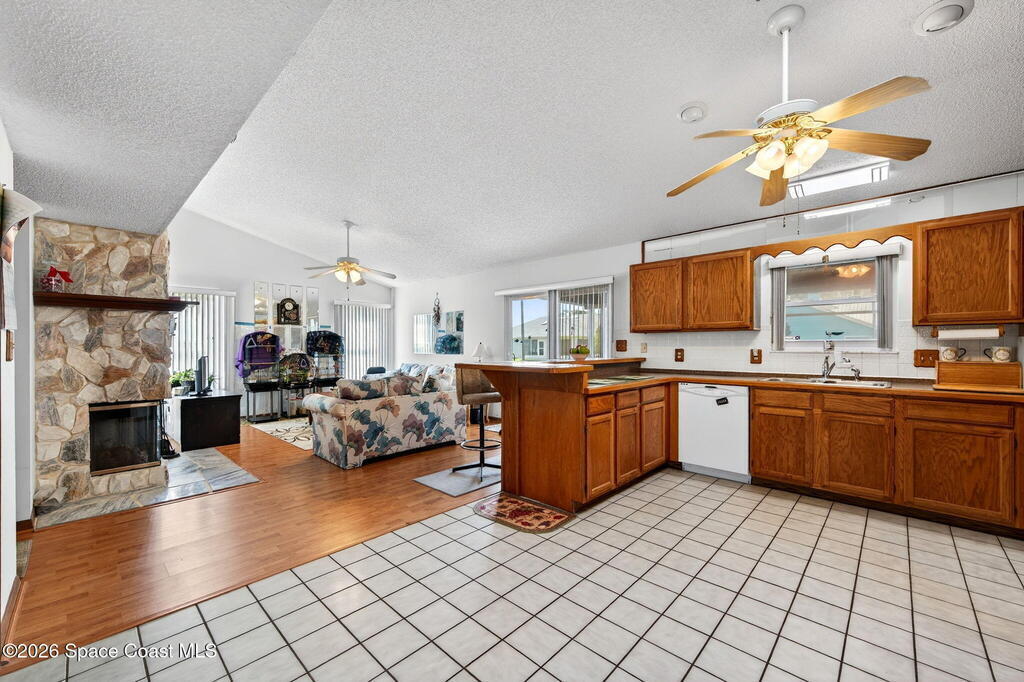 Welcome Home! Sitting pretty on a raised corner lot, this home brings the vibe w/ a sparkling south-facing pool made for sun-soaked days & easy Florida living. Inside, a split floorplan delivers the perfect mix of privacy & flow, while soaring vaulted ceilings elevate the space & make it feel open, bright & inviting.The primary suite offers your own retreat w/ double vanity, soaking tub, walk-in shower, large closet & separate commode. The kitchen is the heart of it all w/ real wood cabinets, SS appliances, breakfast bar & skylight, all overlooking the main living space & pool. The living room brings the cozy w/ a stone gas fireplace, while tile in main areas & natural light throughout tie everything together.Big-ticket updates? Done. A/C 2017, HWH 2025 & full hurricane impact doors & windows. Indoor laundry, sprinkler system & more.Morning coffee by the pool, friends over at sunset, fireplace nights when it cools off--this one just feels right.