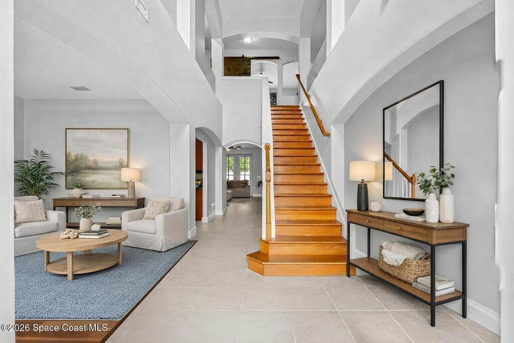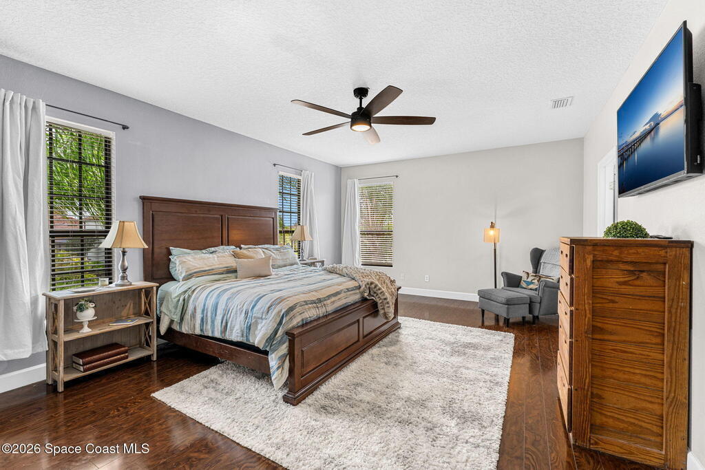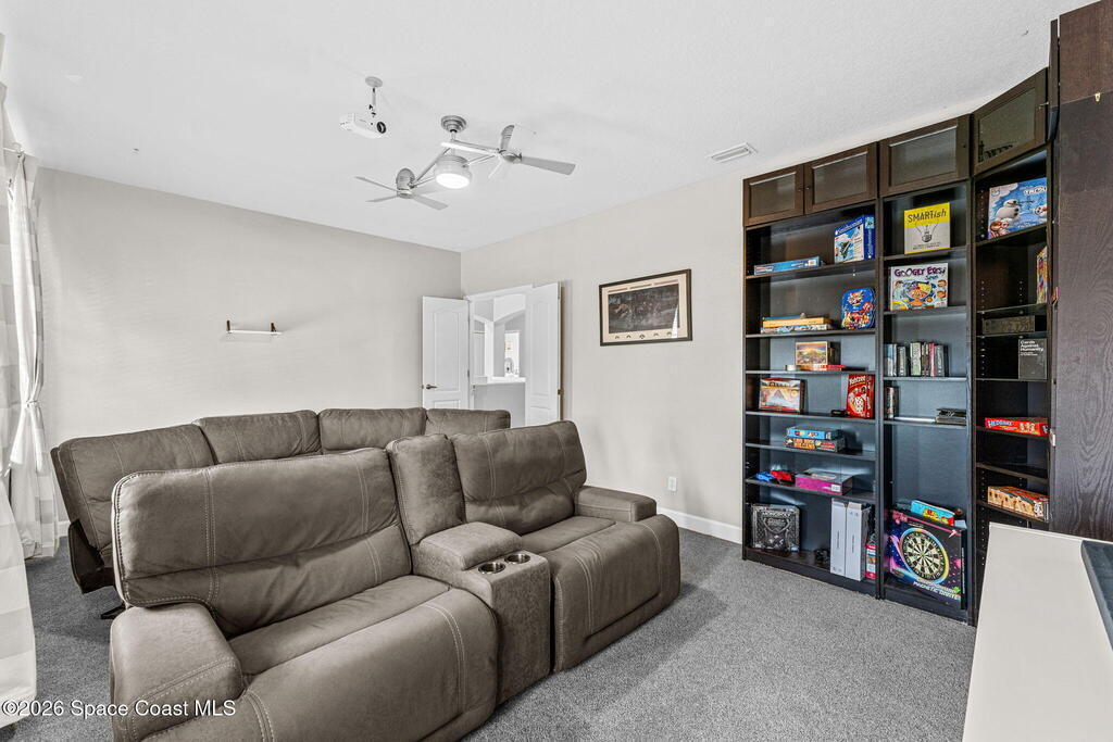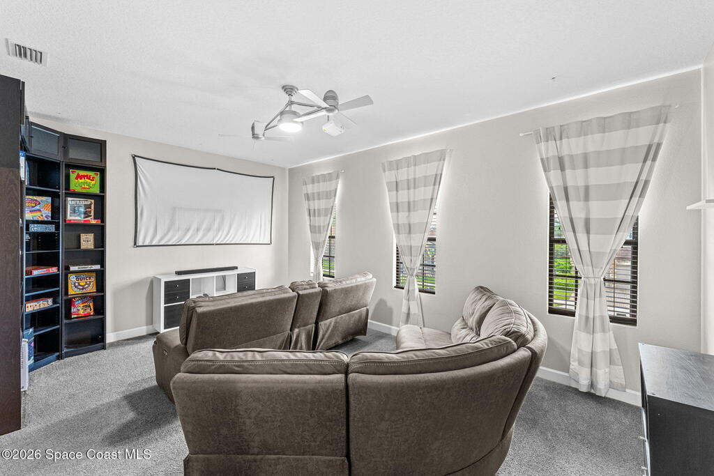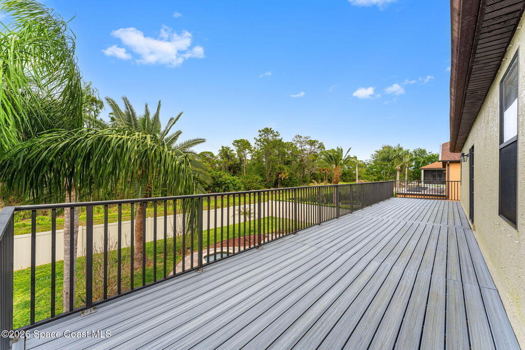 Located in the gated community of Eagle Harbor, this expansive 5-bedroom pool home offers a rare blend of versatility, comfort, and true Florida lifestyle living. With over 3,600 square feet, the thoughtfully designed floor plan adapts effortlessly to the way you live--featuring formal living and dining areas, a dedicated office or flex space, and an open-concept kitchen and family room that seamlessly connects to a sun-filled Florida room currently enjoyed as the main dining space.Upstairs, the home truly shines with a spacious bonus room featuring sliders that open to an impressive 500 sq ft deck--perfect for taking in elevated views of the backyard, enjoying sunset skies, or even catching a rocket launch. A dedicated movie room with high-resolution projector, surround sound, and oversized reclining seating creates the ultimate at-home theater experience.Step outside and you'll find your own private retreat. The fenced backyard showcases a sparkling pool and spa with a built-in
