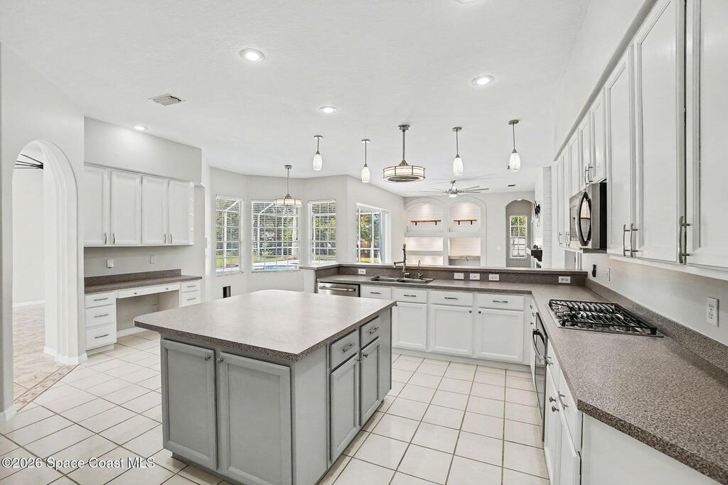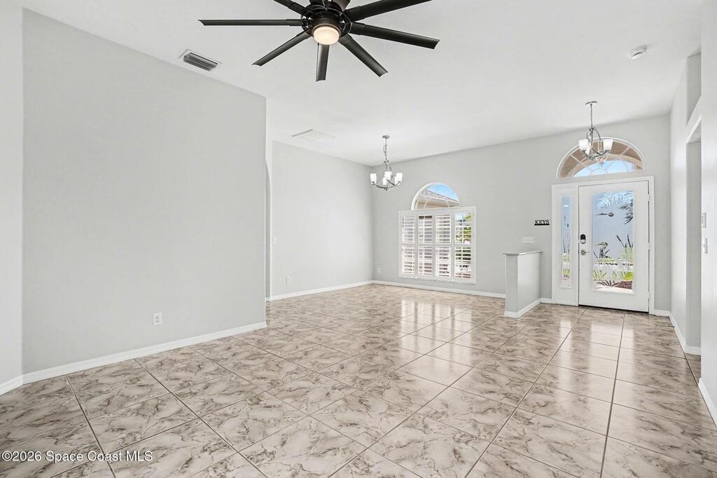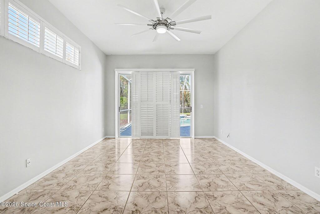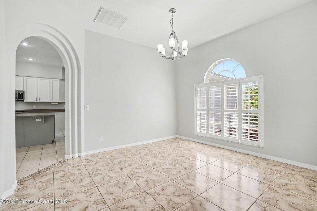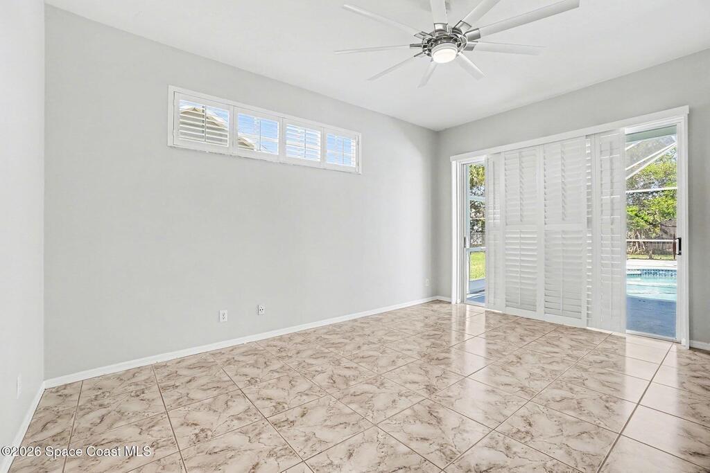 Move-in ready and beautifully maintained, this bright and open 4 bedroom 3 bath pool home features a desirable split floor plan and thoughtful upgrades throughout. Freshly painted inside. This home offers formal living room and dining room plus spacious family room with electric fireplace all overlooking a tropical, gas heated pool and spa perfect for entertaining. The gourmet kitchen boasts a large working island, abundant storage and stainless appliances, large nook and desk area. An oversized laundry room adds convenience, while plantation shutters enhance style and privacy. This spacious primary suite includes dual walk in closets, double sinks, a garden tub and walk in shower. Complete with a 3 car garage and hurricane shutters. Ideally located close to everything Viera has to offer, shopping, dining, Patrick Space Force Base, and less than an hour to Orlando International Airport and Disney. Don't miss making this stunning home your own! roof 2013 AC 2018