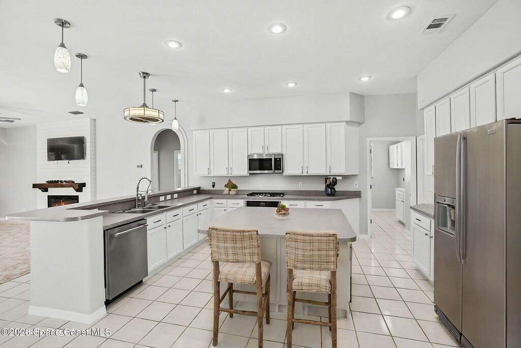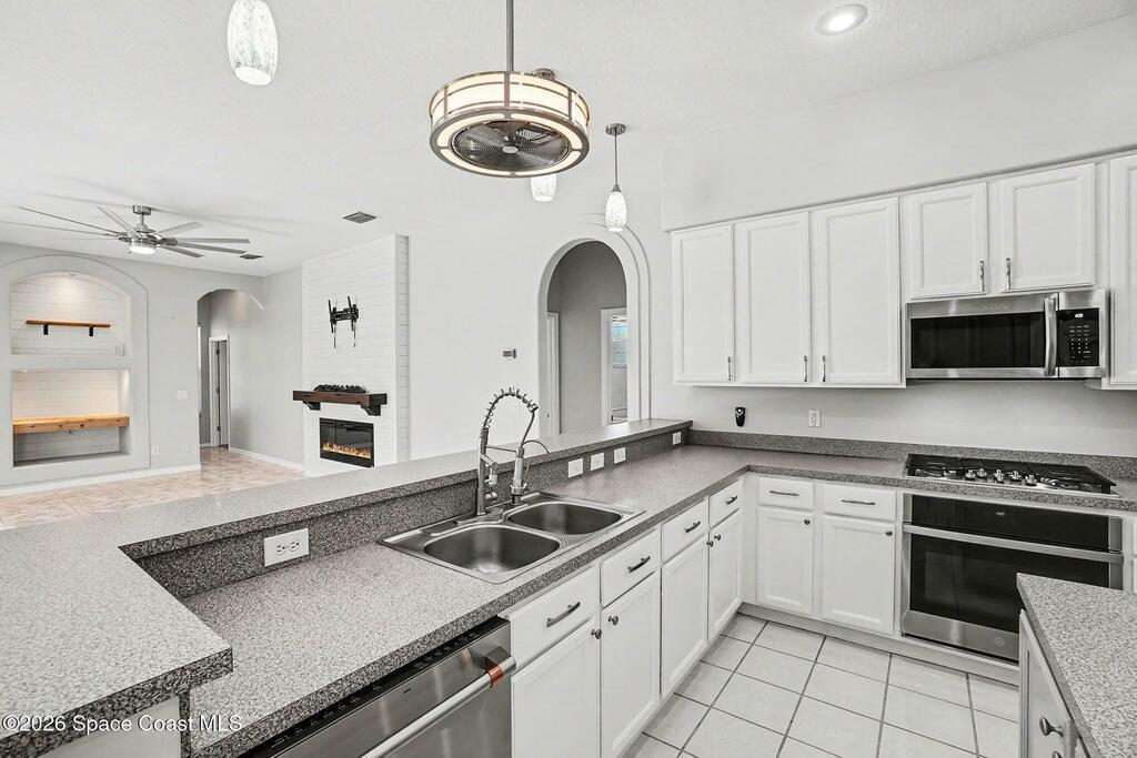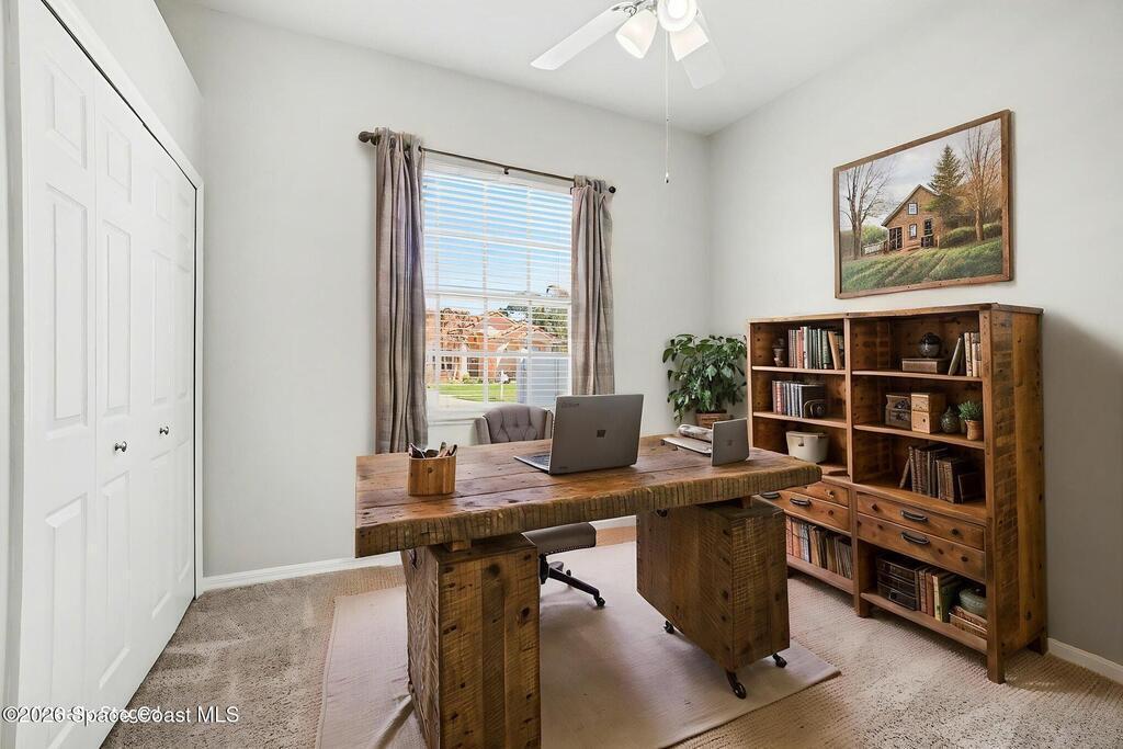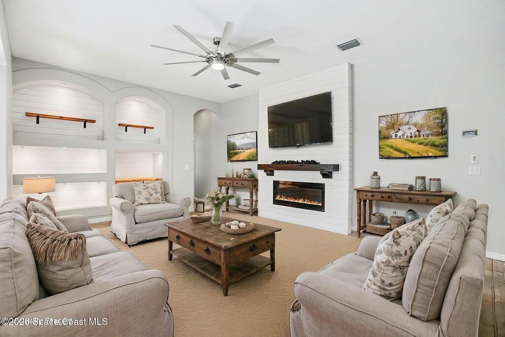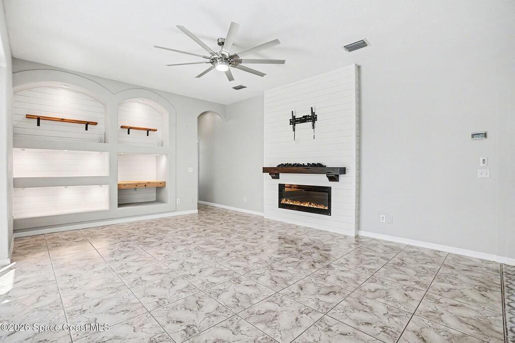 Move-in ready and beautifully maintained, this bright and open 4 bedroom 3 bath pool home features a desirable split floor plan and thoughtful upgrades throughout. Freshly painted inside. This home offers formal living room and dining room plus spacious family room with electric fireplace all overlooking a tropical, gas heated pool and spa perfect for entertaining. The gourmet kitchen boasts a large working island, abundant storage and stainless appliances, large nook and desk area. An oversized laundry room adds convenience, while plantation shutters enhance style and privacy. This spacious primary suite includes dual walk in closets, double sinks, a garden tub and walk in shower. Complete with a 3 car garage and hurricane shutters. Ideally located close to everything Viera has to offer, shopping, dining, Patrick Space Force Base, and less than an hour to Orlando International Airport and Disney. Don't miss making this stunning home your own! roof 2013 AC 2018