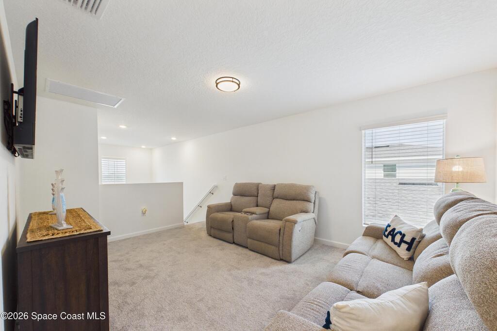 Located in the gated community of Tillman Lakes, this spacious home stands apart with full CONCRETE BLOCK construction on BOTH LEVELS, along with IMPACT-RESISTANT WINDOWS, premium upgrades for enhanced protection & peace of mind while supporting energy efficiency. Inside, an open-concept layout connects the kitchen, dining, & living areas for effortless everyday living & entertaining. The kitchen features white shaker-style cabinetry with crown molding, a large quartz island, and a huge pantry. 2'' faux wood blinds add privacy throughout. The primary suite is conveniently located on the main level, while upstairs offers a bright loft, four additional bedrooms, & a full bath. Enjoy the oversized 400 sq ft trussed & screened lanai backing to the Tillman Preserve, perfect for relaxing/hosting. The front of the home is enhanced by well-maintained, inviting landscaping that adds to its curb appeal. Features like these set this home apart from many newer builds nearby. Washer/dryer included!