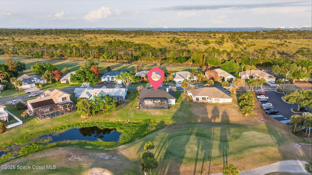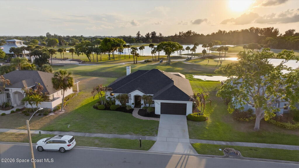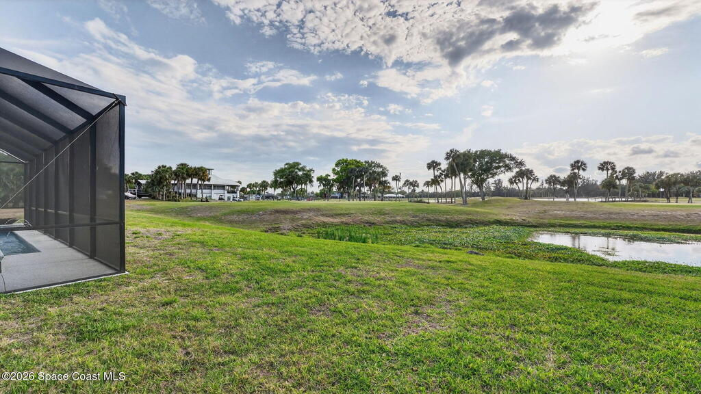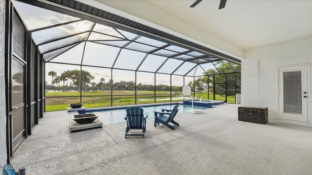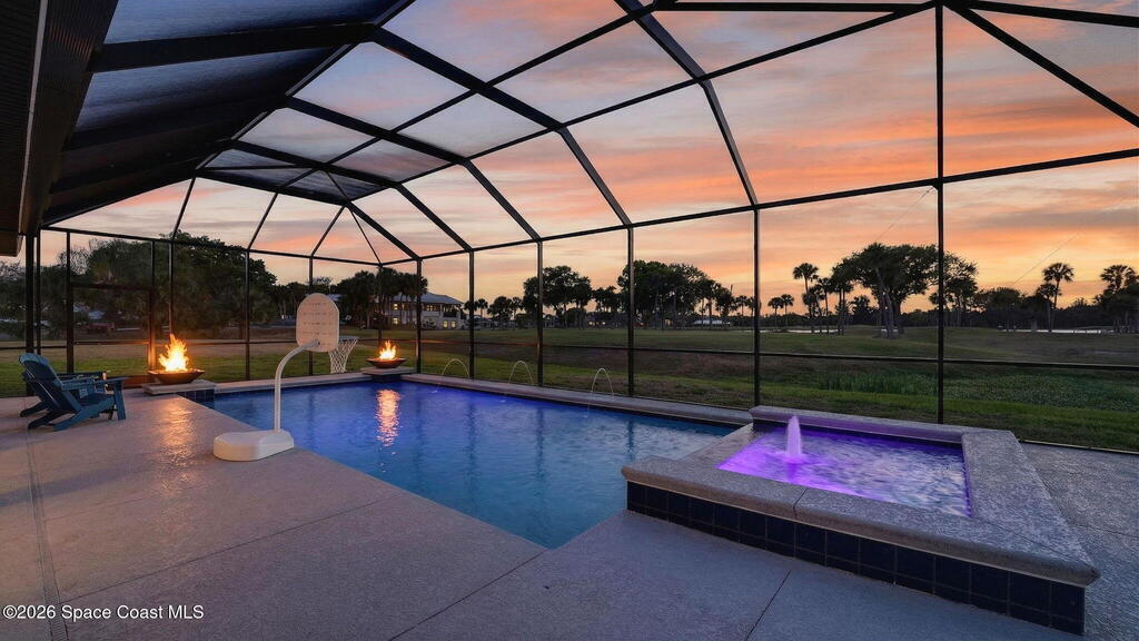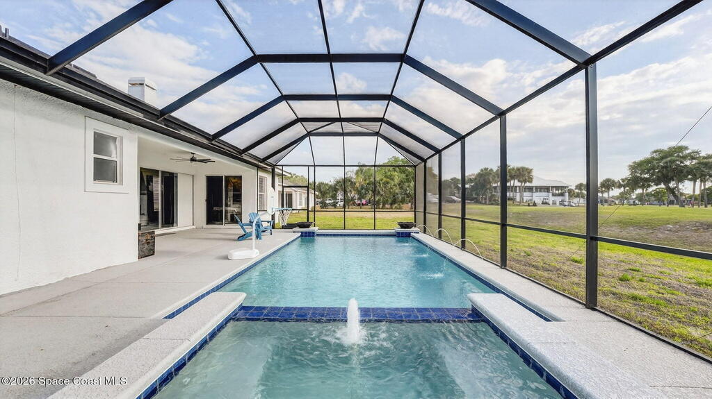 **Merritt Island Grandeur Awaits: Your Stunning 4-Bedroom (with Bonus/Den/Office) Salt-Water Pool Home Oasis is Here; Unrivaled Lake and Golf Course/ Sunset Views** Step into your meticulously and prestigiously renovated sanctuary, a remarkable 4-bedroom, 2-bathroom home, that epitomizes luxury and comfort. Nestled in the serene Savannahs neighborhood, this indoor/outdoor paradise features a custom saltwater pool, accompanied by a heated Therapy Spa, all enhanced with remote-controlled Lighting and enchanting Fountain features. Breathtaking sunsets await you from the spacious screened-in area, complemented by a well-equipped outdoor kitchen perfect for entertaining or peaceful relaxation.Inside, you're greeted by a Move-In-Ready, open floor plan, filled with natural light and a state-of-the-art kitchen, which boasts of granite countertops, a massive island perfect for cooking and company, high-end appliances, including a 48-inch Cafe refrigerator.