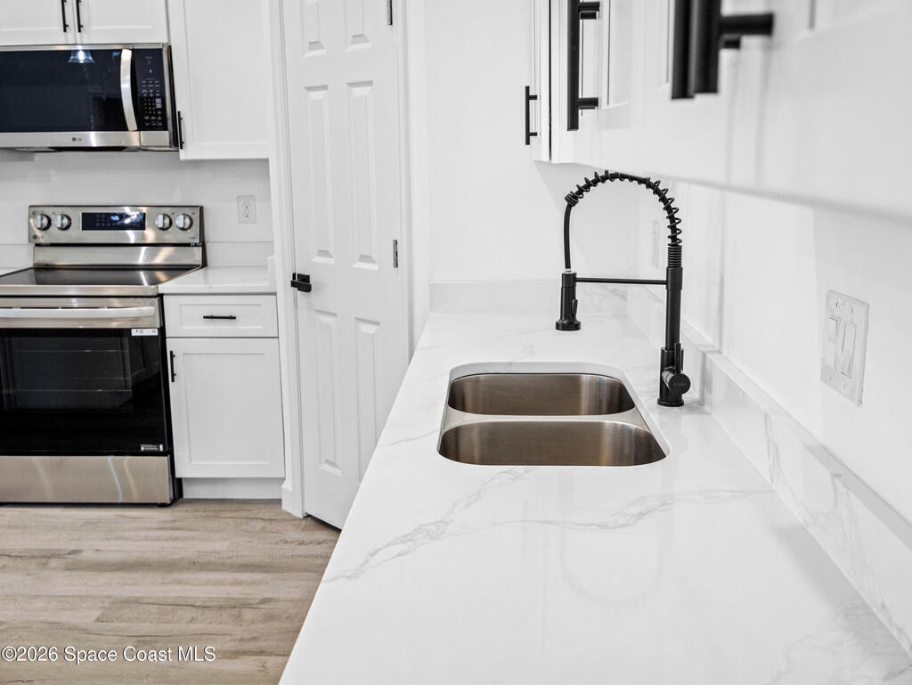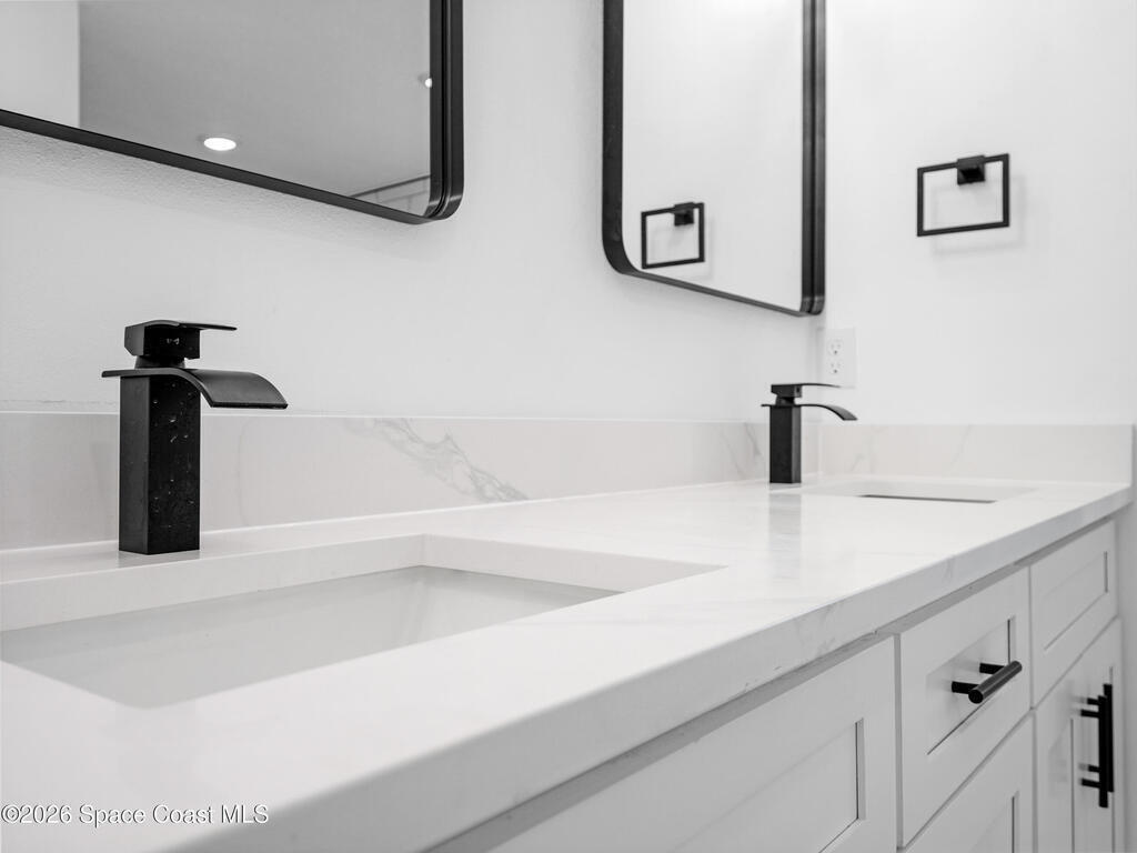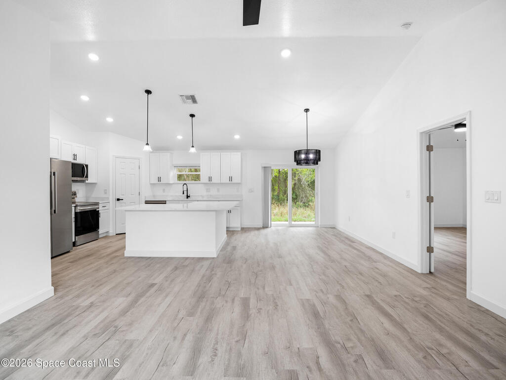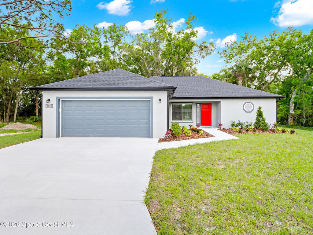 Brand new construction home centrally located in Mims! All hurricane impact windows and sliders! When you walk through the front door you come into an open concept design with a spacious living room, dining room & kitchen with an unique ''L'' shaped island giving extra counter space and cabinet space, quartz countertops and white shaker, soft close cabinets. Corner pantry with plenty of storage. The dining room has a sliding door which brings in great natural light and looks out to the backyard with no neighbors behind you! The primary suite has a generous size bedroom, walk-in closet, linen closet, double vanity and an oversized shower with a sitting bench. Split floor plan with two more bedrooms and a bathroom on the other side of the house with a spacious laundry room, that has a linen closet and leads to the garage. This property is on a quiet dead end street for privacy and peace.