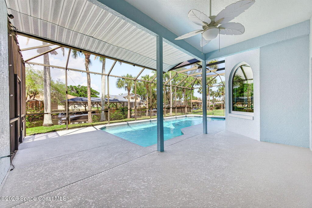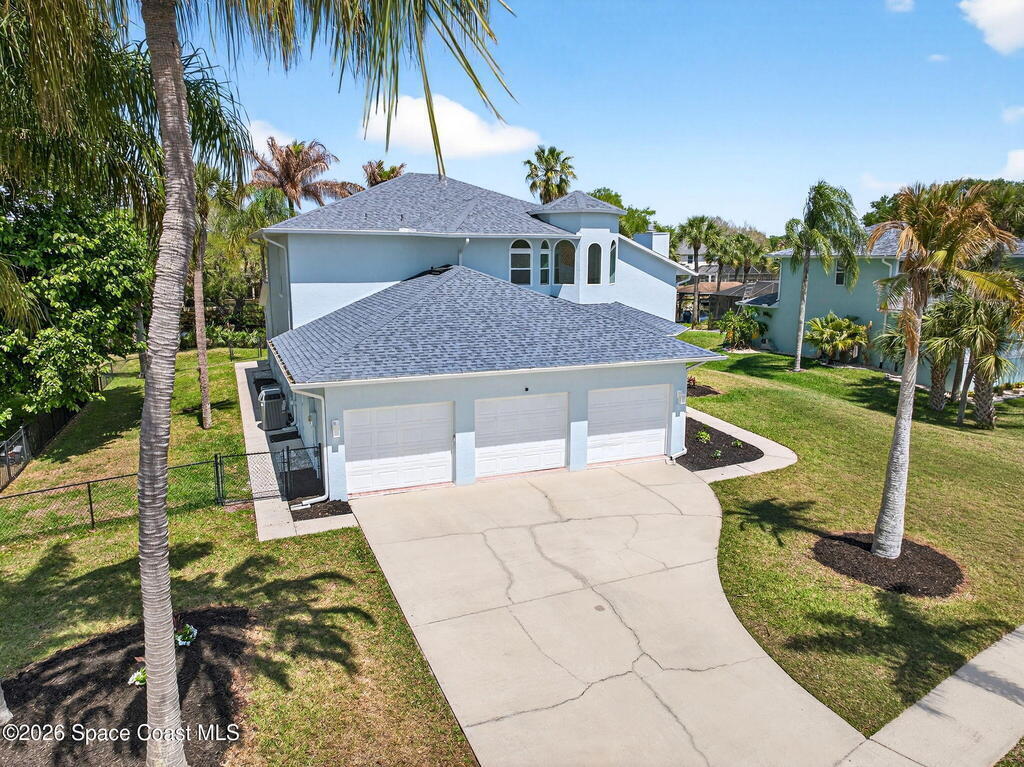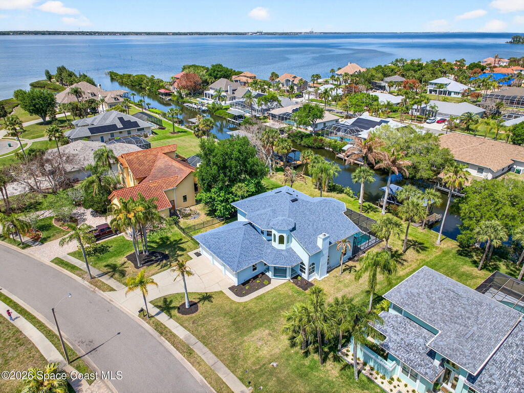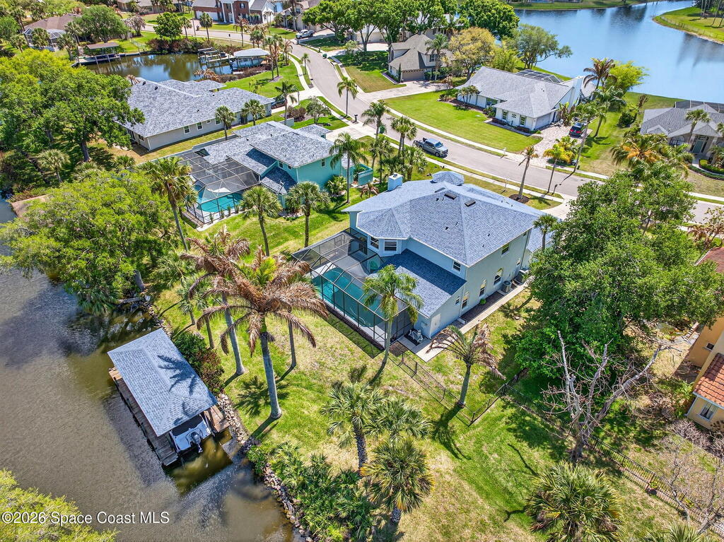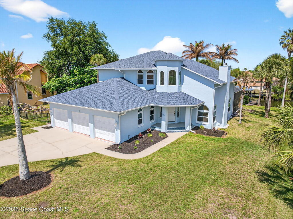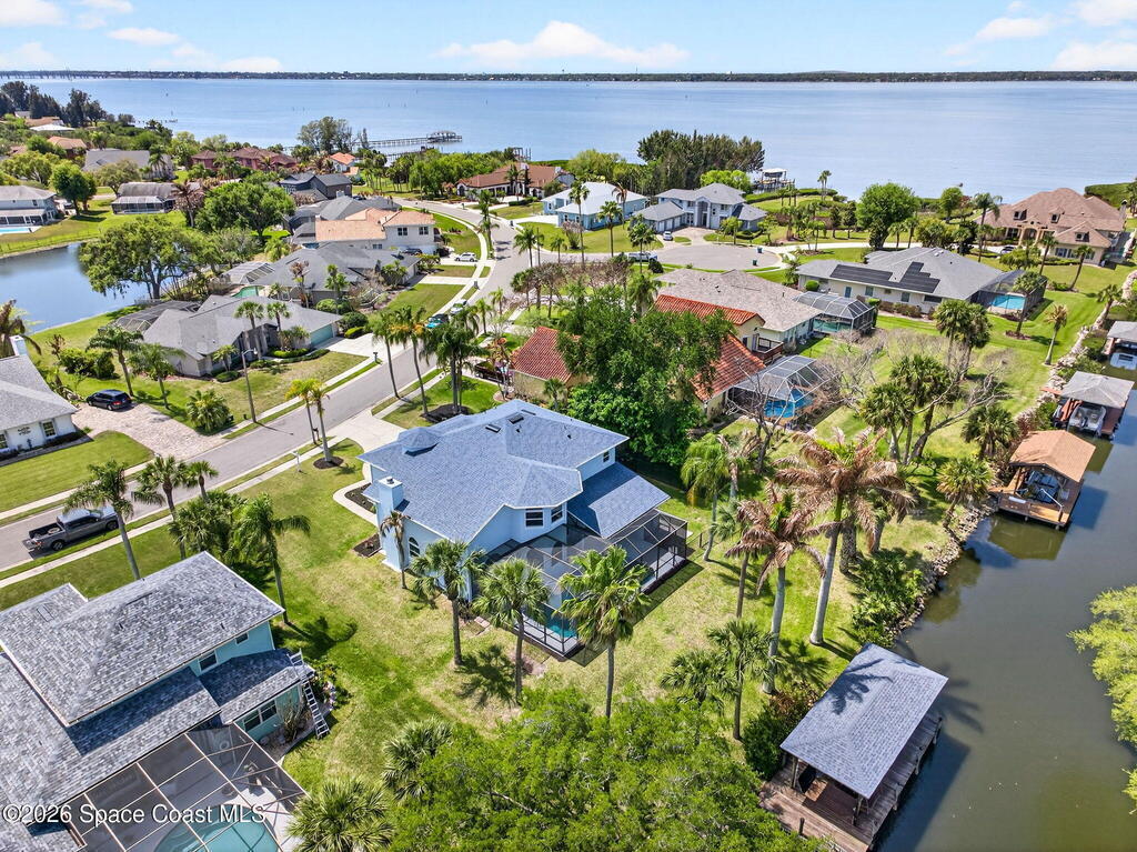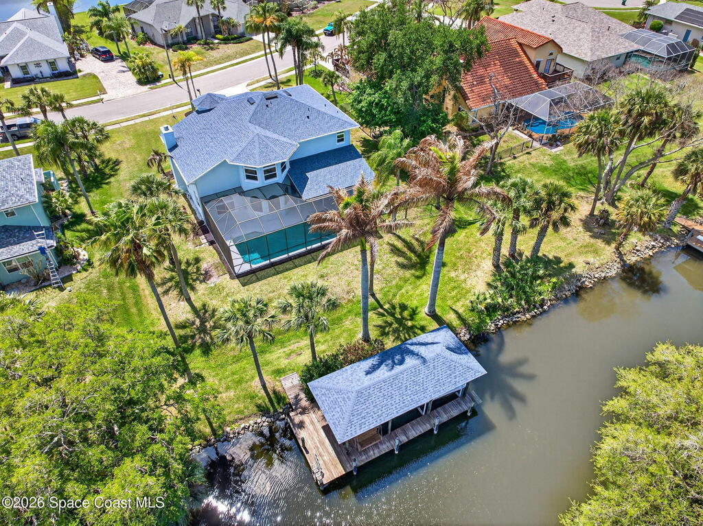 Hard to find spacious over 3,000 sq ft WATERFRONT POOL home w/ DIRECT access to the Intercoastal! NO bridges! Custom home surrounded by meticulous homes in the sought after neighborhood of Indian Bay! Roof 2023 new exterior paint & IMPACT windows & doors! Full private suite on the first floor & huge primary suite upstairs w/ river views! 3rd garage bay is under A/C for a perfect gym or hobby/workshop! Beautiful screened pool area w/ new refreshed decking overlooking the sprawling backyard & water! Covered boat dock currently set up to handle a 27' boat & 10,000# lift (but could potentially modify it for an even larger boat) Large foyer entry w/ soaring ceilings & an abundance of natural light greets you as you enter! Large living / dining combo room w/ gas fireplace! Massive kitchen w/ a breakfast bar that can seat all of the family & more! Plus a wonderful nook overlooking the pool & water! Options for laundry upstairs or down! Newer appliances too! Community boat launch! Come see!