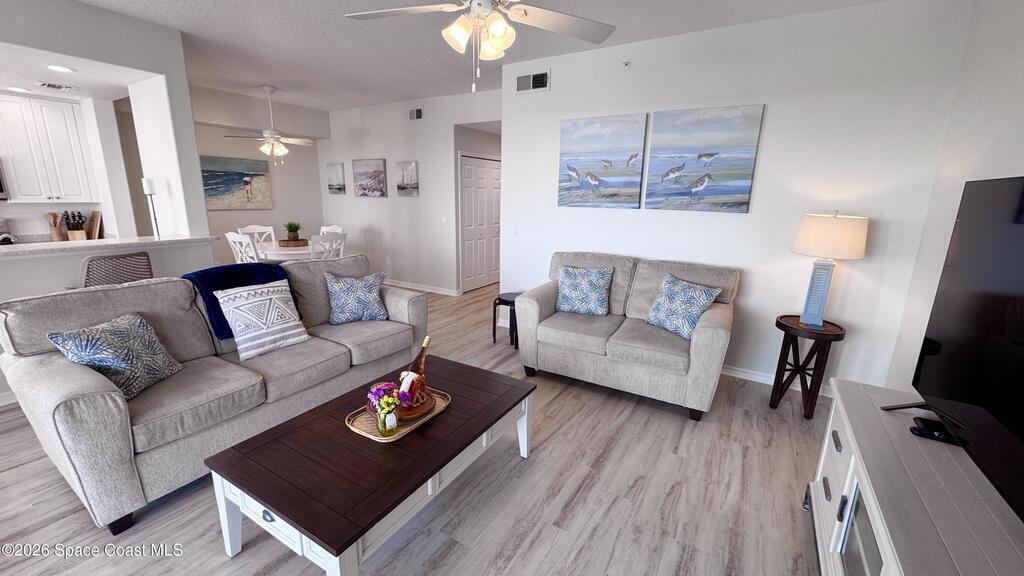 Welcome to The Terraces at Heritage Isle, widely regarded as one of the premier 55+ resort-style communities in Viera, Florida. This beautifully remodeled lakefront condo offers 1,235 square feet of elegant living space, featuring 2 bedrooms, 2 bathrooms, and soaring ceilings, all located on the highly desirable quiet 4th floor with elevator access.From the living room, kitchen, and screened lanai, enjoy breathtaking panoramic views of the tranquil lake and the Duran Country Club Golf Course--one of the best vantage points in the community. Designed in a light, coastal style, this condo has been thoughtfully updated with top-of-the-line, all-climate waterproof LVP flooring throughout, soft white designer wall tones, and high-end appliances. The unit is fully furnished with tasteful, upscale coastal furniture and includes a large smart TV, making it truly move-in ready.The well-planned floor layout begins with a spacious foyer and hallway that leads to two private bedrooms, two bath