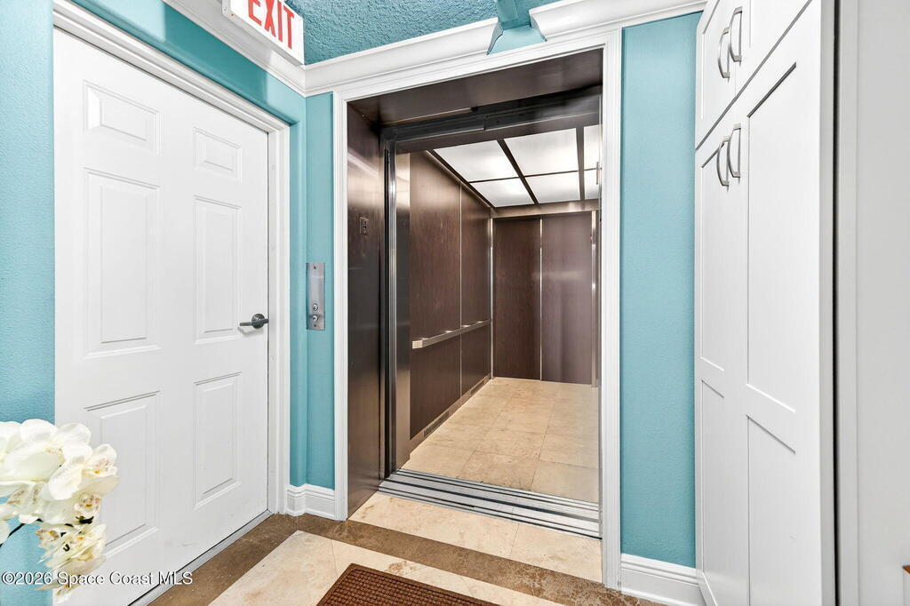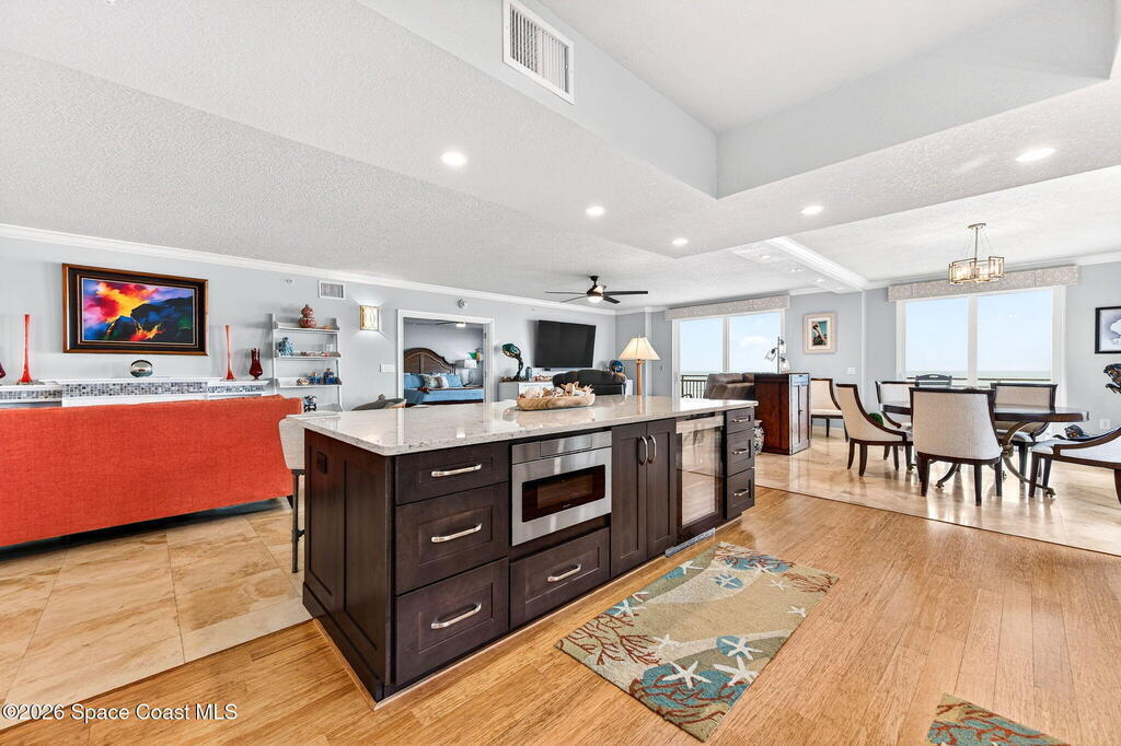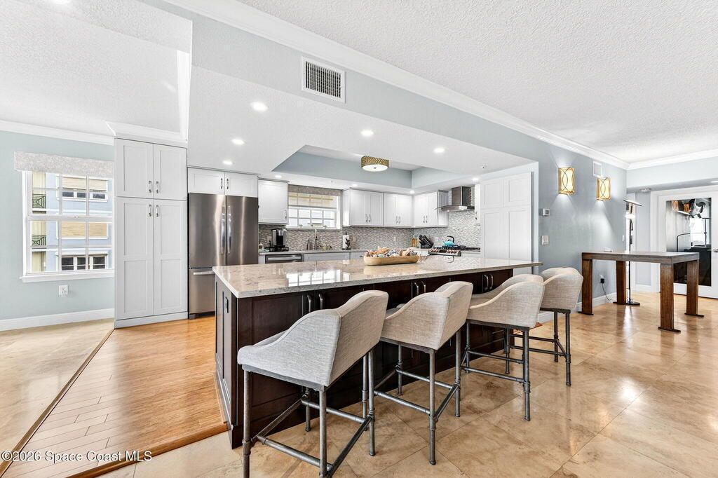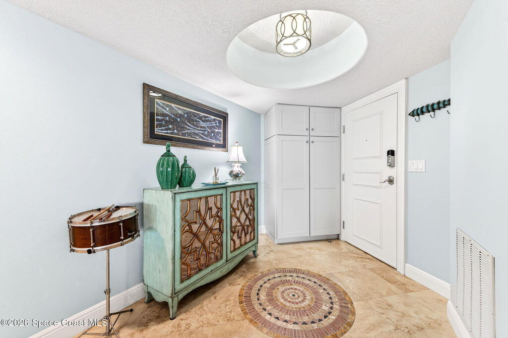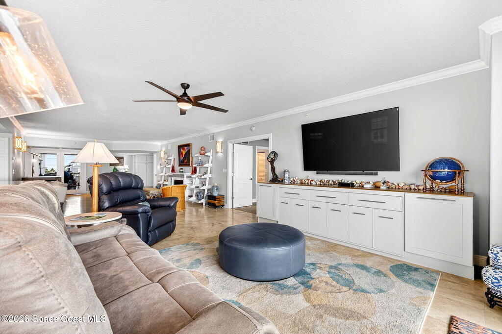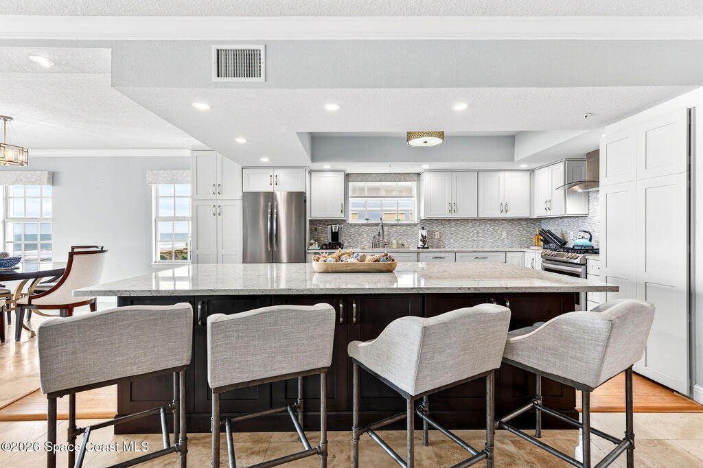 Discover breathtaking ocean and river views from this stunning southeast corner 3-bedroom, 3-bath residence at The Carlyle in South Cocoa Beach. Step directly from the secure elevator into your private vestibule and experience the thoughtful custom details throughout. Flooded with natural light, the spacious open-concept floor plan creates an inviting living environment. The meticulously chef's kitchen features rich wood cabinetry, an oversized island with seating, a gas cooktop with a sleek vent hood, and premium stainless steel appliances. Completely open to the living, dining, and conversation areas, the kitchen offers sweeping views of the ocean and centers around a cozy fireplace.New impact sliding glass doors beautifully frame the picturesque scenery of the ocean and river, while full home shutters provide added peace of mind. Enjoy morning coffee on the east balcony as the sun rises over the Atlantic, and unwind on the west balcony with spectacular sunset views over the river.