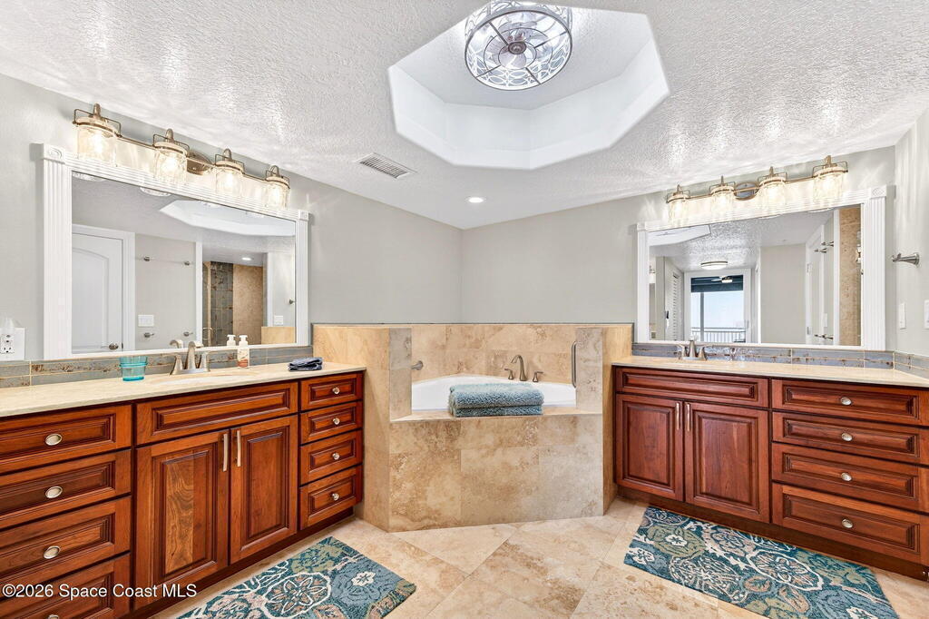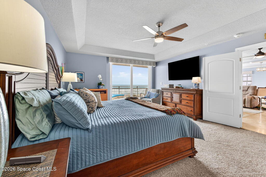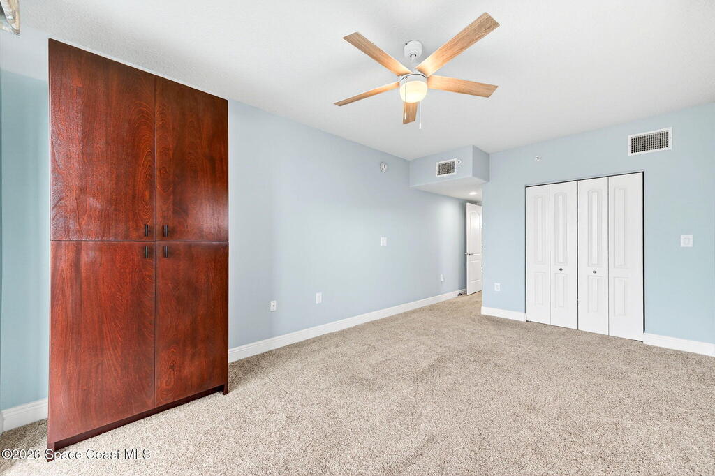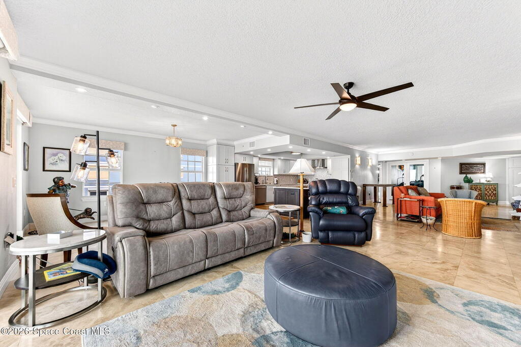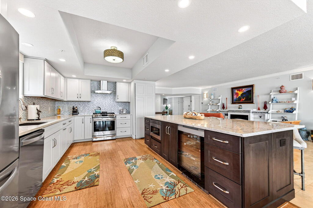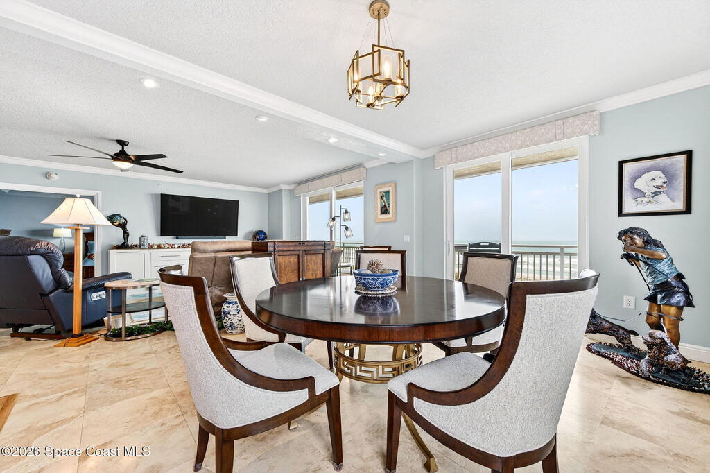 Discover breathtaking ocean and river views from this stunning southeast corner 3-bedroom, 3-bath residence at The Carlyle in South Cocoa Beach. Step directly from the secure elevator into your private vestibule and experience the thoughtful custom details throughout. Flooded with natural light, the spacious open-concept floor plan creates an inviting living environment. The meticulously chef's kitchen features rich wood cabinetry, an oversized island with seating, a gas cooktop with a sleek vent hood, and premium stainless steel appliances. Completely open to the living, dining, and conversation areas, the kitchen offers sweeping views of the ocean and centers around a cozy fireplace.New impact sliding glass doors beautifully frame the picturesque scenery of the ocean and river, while full home shutters provide added peace of mind. Enjoy morning coffee on the east balcony as the sun rises over the Atlantic, and unwind on the west balcony with spectacular sunset views over the river.