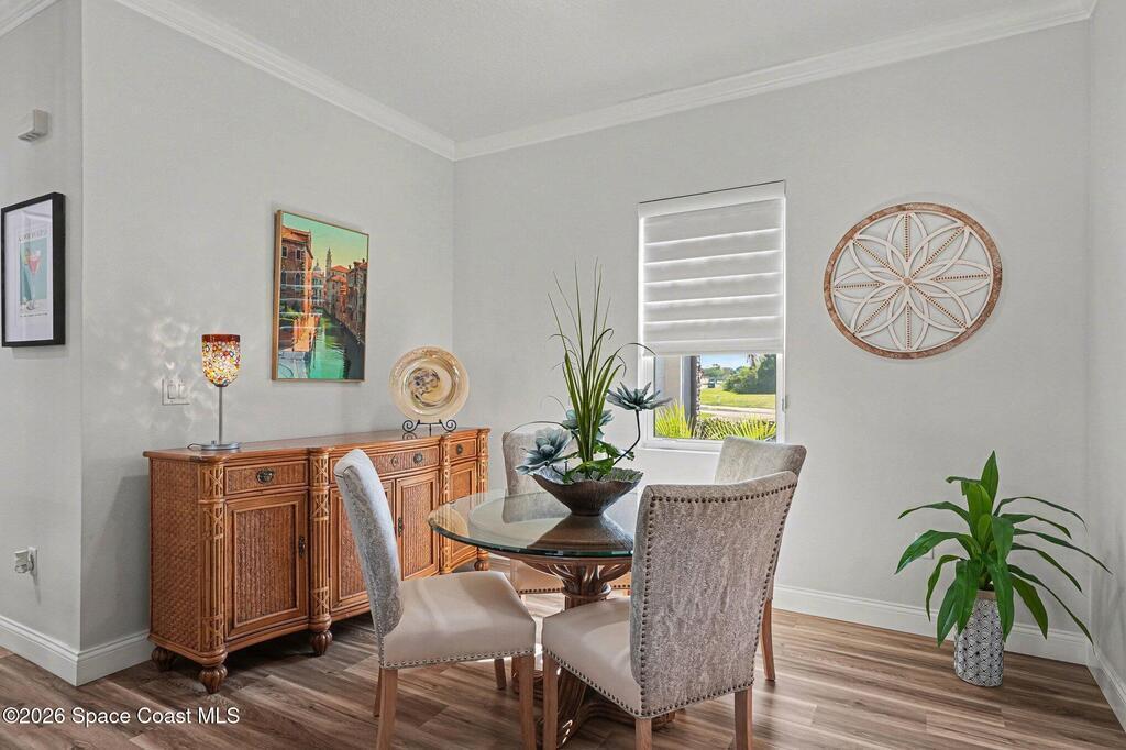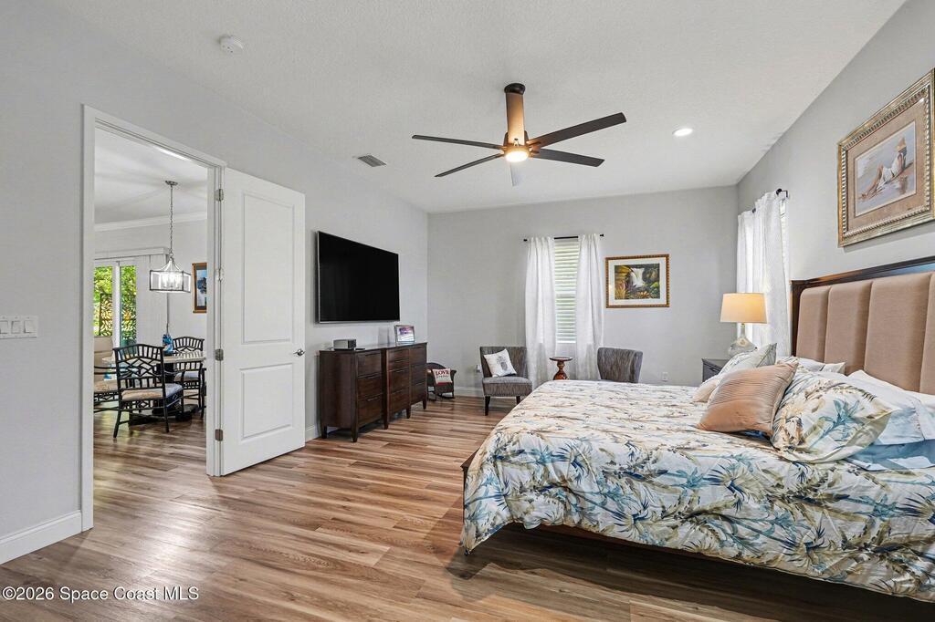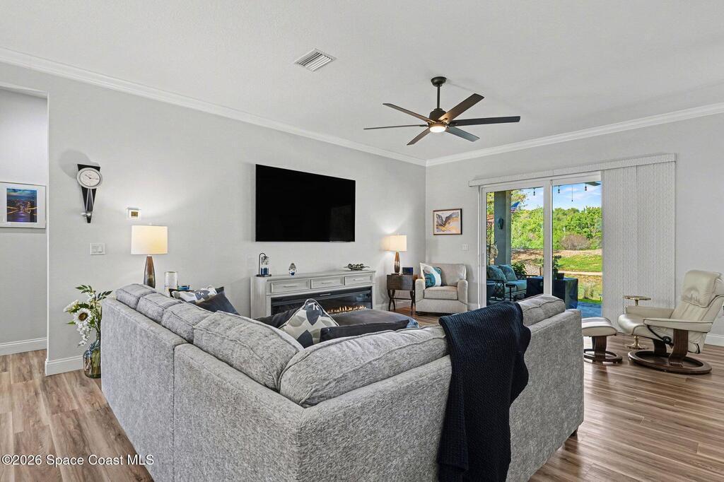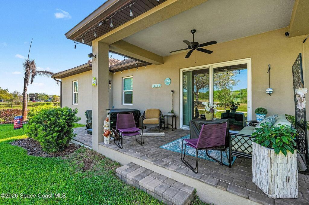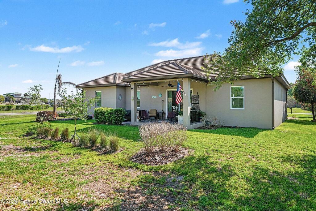 Like-new custom 3BR/2BA home in Indian River Preserve Golf Community featuring an open floor plan, high ceilings, crown molding, and 8' doors throughout. Gourmet kitchen with 42'' cabinets, soft-close drawers, pull-out shelves, granite countertops, 10' island, and pantry with microwave. Spacious primary suite with sitting area, custom walk-in closet, and ensuite bath with soaking tub, dual vanities, and walk-in shower with dual heads. Enjoy golf course views from the rear patio with spa overlooking the 11th fairway and stunning sunsets. Tile roof, hurricane-impact windows, foam attic insulation for energy efficiency, paver driveway, and oversized 2-car garage. Conveniently located near the clubhouse, dining, Beaches, the port, the Space Center, and Orlando attractions.