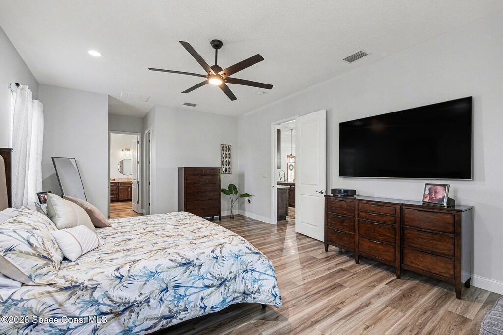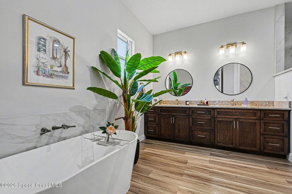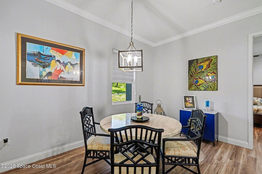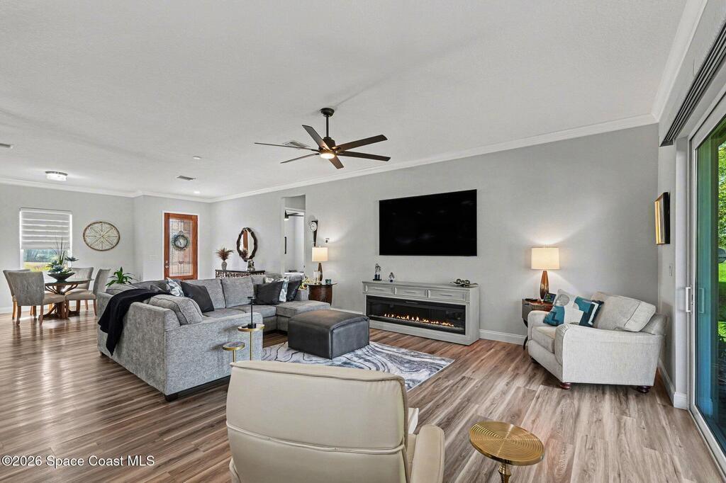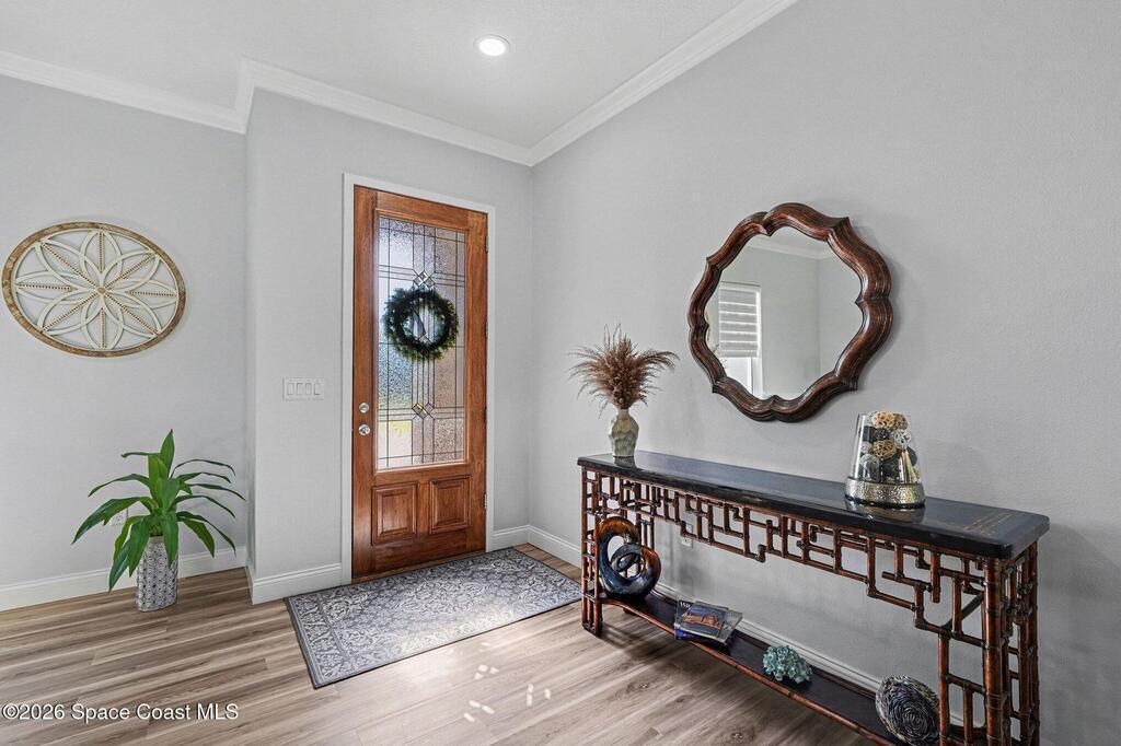 Like-new custom 3BR/2BA home in Indian River Preserve Golf Community featuring an open floor plan, high ceilings, crown molding, and 8' doors throughout. Gourmet kitchen with 42'' cabinets, soft-close drawers, pull-out shelves, granite countertops, 10' island, and pantry with microwave. Spacious primary suite with sitting area, custom walk-in closet, and ensuite bath with soaking tub, dual vanities, and walk-in shower with dual heads. Enjoy golf course views from the rear patio with spa overlooking the 11th fairway and stunning sunsets. Tile roof, hurricane-impact windows, foam attic insulation for energy efficiency, paver driveway, and oversized 2-car garage. Conveniently located near the clubhouse, dining, Beaches, the port, the Space Center, and Orlando attractions.