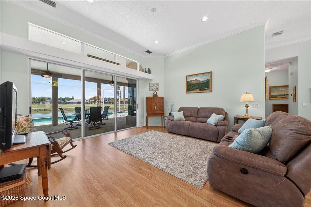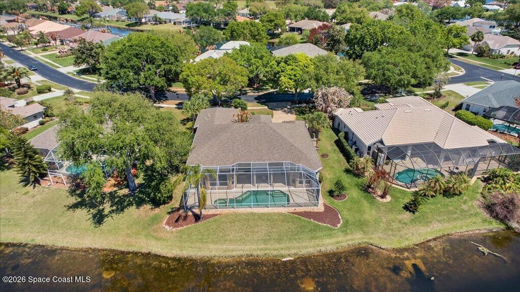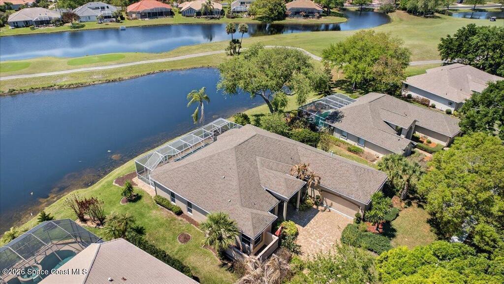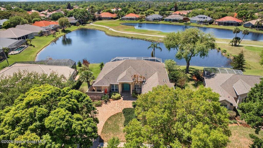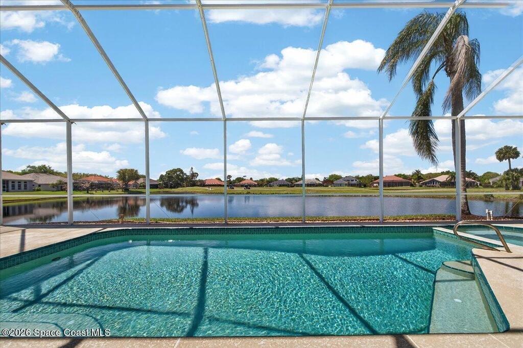 Seeking the perfect Florida coastal lifestyle on the Space Coast? Welcome to this inviting 4 bedroom, 3 bath waterfront pool home, overlooking a championship 18-hole golf course! Step through your front door into a light-filled living space where soaring ceilings and a thoughtfully designed split floor plan create an immediate sense of openness and ease-all beautifully framed by endless water views! Step outside and relax on your large screened patio, complete with heated pool and spa - your private oasis. The spacious primary suite offers a serene retreat, with a sitting area, and spa-inspired bath, featuring a jetted tub, dual vanities, separate shower and walk-in-closets. At the heart of the home, the kitchen...a chef's dream! An Electrolux Gas Range and Samsung Refrigerator boast dual ice makers-perfect for entertaining! There's a dedicated laundry center and oversized 2-car garage. Years of enjoyment await in this premier Baytree community with nearby dining, shopping & the beach!
