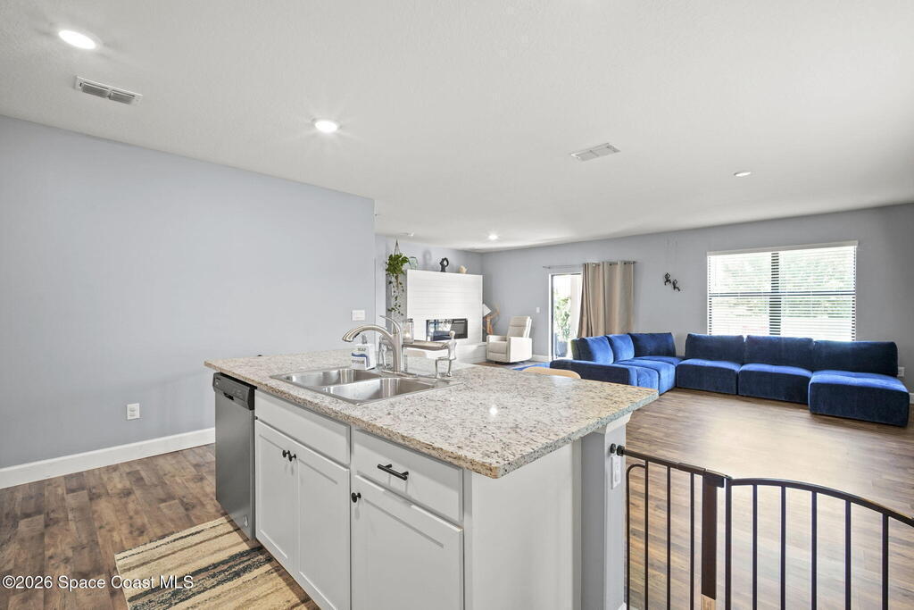Welcome to this beautifully maintained, move in-ready residence offering the perfect blend of modern design, functionality, and everyday comfort. From the moment you arrive, the paved driveway and clean, well kept exterior set the tone for what awaits inside.Step through the front entry into a thoughtfully designed open concept layout featuring durable vinyl flooring, neutral tones, and an abundance of natural light throughout. The expansive living area is anchored by a stunning custom fireplace feature wall, creating a true focal point and an ideal space for both relaxing and entertaining.The kitchen seamlessly connects to the main living space and is equipped with granite countertops, white cabinetry, stainless steel appliances, and a large center island with bar seating, perfect for hosting or casual dining. The open flow allows for effortless interaction between the kitchen, dining, and living areas.The primary suite offers a private retreat with ample space,