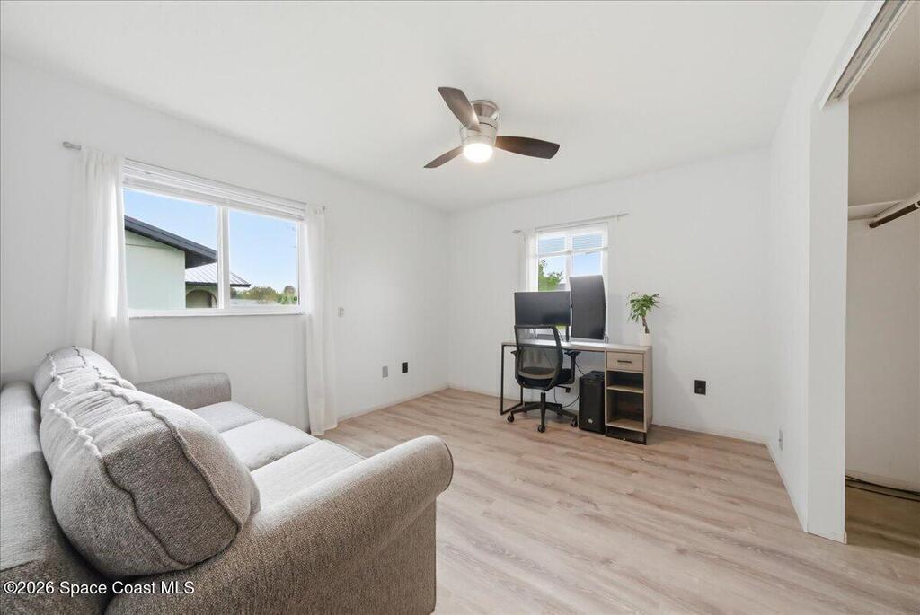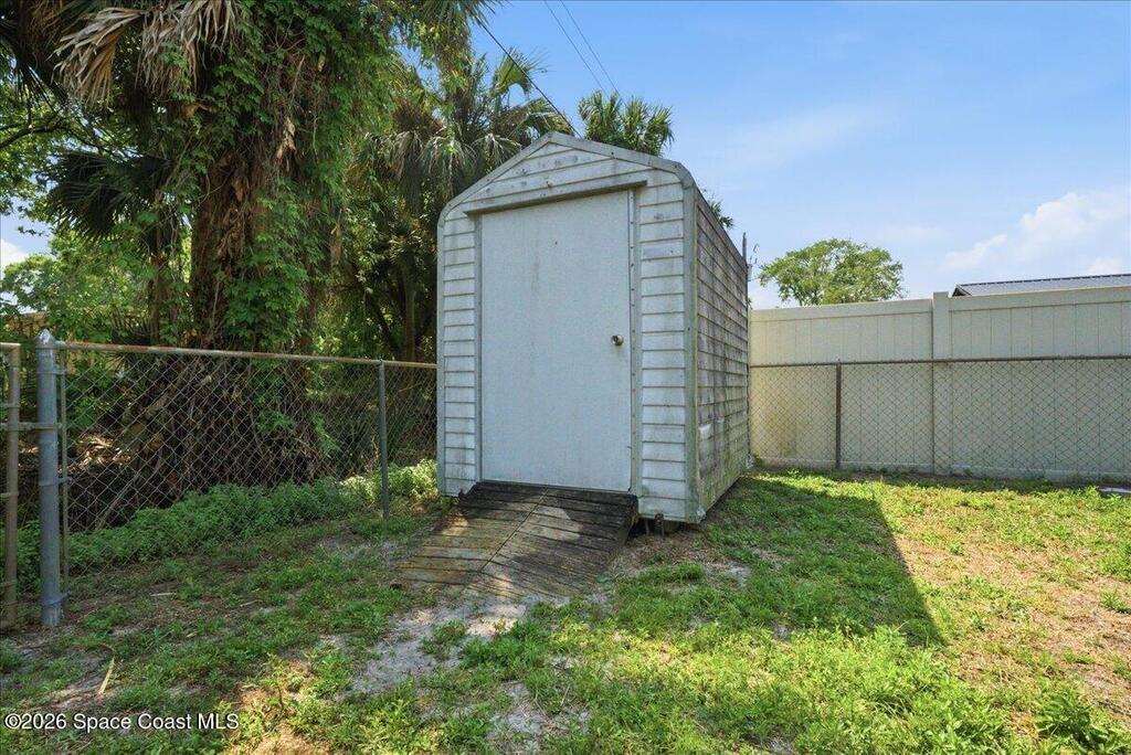 Charming 3 bed, 2 bath home in Titusville with 1,336 sq ft of living space! Featuring a desirable split floor plan, this residence offers privacy and ease of living. Highlights include an enclosed, air-conditioned and roofed extension off the back patio for extra usable space, a fully fenced backyard, and a handy small lawnmower storage shed. Situated on a generous lot, this home is perfect for relaxing or entertaining outdoors. Convenient location near schools, beaches, and amenities. Move-in ready and waiting for you!