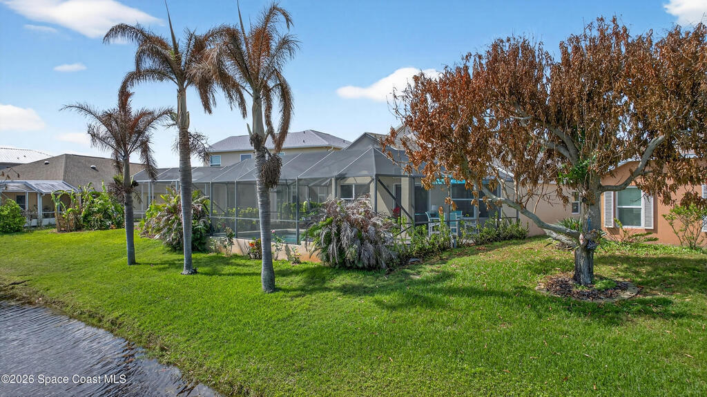 This exceptional LAKEFRONT/ POOL Suntree home is now AVAILABLE! Newly installed impact windows & slides , this property boasts a range of exciting updates, including new light fixtures, flooring, and bathrooms brand new exterior paint . The impressive salt system pool and spa, complete with color-changing lights and a classic paver deck, is the perfect spot to unwind, while the pool heater ensures year-round enjoyment. The stunning water view and beautifully appointed kitchen, featuring granite countertops, high-end appliances, and a gorgeous tile backsplash, are sure to delight. The primary bedroom suite has been thoughtfully updated with double vanities, stylish tile, and a spacious walk-in closet. Roof installed in 2016 and a charming paver driveway, this home is truly move-in ready. Its prime location, just 15 minutes from PAFB and the beach, and surrounded by golf courses. Ammenities includes: club house, tennis courts, playground ,gym and basketball court!