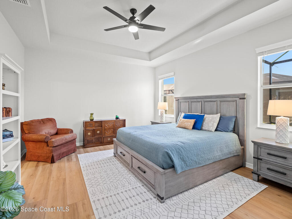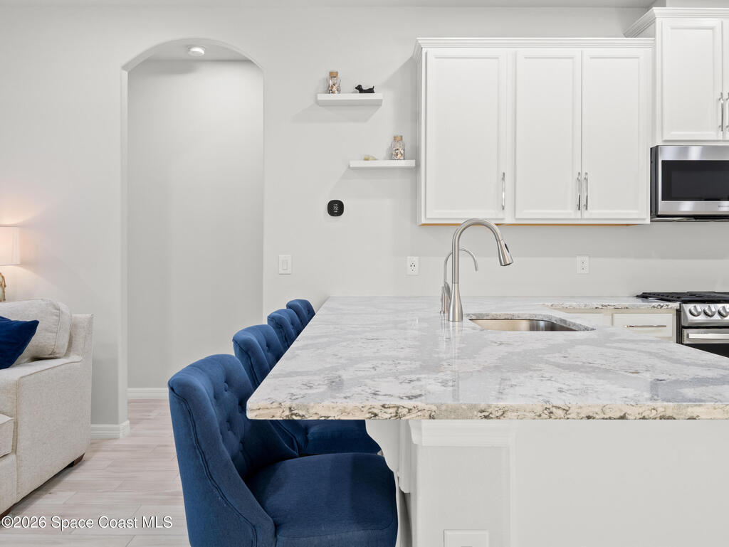 Just listed in Sendero Cove, this like-new home shows like a model and offers the best of Viera living. Featuring four bedrooms, three bathrooms, and a two-car garage, the home welcomes you with gorgeous wood-grain tile flooring throughout the main living areas and luxury vinyl plank flooring in all bedrooms. The stunning designer kitchen includes solid wood cabinets, quartz countertops, a large breakfast bar, and a pantry enhanced with custom storage shelving. The spacious living room and separate dining area create an ideal layout for both everyday comfort and entertaining. The large primary suite is a true retreat, offering an updated walk-in shower with modern tile, dual vanities, a private water closet, and a huge custom walk-in closet. The split floor plan provides excellent privacy, and one of the secondary bedrooms features ensuite access--perfect for guests or multigenerational living. This home is loaded with thoughtful upgrades:
