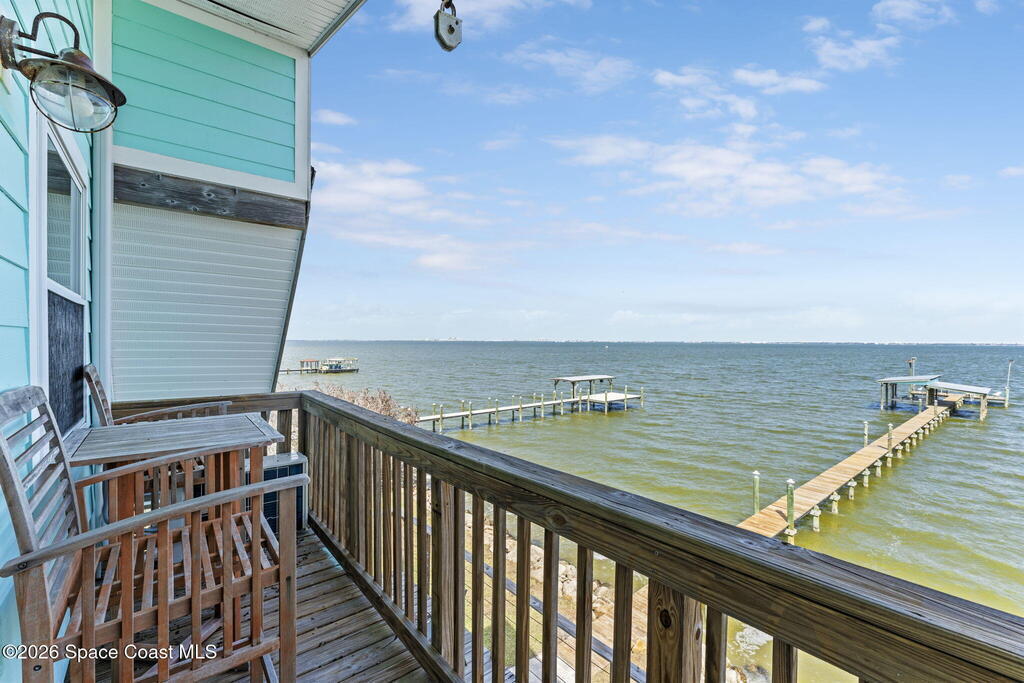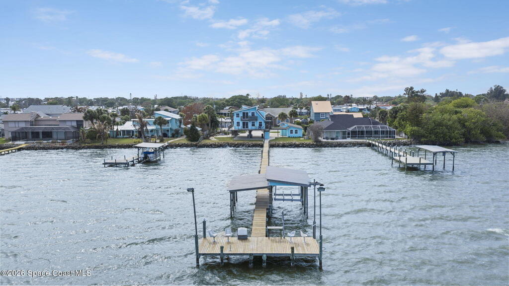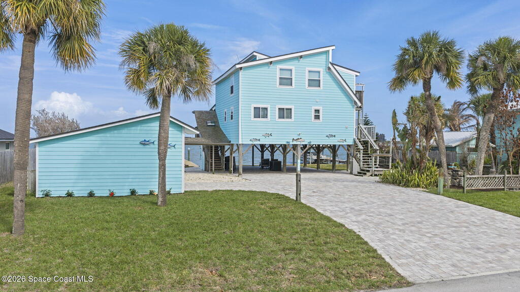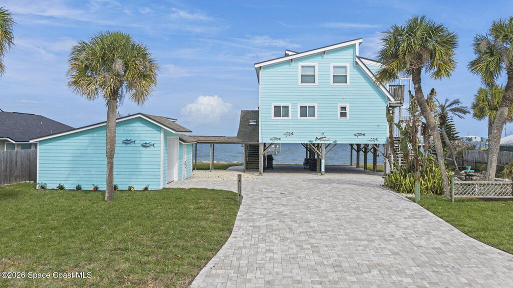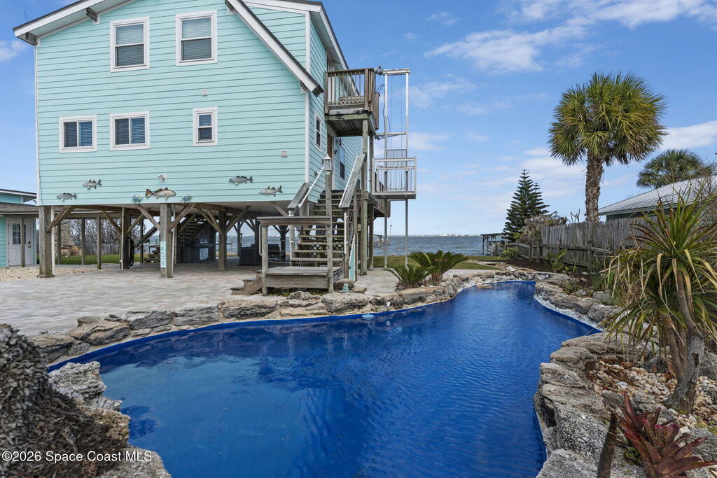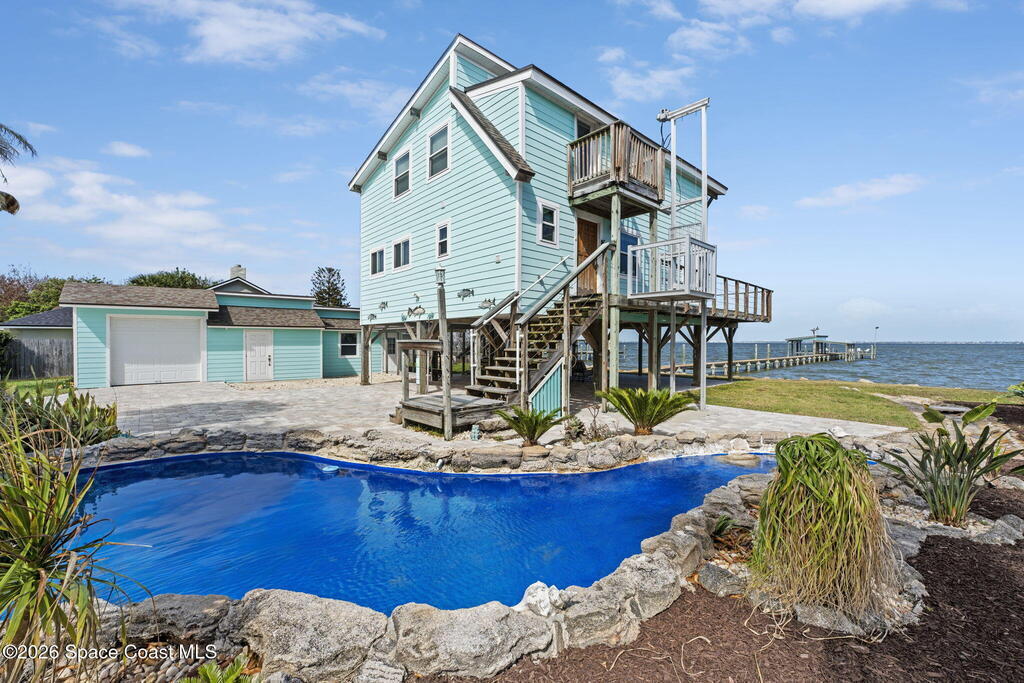 If Florida had a home, this would be it. Completely renovated, this elevated stilt home sits directly on the Banana River with wide open water views and direct access to Port Canaveral. Enjoy everything the Space Coast has to offer, from dolphins and manatees in your backyard to rocket launches overhead. A private dock with boat lift makes getting out on the water a breeze. Inside, the home offers 3 bedrooms, 2 full baths, and 2 half baths with an open layout centered around a chef's kitchen featuring quartz countertops and stainless steel appliances, flowing into the main living and dining areas with the river views front and center. The primary suite includes a private balcony overlooking the water. Outside, enjoy a pool, stone fireplace, and a paver driveway set within a well maintained yard. A detached air conditioned flex space with river views offers options for an office, studio, or additional living area. Well updated and positioned for true waterfront living.