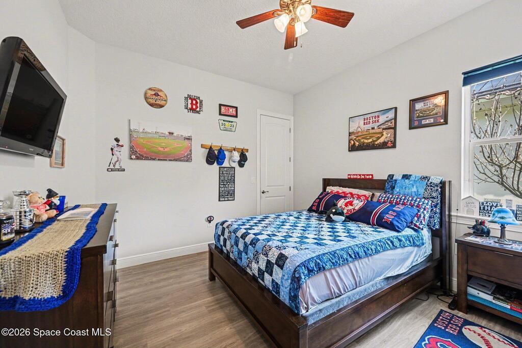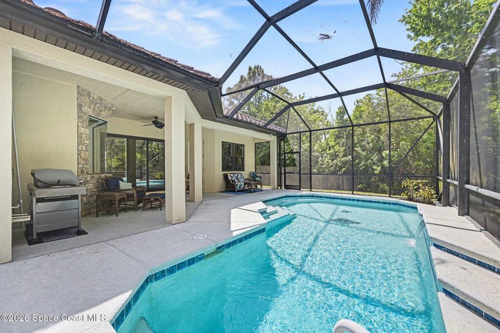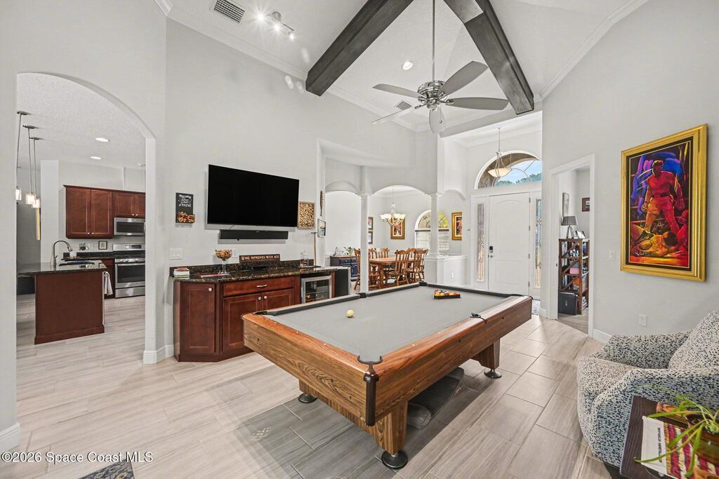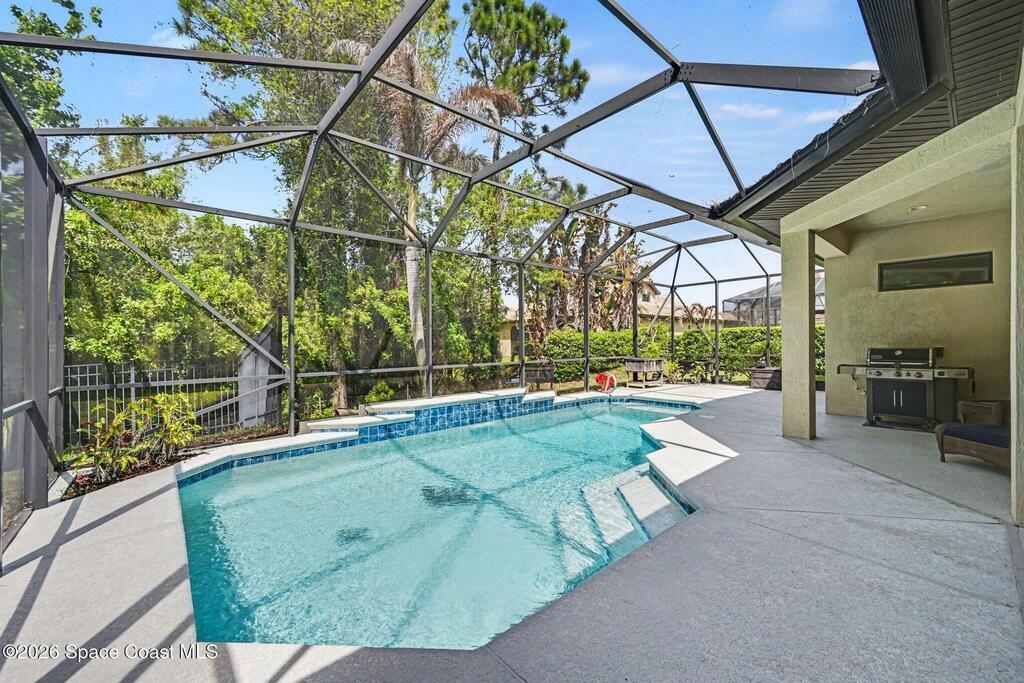Custom-built pool home on a quiet cul-de-sac in Tralee Bay, Capron Ridge's premier estate community, offering 4 bedrooms, 2.5 baths, and a 3-car garage with peaceful preserve views. Quality craftsmanship includes 8' interior doors, premium vinyl plank flooring, tray ceilings, crown molding, and wood-stained ceiling beams. The island kitchen features granite countertops, stainless appliances, 42'' soft-close cabinetry with crown, and a butted glass window framing the preserve. A flexible fourth bedroom with closet works beautifully as a guest room or home office. The game room includes a mini bar with granite top and refrigerator. Tile roof and stone-accented entry enhance curb appeal, while impact-rated windows, sliders, and French doors provide peace of mind. Capron Ridge amenities include a resort-style pool, tennis courts, and playground. HOA includes lawn care and irrigation. Don't forget to pack the sunscreen, you're less than 20 minutes to the beach.