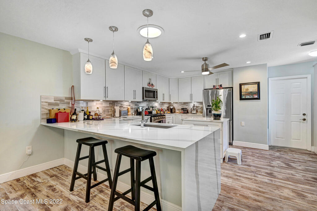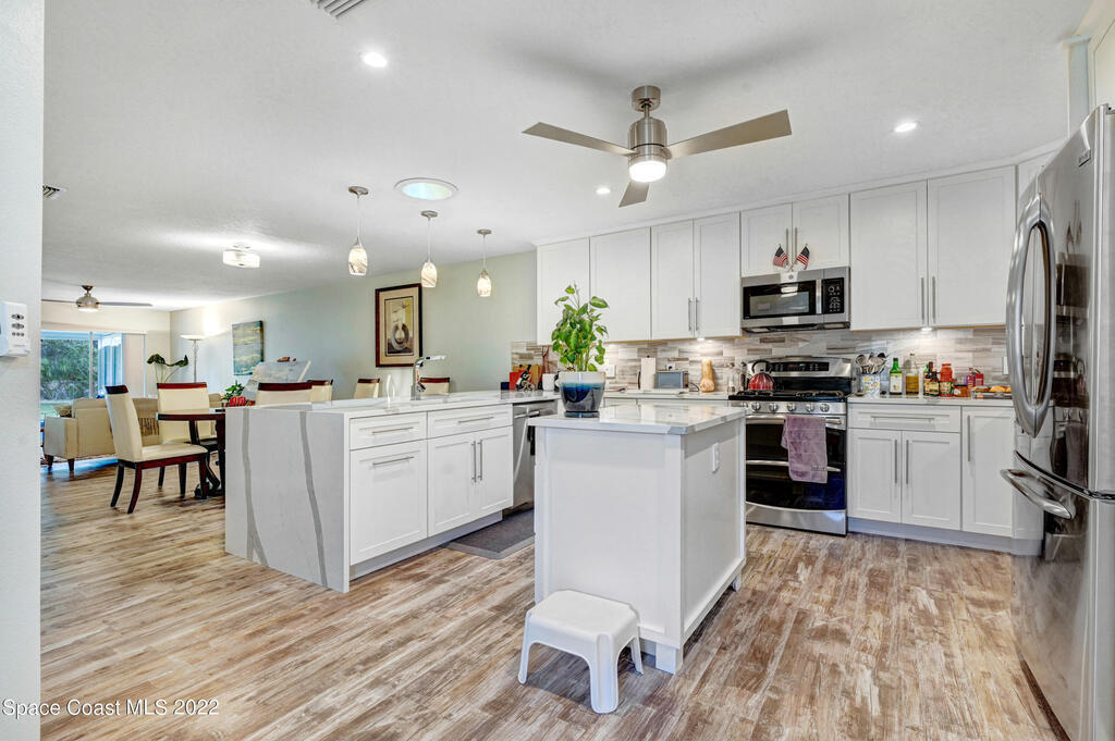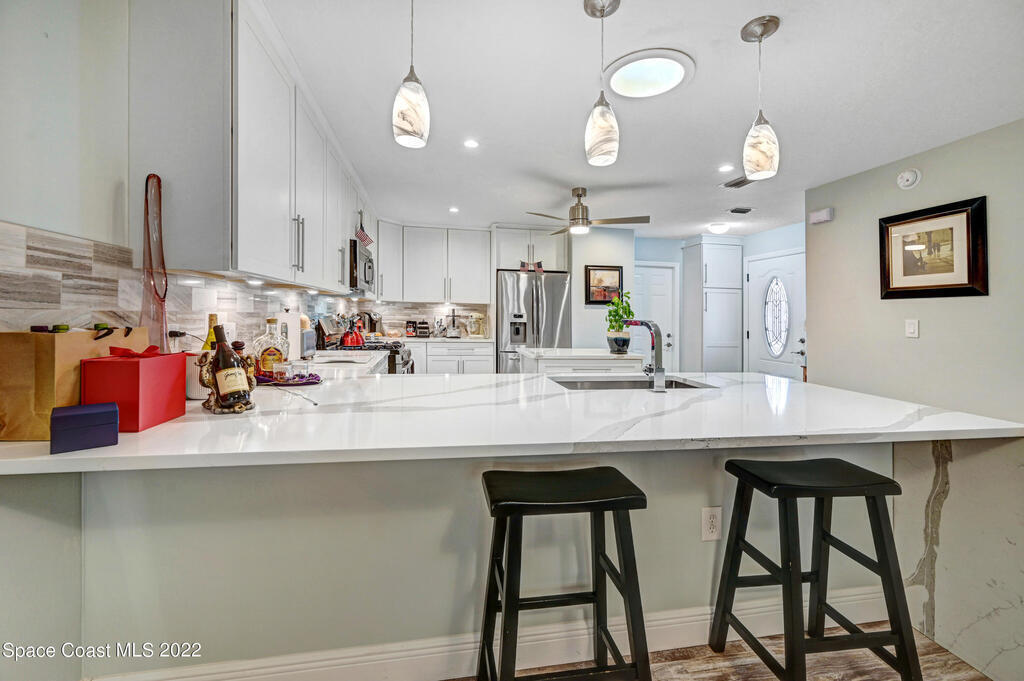 State the art renovation!! Complete modernization making this a stunning place to live. This waterfront Gated community offers many amenities (pool, river dock, park area, tennis, clubhouse). And located close to all areas of Brevard County. This one-story condo/villa style home offers 2-bedroom, 2 bath & 2 car garage PLUS fully furnished. Presently the 2nd bedroom is set up for an office & has a queen murphy bed installed. The kitchen touts all wood white cabinetry, generous island, expansive breakfast bar with waterfall quartz countertop, lots of storage, stainless steel appliances & gas stove. Suitable for the most discerning chef. Generous open floor plan overlooking green space with screened patio. Bathrooms offer full zero entry, all tile, glass enclosures, modern vanities & chrome fixtures. Stunning Ceiling fans throughout. Rent includes cable, Disney+, Internet. Sun Tunnels provide extra bright & cheery light. House salt treatment water softener system. Stunning Villa!