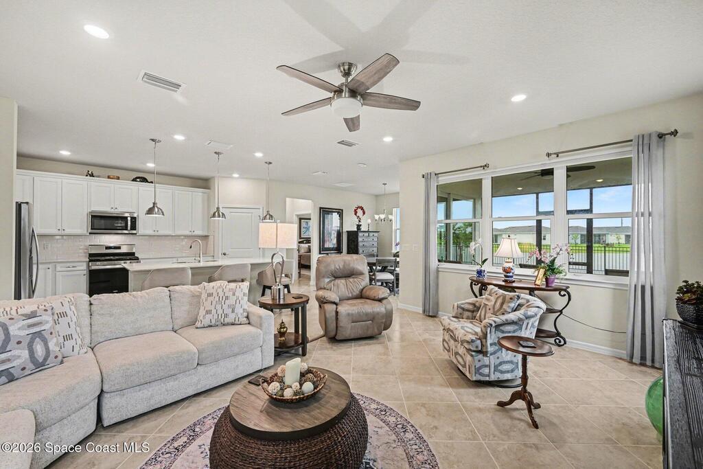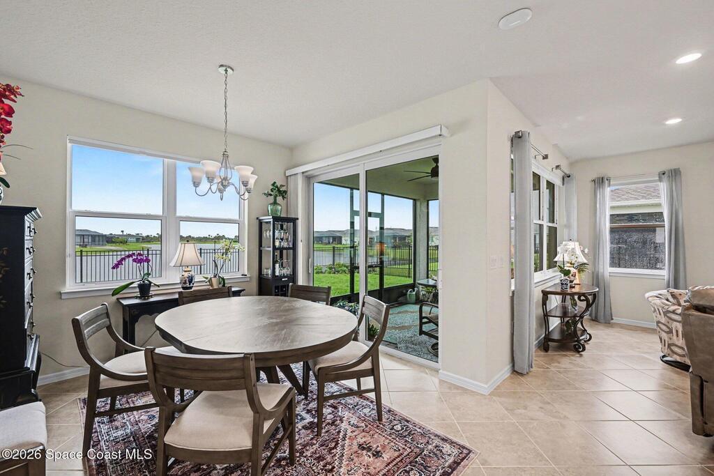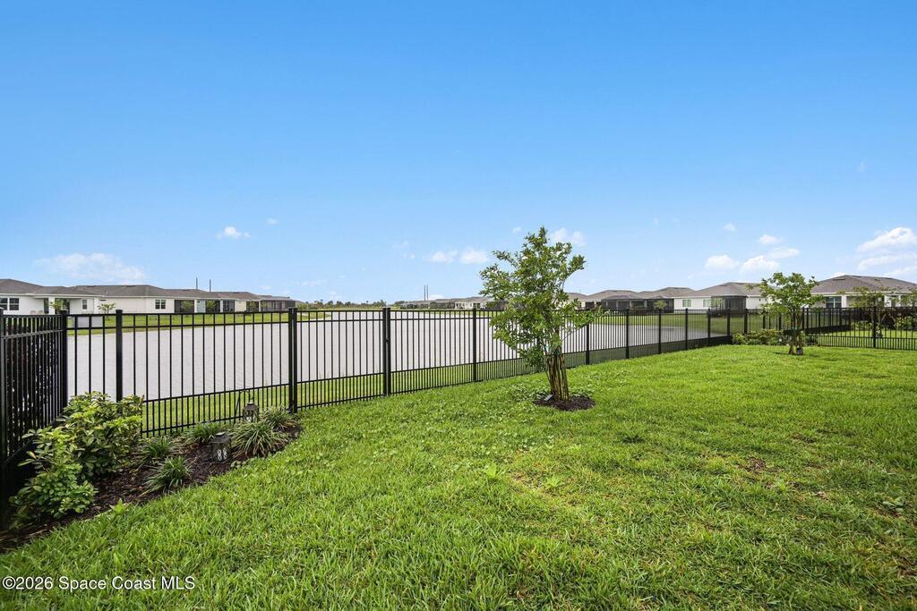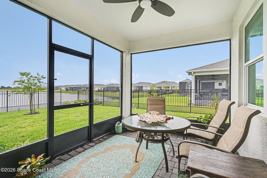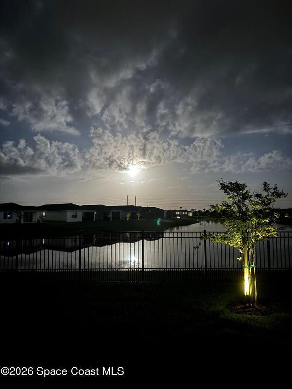 This lakefront, oversized premium lot has 3 full bedrooms and 2 full baths. This is a favorite Del Webb model called Mystique. You can enjoy from your screened lanai amazing sunset & unobstructed water views. It is move in ready for you to start enjoying life in an active resort-style community. Entertaining is easy with a large open concept gathering room, kitchen with large island, and cafe. Included are window treatments, ceiling fans & lighting fixtures. The upgraded laundry room has both upper, lower cabinets, a large sink & a built-in storage closet. Chef's kitchen has upgrades such as quartz countertops, stainless steel Whirlpool appliances, upgraded sink/faucet, backsplash, and much more. The oversized 2-car garage with epoxy flooring was extended by 4 feet & has an additional tandem space for parking your golf cart. Ceramic tile flooring throughout the home. Fire alarm & security systems are installed. The yard is private with its iron fence & puppy picket for your pet.