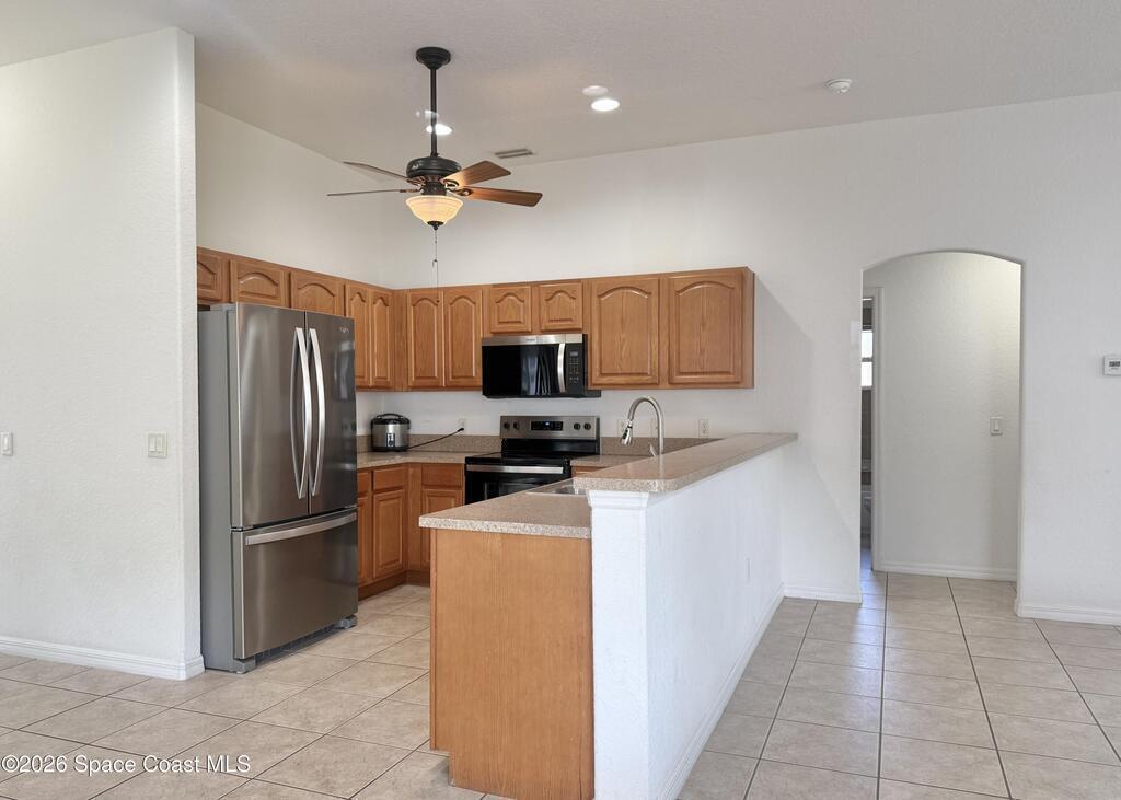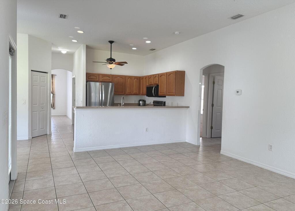 Centrally located in desirable Whispering Winds community of West Melbourne, ideally suited for corporate relocation orprofessional tenancy. This spacious residence offers a split floor plan with four bedrooms, or three bedrooms plus a dedicated homeoffice, and two full bathrooms across nearly 2,200 square feet of well-designed living space. The home is move-in ready and features brand-new appliances, including a refrigerator, electric cooktop, and oven.The split layout provides privacy for the primary suite, which includes a large walk-in closet, dual vanities, and an oversizedsoaking tub enhanced by abundant natural light. Multiple living and dining areas - including a formal dining room, family room, and a bright, open-concept kitchen - create a comfortable and functional environment for both everyday living and entertaining. The kitchen also features a generous pantry, breakfast bar ideal for casual meals. A large backyard offers a peaceful