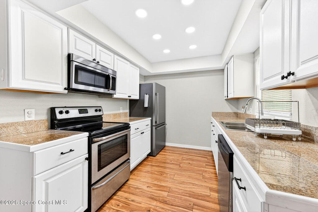 Beautifully updated 3-bedroom, 2-bath home with attached garage on a quiet cul-de-sac. Perfectly located near Wickham Park and close to shopping, dining and entertainment. The light-filled open floor plan features recessed lighting, stainless steel appliances, modern bathroom fixtures, impact sliding glass doors and window, with hurricane shutters for all other openings. A centrally located atrium brings radiant sunshine into the heart of the home, complemented by skylights and ceiling fans throughout. The primary ensuite and second bedroom were uniquely redesigned with the addition of private sitting areas with French doors--ideal for a home office, study, or reading nook. The floor-to-ceiling door walls frame pleasant garden views and flood the rooms with natural light. The home is a blend of easy living in a peaceful setting conveniently close to US1 and Wickham Road.