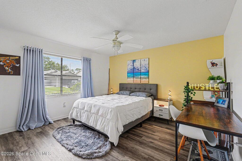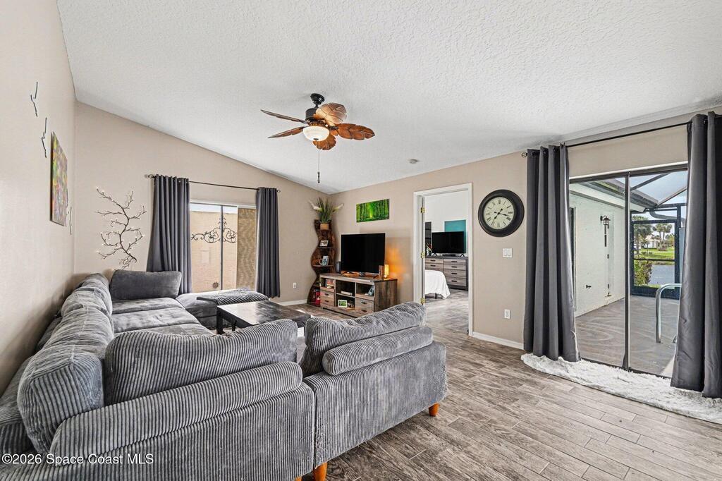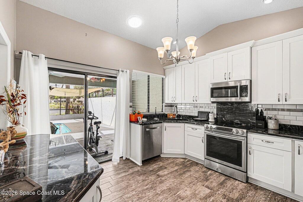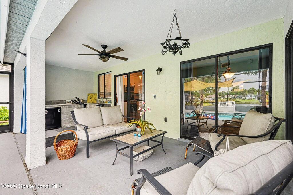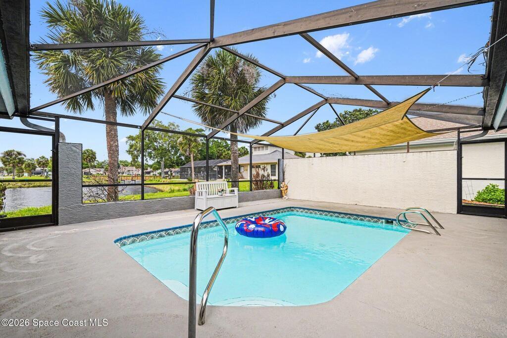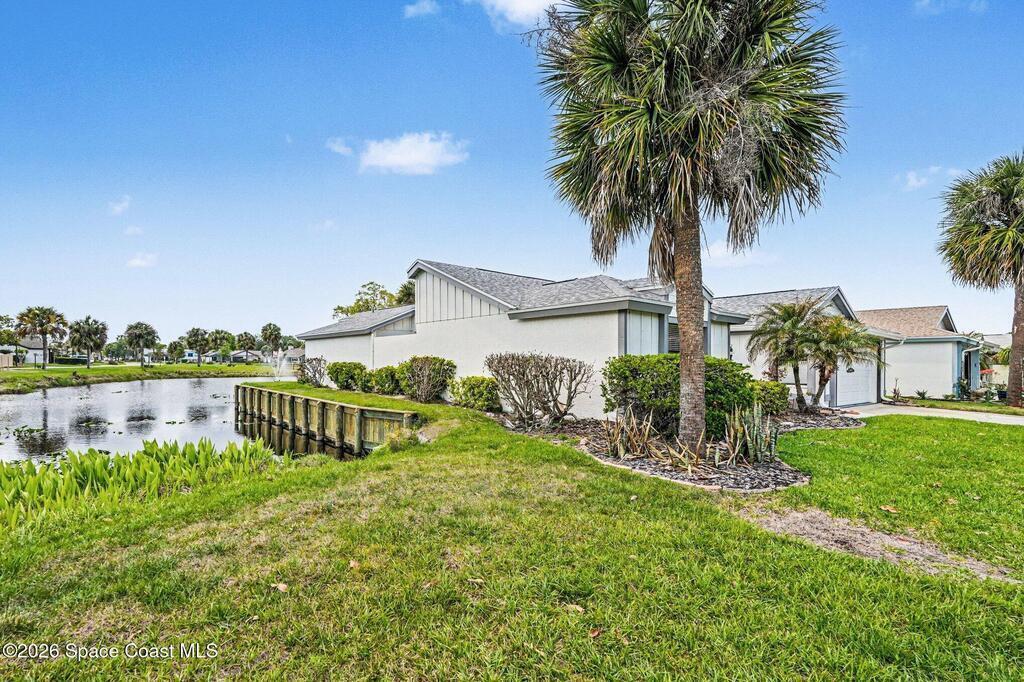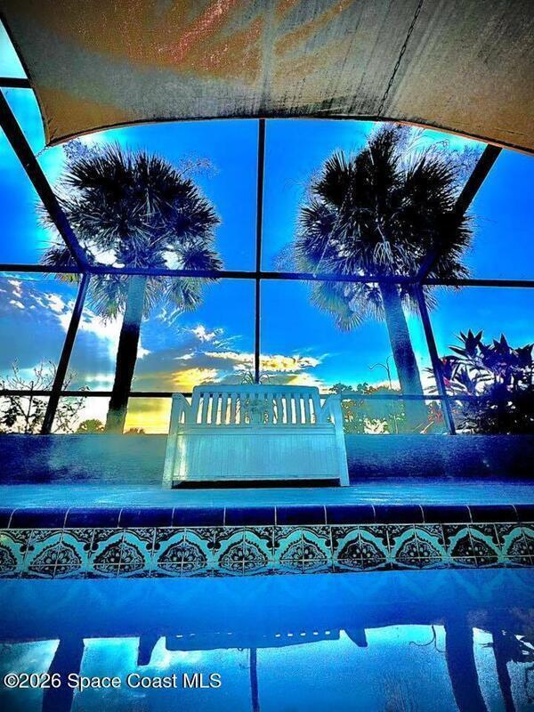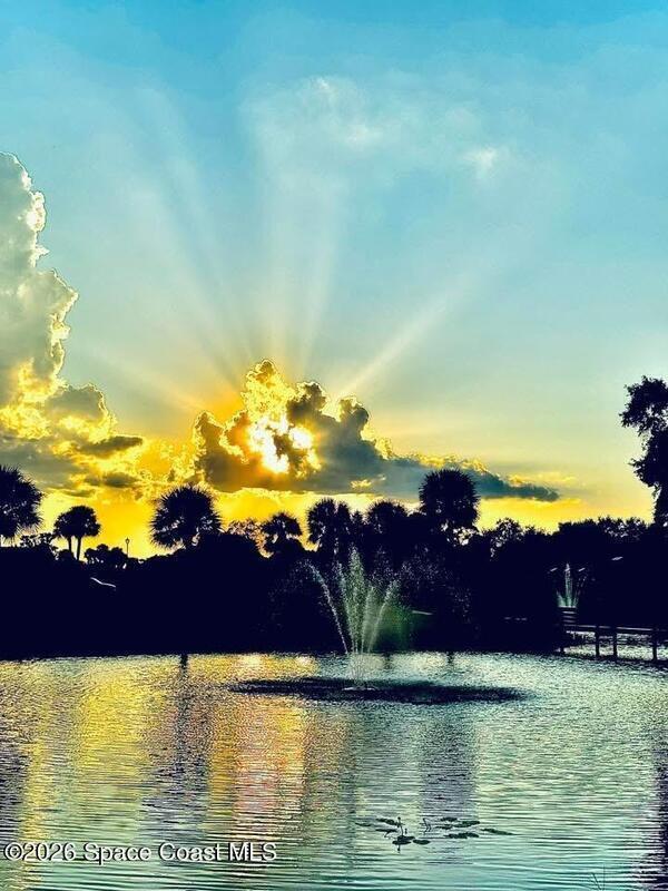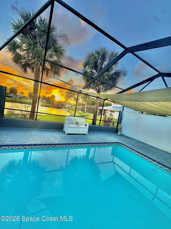 This waterfront corner lot--just steps from the clubhouse--is truly one of the finest homesites in Country Walk at Suntree. This beautifully maintained 3-bedroom, 2-bath pool home features a bright, open floor plan filled with natural light, showcasing stunning water views and breathtaking sunsets.The updated kitchen offers white cabinetry, granite countertops, a stylish tile backsplash, and newer appliances, including a glass-front, two-door refrigerator with a built-in beverage center. The spacious primary suite includes a walk-in closet and a private en-suite bath with oak cabinetry, a jetted tub, and a tiled walk-in shower.Porcelain tile flooring runs throughout the home, adding both elegance and durability. Additional upgrades include an air conditioned laundry room and a newer roof and skylight (2019).Step outside to your private oasis featuring a solar-heated pool, screened lanai and a fully equipped outdoor kitchen with sink and refrigerator, perfect for entertaining.