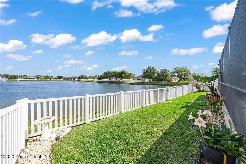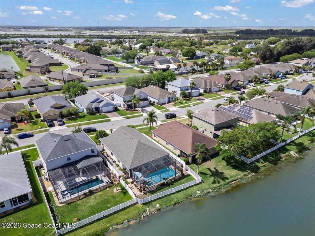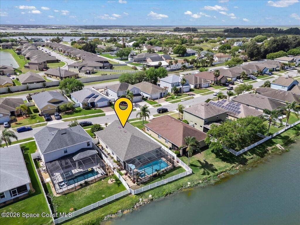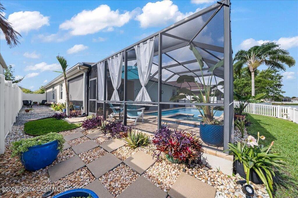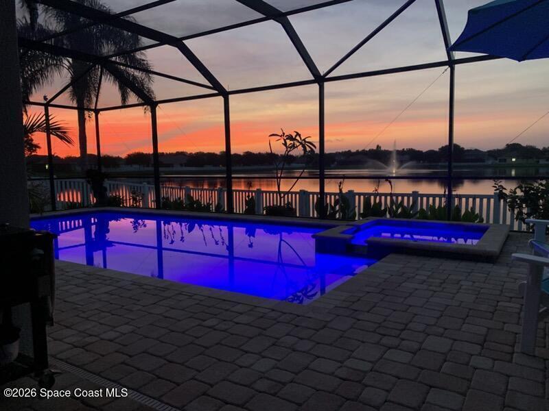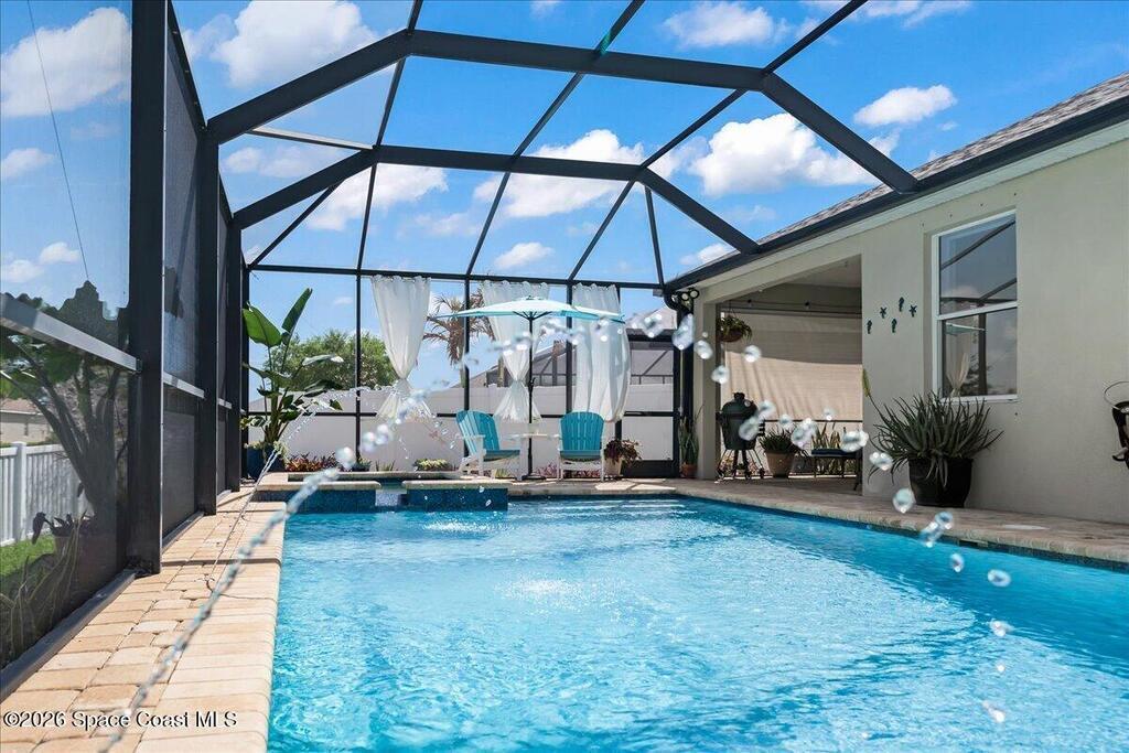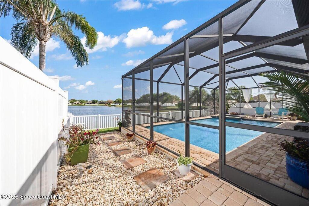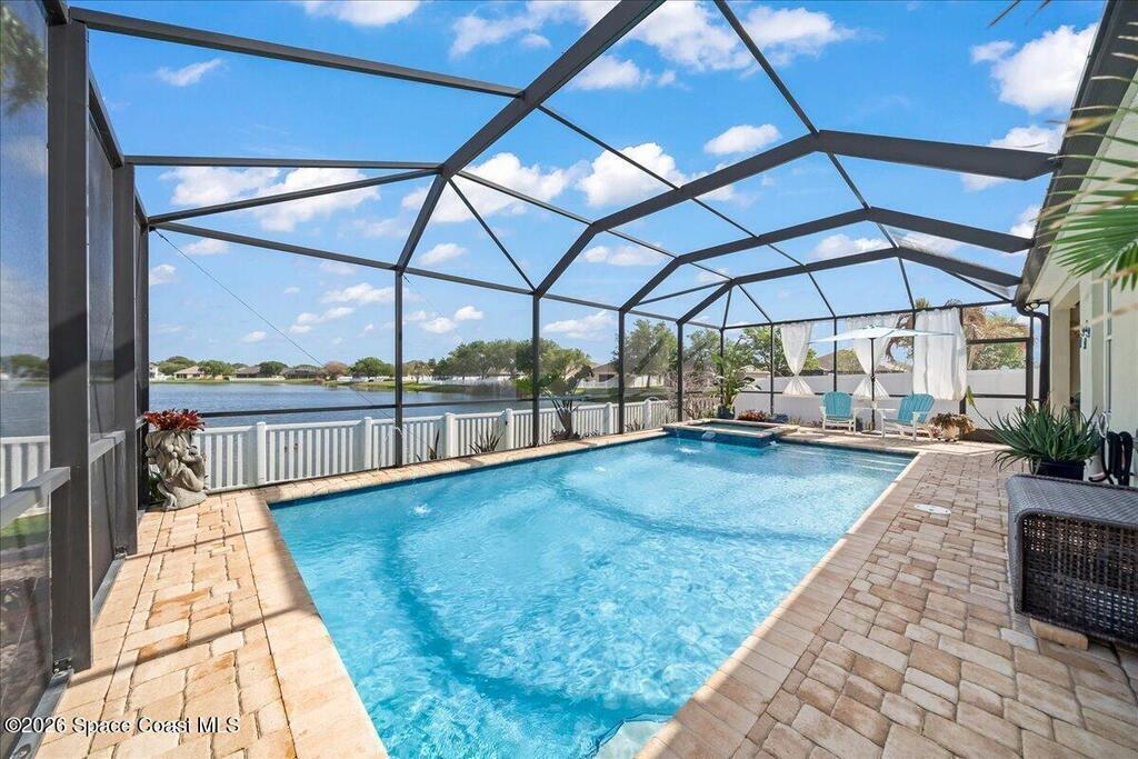 Impeccably maintained waterfront pool home in sought after Phillips Landing. This turnkey residence features a new roof, seamless LVP flooring, plantation shutters, a fenced yard, and fresh interior and exterior paint throughout. Start your mornings with a cup of coffee as you watch the water come to life, and spend your evenings unwinding in your private outdoor oasis surrounded by serene views and local wildlife. The screened pool and spa, heat pump, and new UV2 Paramount reverse osmosis cleaning system create the perfect setting for both relaxation and entertaining. The spacious primary suite offers a beautifully updated bath with a large walk in shower. Additional highlights include A/C replaced in 2020, a generator ready 200 amp panel, hurricane shutters, 3M window tint, a sprinkler system, and lush landscaping. Ideally located near shopping, dining, Patrick Space Force Base, and Cape Canaveral. Welcome Home!