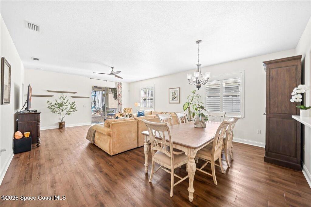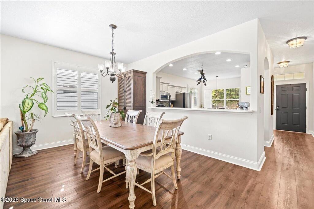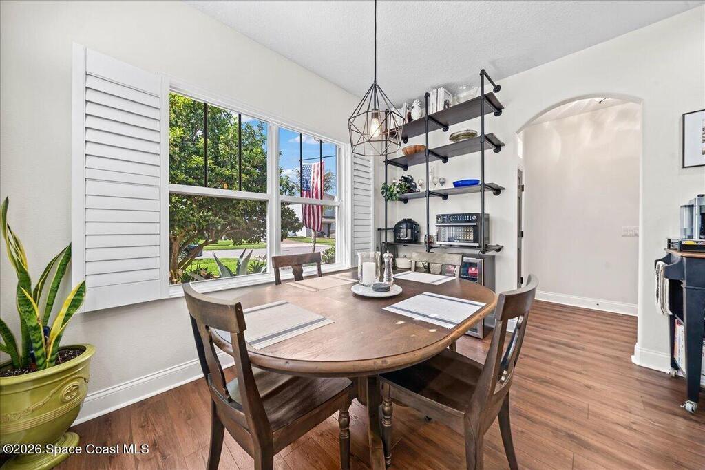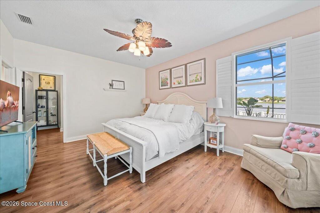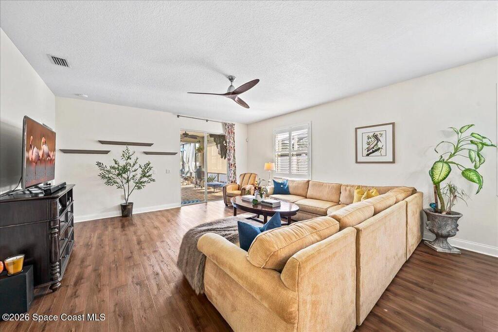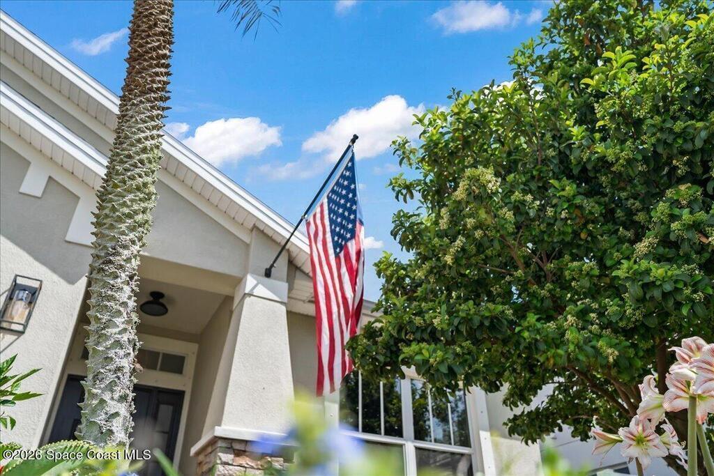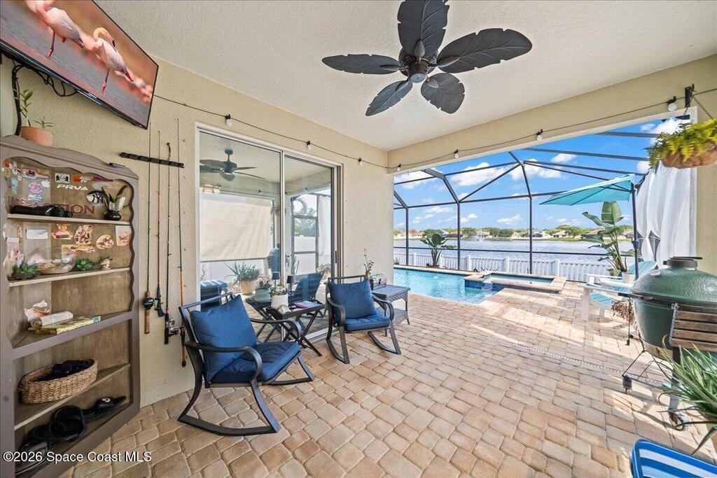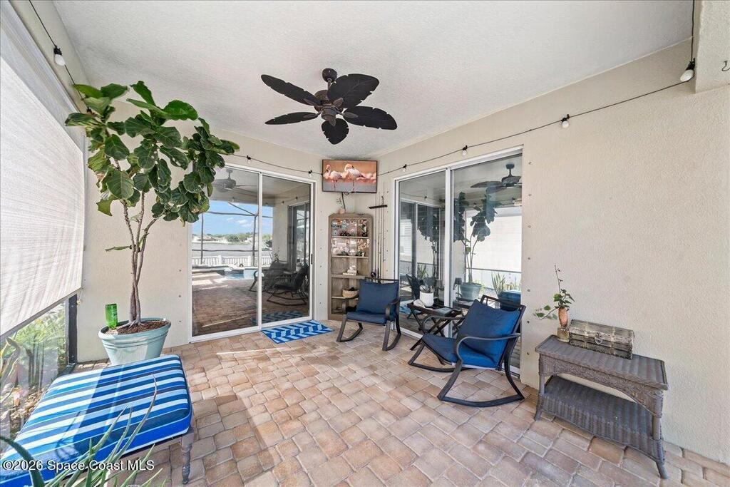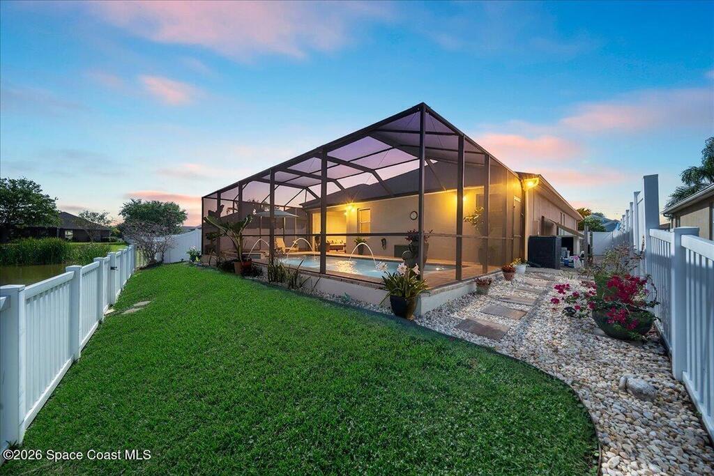 Impeccably maintained waterfront pool home in sought after Phillips Landing. This turnkey residence features a new roof, seamless LVP flooring, plantation shutters, a fenced yard, and fresh interior and exterior paint throughout. Start your mornings with a cup of coffee as you watch the water come to life, and spend your evenings unwinding in your private outdoor oasis surrounded by serene views and local wildlife. The screened pool and spa, heat pump, and new UV2 Paramount reverse osmosis cleaning system create the perfect setting for both relaxation and entertaining. The spacious primary suite offers a beautifully updated bath with a large walk in shower. Additional highlights include A/C replaced in 2020, a generator ready 200 amp panel, hurricane shutters, 3M window tint, a sprinkler system, and lush landscaping. Ideally located near shopping, dining, Patrick Space Force Base, and Cape Canaveral. Welcome Home!