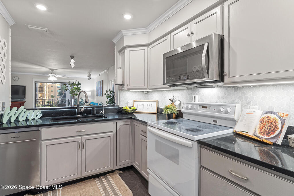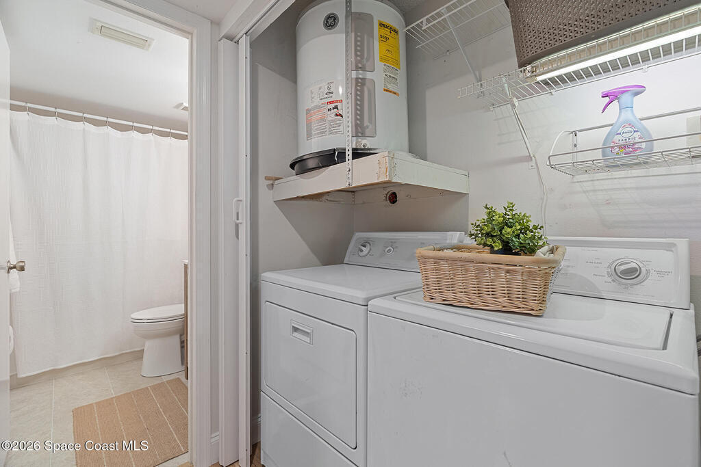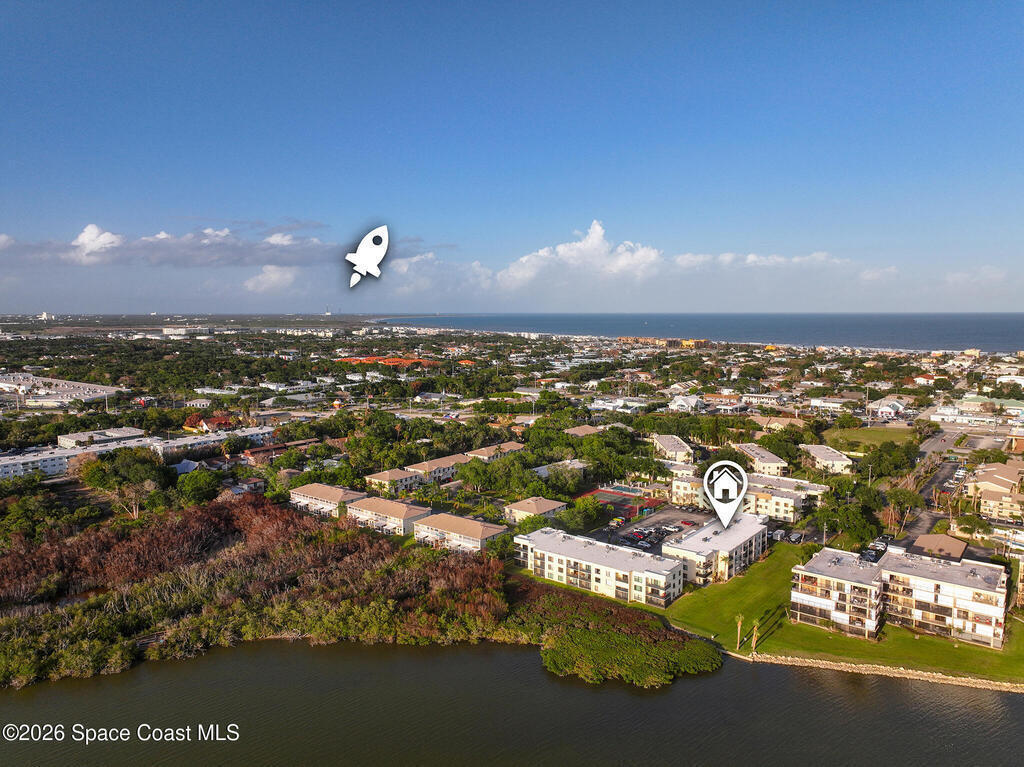 WATCH THE VIDEO/VIRTUAL TOUR! Move-in ready condo with SUNSET WATER VIEW BALCONY in Cape Canaveral, just a 40-min drive to Orlando. Bright OPEN FLOOR PLAN with UPDATED BATHROOMS & FLOORING throughout. SPACIOUS KITCHEN with NEW DISHWASHER (2025) and great storage. Primary bath features NEW VANITY; hallway bath includes NEW CABINET, TOILET, FLOORING, MIRROR, LIGHT & FAUCET FIXTURES. Enjoy stunning BANANA RIVER VIEWS and watch ROCKET LAUNCHES from Kennedy Space Center from the unit's front door. Community offers KAYAK ACCESS to river. Major updates: NEW HVAC (2025) & NEWER ROOF (2023, HOA). PRIVATE INDOOR LAUNDRY with WASHER/DRYER included. NOT IN FLOOD ZONE, no storm issues. HOA includes UNIT'S WATER USAGE, LANDSCAPING, EXTERIOR MAINTENANCE, POOL, SPA, SAUNA, TENNIS/PICKLEBALL, KAYAK STORAGE & CAR WASH AREA. LESS THAN 1 MILE TO BEACH, near PORT CANAVERAL & COCOA BEACH PIER. About 1 hour drive to Disney, Universal & SeaWorld.**Unit is on 3rd floor accessed by exterior stairs, no elevator.