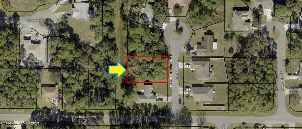 0.23 acre buildable residential lot available in Port Malabar Unit 41 of Palm Bay. Located in the northwest section, this lot has a drainage right-of-way easement canal in the rear allowing more privacy, and is just 3.1 miles - 7 minutes to Heritage High School, 4.8 miles - 12 minutes to the Winn Dixie Supermarket, 15.4 miles - 26 minutes to Melbourne Airport, and 16.2 miles - 37 minutes to the beaches of Indialantic. From exit #180 of I-95 go west on US-192 for .5 miles, left on St Johns Heritage Parkway for 6.1 miles, left on Malabar Road for 1.3 miles, left on Krassner Drive for 1.1 miles, right on Holly Avenue for .1 mile, left on Red Bud Circle, and right on Fiji Court. The lot will be on your left.
