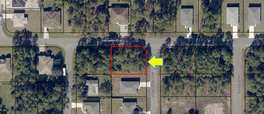 0.28 acre buildable residential corner lot available in Port Malabar Unit 25 of Palm Bay. Located in the southeast section, this lot is just 3.6 miles - 7 minutes to Westside Elementary School, 3.9 miles - 8 minutes to the Publix Supermarket, 14.1 miles - 30 minutes to Melbourne Airport, and 19.1 miles - 32 minutes to the beaches of Indialantic. From exit #173 of I-95 go west on Malabar Road for .2 miles, left on San Filippo Drive for 6.3 miles, left on Lowry Boulevard for .5 miles, right on Hallmark Street for .1 mile to Hainsworth Avenue. The lot will be on your left at the southwest corner with Hallmark.