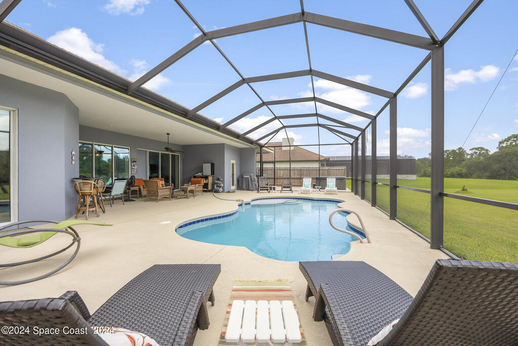Welcome to this stunning 1-acre estate nestled in the highly desirable Woodshire Preserve of Lake Washington! This magnificent 6-bedroom home features 4 bathrooms, a 3-car garage, a generous lanai, and a screened-in heated pool. Upon entering the foyer, you'll be captivated by the expansive great room, which boasts impressive coffered ceilings and picturesque views of the pool. The gourmet kitchen is a chef's dream, complete with a large island, a walk-in pantry, granite countertops, and top-of-the-line stainless steel appliances. The separate guest/mother-in-law suite offers privacy with its own entrance, closet, bathroom, and garage. Thoughtfully designed, the home features a three-way bedroom split for maximum privacy, while the luxurious primary suite is the ultimate retreat with a dual walk-through shower, a modern soaking tub, separate his-and-hers vanities, water closets, and an enormous walk-in closet. For added convenience, a pool cabana bath and a jacuzzi on the patio make