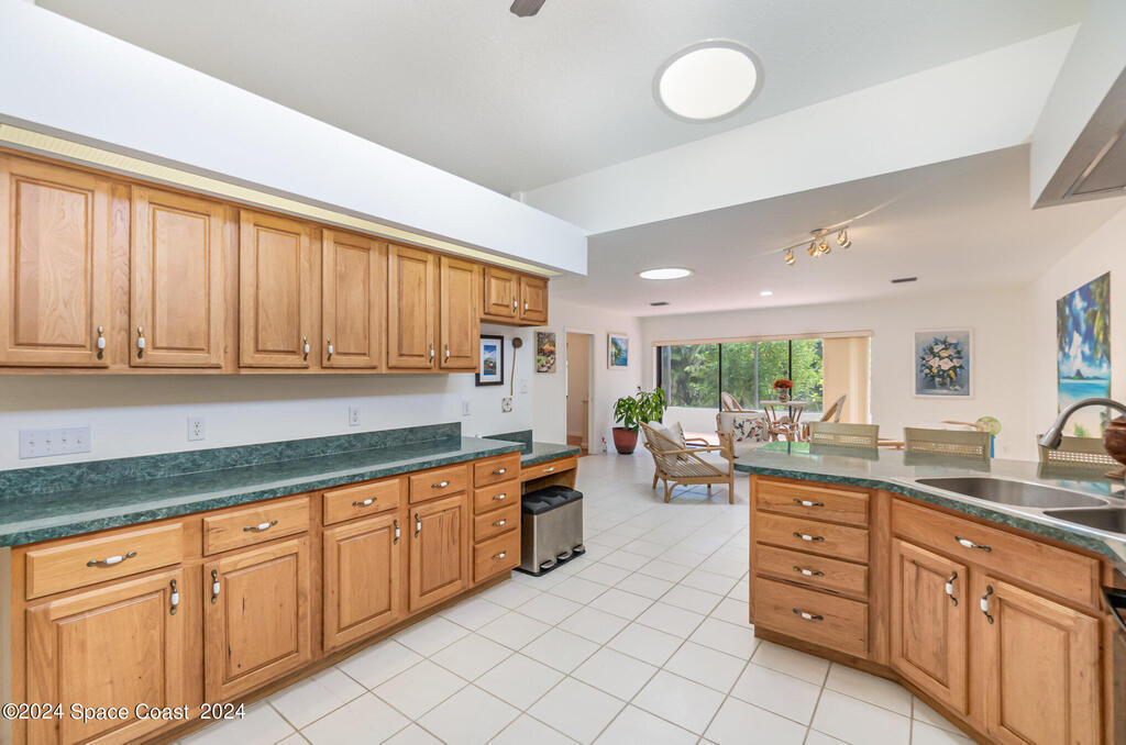 This expanded Austin model is set within a resort-style country club community, where top-notch amenities create an exceptional Florida lifestyle. From the moment you arrive, the home's striking curb appeal stands out with a newly finished AmVet concrete coated driveway and garage floor. Step inside to discover an open, airy interior filled with natural light. Vaulted ceilings and solar tubes enhance the spacious feel, creating a bright and welcoming atmosphere throughout. The split-bedroom design offers ideal privacy, especially in the guest suite, which functions like its own retreat. This suite includes two versatile rooms, a full bathroom, and a private entryway, all secured by a pocket door for added comfort and seclusion.The large kitchen is a true highlight, with abundant cabinetry and a spacious breakfast bar, perfect for casual meals or entertaining guests. The flow of the space creates an inviting atmosphere ideal for gatherings.