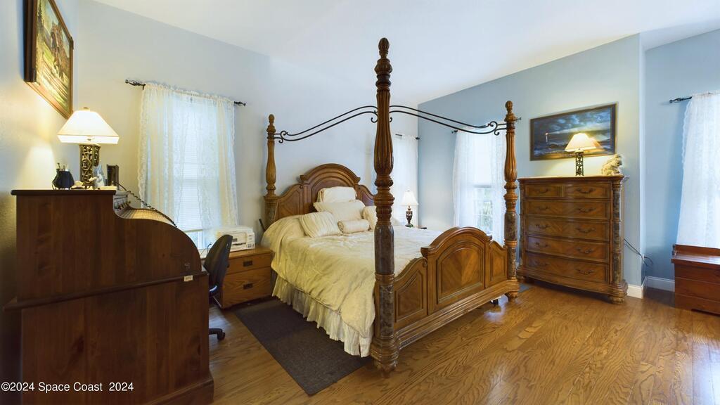 This stunning Brick Colonial-style home sits on 2.15 private wooded acres in the exclusive Windover neighborhood, featuring 4 bedrooms, 2.5 baths, and real wood floors throughout. Enjoy the sunken family room with a cozy fireplace, and a luxurious master suite with an adjacent study/den, and a master bath offering his and hers closets. The remodeled eat-in kitchen boasts a large island, pantry, and all appliances included. Additional highlights include a formal dining room, formal living room, and a dedicated laundry room, & central vacuum.Outside, relax by the screened-in pool or take advantage of the expansive 1200 sq. ft. detached garage/workshop, complete with 220 electric, a loft, and a half bath, ideal for boats, RVs, or a 5th wheel. The circular and concrete driveways offer ample parking. Enjoy Windover Park, and proximity to the Kennedy Space Center, Canaveral National Seashore, and Cocoa Beach. No flood zone, city water, sprinkler system, and a new roof (2023). Easy to show