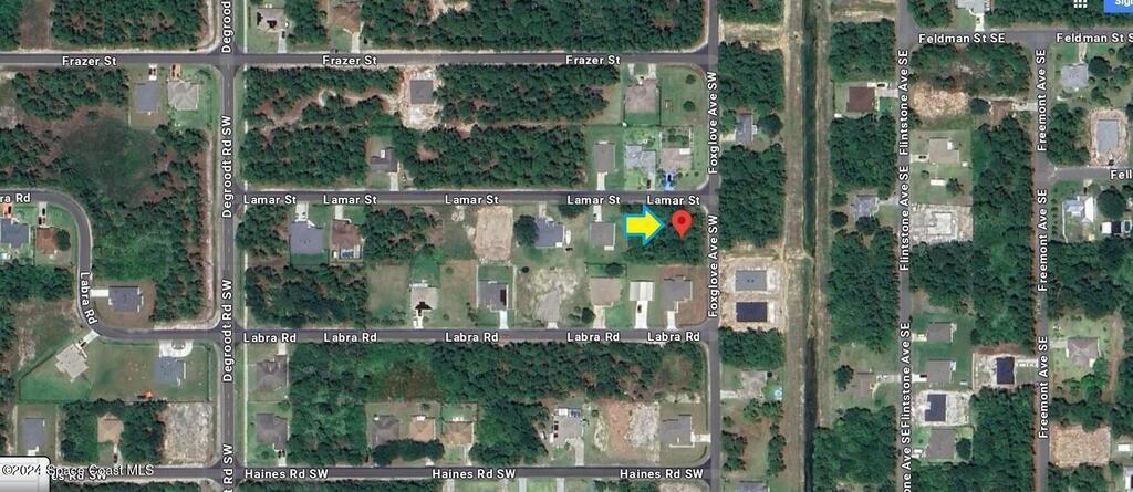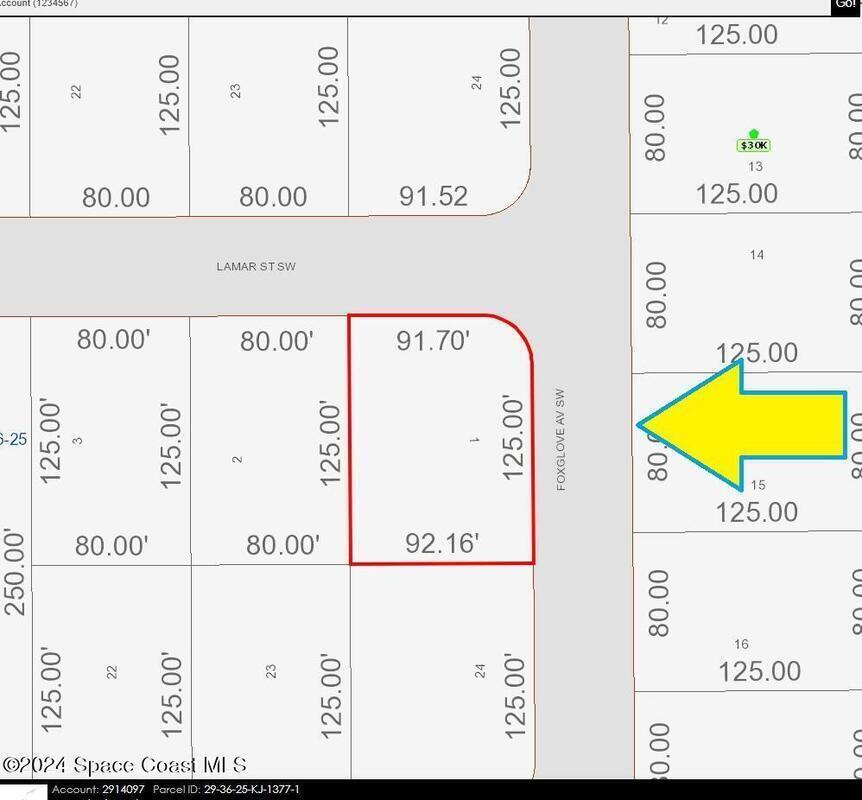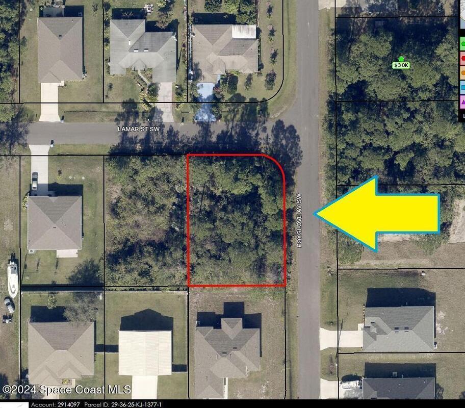 The 0.26 acre Corner residential lot is available in Port Malabar Unit 30 of Palm Bay. Located in the southwest section, this lot is just 1.6 miles - 4 minutes to Westside Elementary School, 3.5 minutes - 7 miles to the Publix Supermarket, 15.4 miles - 31 minutes to Melbourne Airport, and 17.5 miles - 35 minutes to the beaches of Indialantic. From exit #176 of I-95 go west on Palm Bay Road for .7 miles, left on Minton Road for 3.3 miles, right on Jupiter Boulevard, quick left onto DeGroodt Road for 4.2 miles, and left on Lamar Street. The lot will be on your right at the southwest corner with Foxglove Avenue.