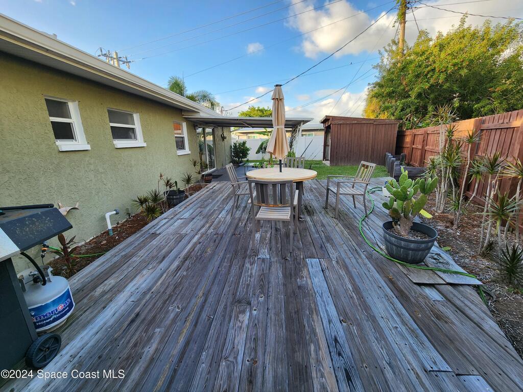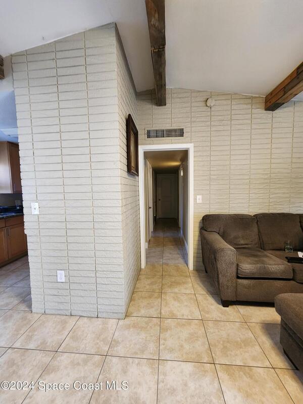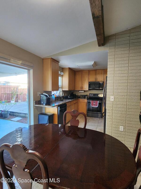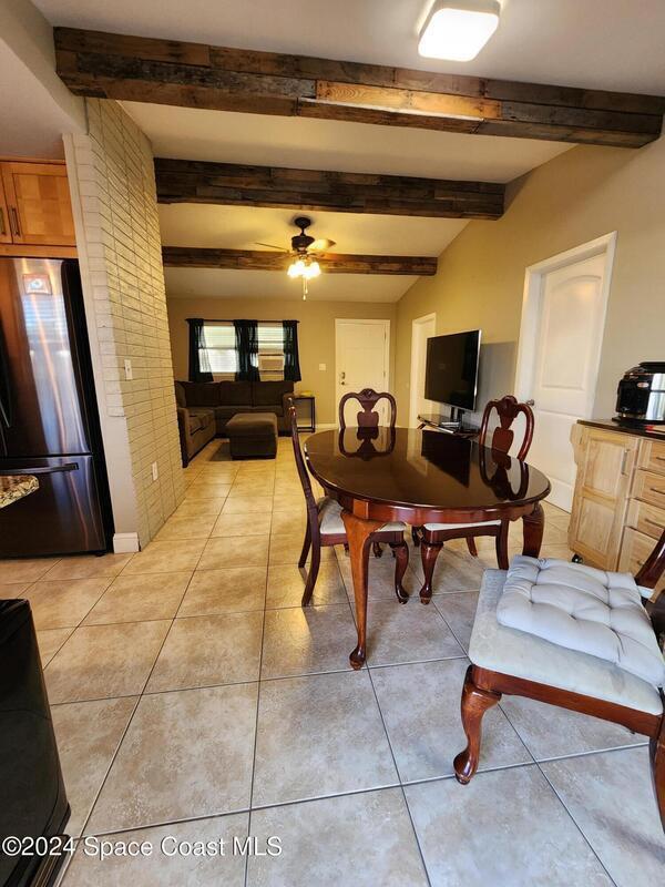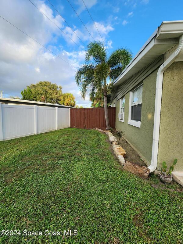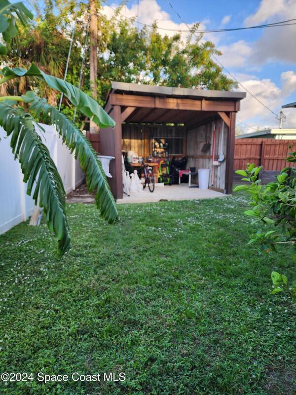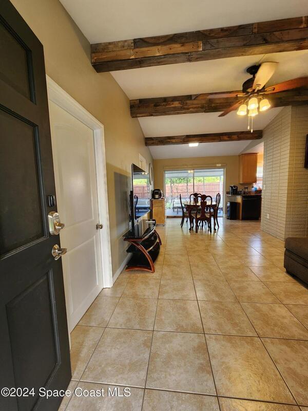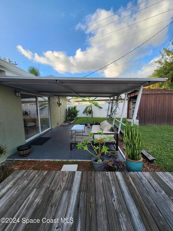 Come check out this beautiful Merritt Island home in a great location! This home sits on a corner lot with a fenced in beautifully customized and exotic backyard. The back yard has a beautiful pagoda, an opened concept storage shed, elevated deck, and meticulous landscaping. The interior boasts an open concept with vaulted ceilings in the main living area. Tiled floors throughout the home with painted brick access walls. The kitchen features granted counter tops, updated cabinets, and the second bath has an updated vanity with double sinks and gives more living space to the home.