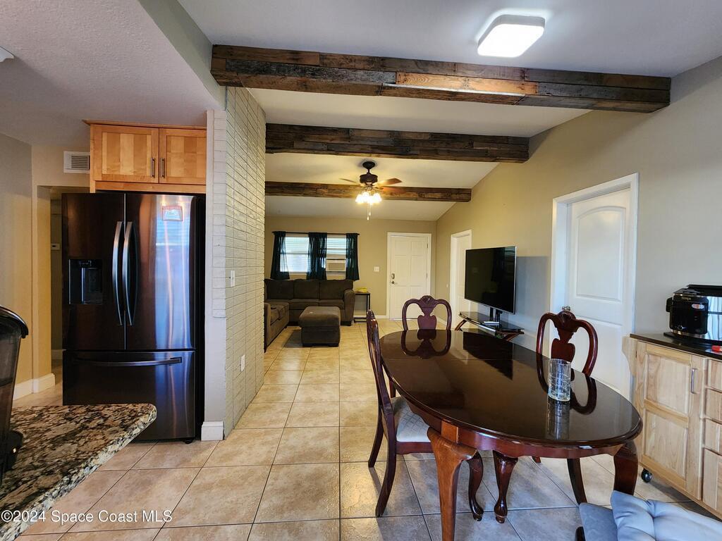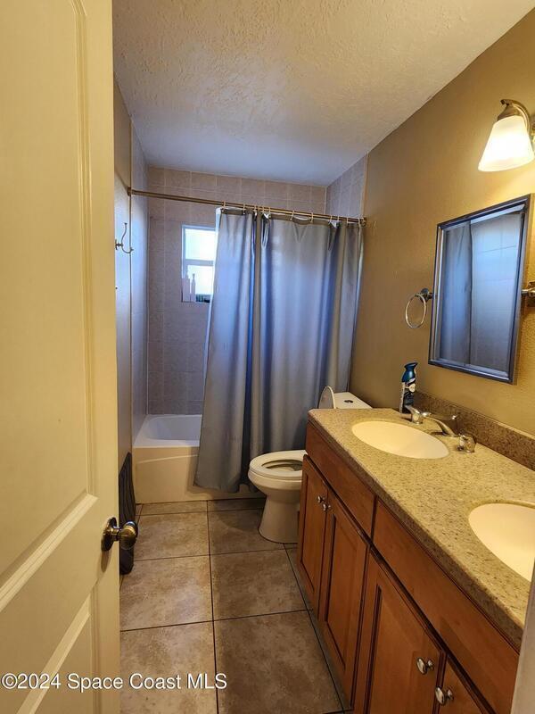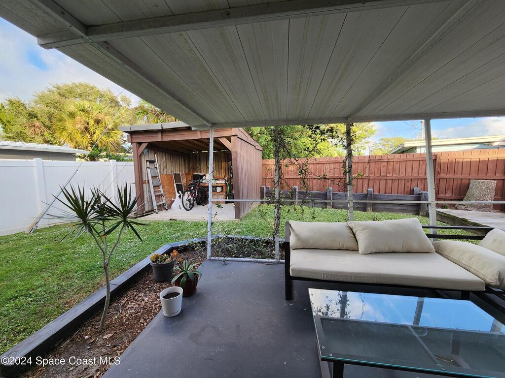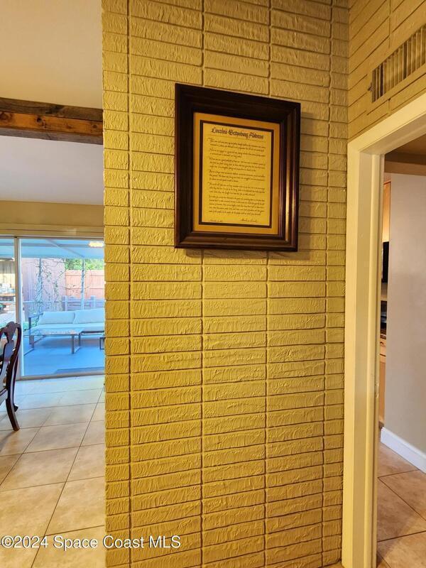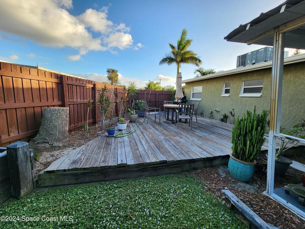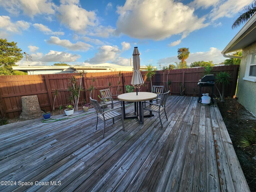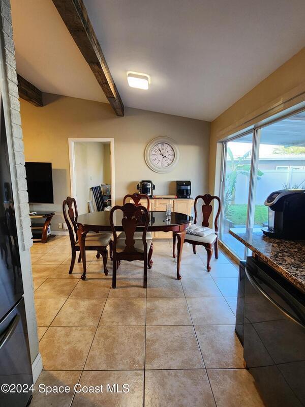 Come check out this beautiful Merritt Island home in a great location! This home sits on a corner lot with a fenced in beautifully customized and exotic backyard. The back yard has a beautiful pagoda, an opened concept storage shed, elevated deck, and meticulous landscaping. The interior boasts an open concept with vaulted ceilings in the main living area. Tiled floors throughout the home with painted brick access walls. The kitchen features granted counter tops, updated cabinets, and the second bath has an updated vanity with double sinks and gives more living space to the home.