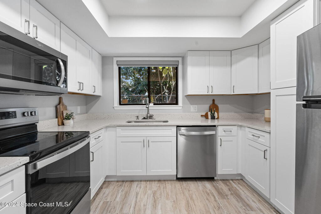 Don't miss out on this one! Come and see this gorgeous end unit that was fully remodeled in 2023! All NEW windows, plantation shutters in 2024! A stunning kitchen w/ stainless-steel appliances, quarts counter tops, soft close drawers. New roof and AC in 2023! This special condo feels like a townhouse with a vaulted ceiling, fire place and large windows to let in plenty of natural light giving the home a more modern feel. Upstairs you'll find two bedrooms, each with their own en-suite bathroom. Spacious master suite that includes a large walk-in closet and two small balconies to sit & relax. Backyard offers a small patio slab, perfect for relaxing outside. 1 car attached garage with guest parking available. Embrace this low-maintenance lifestyle with access to community amenities include community pool and clubhouse. Minutes from 1-95, local shopping & dining